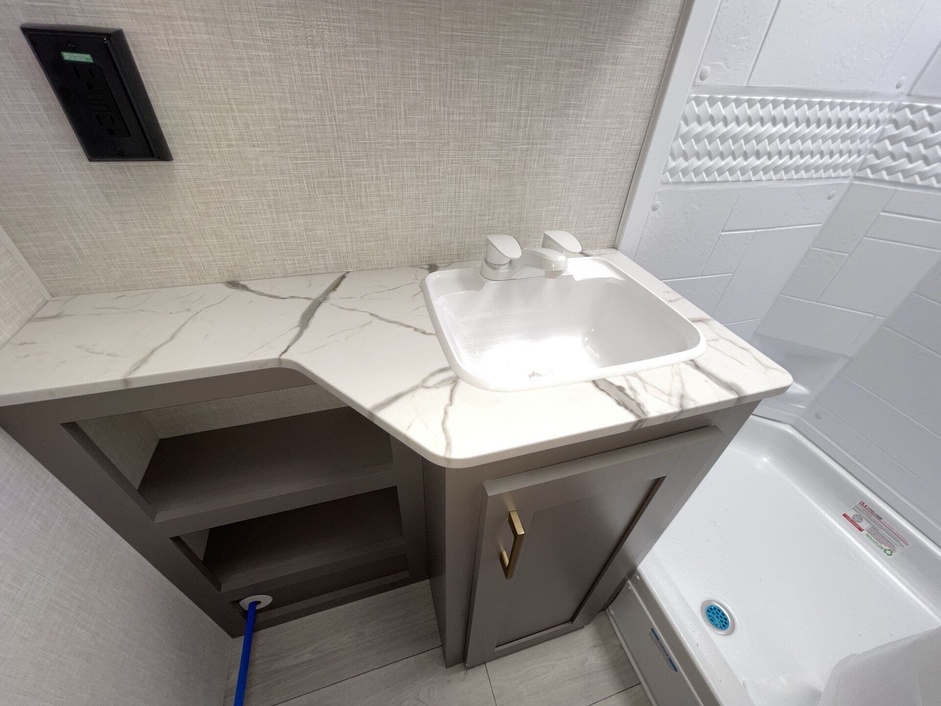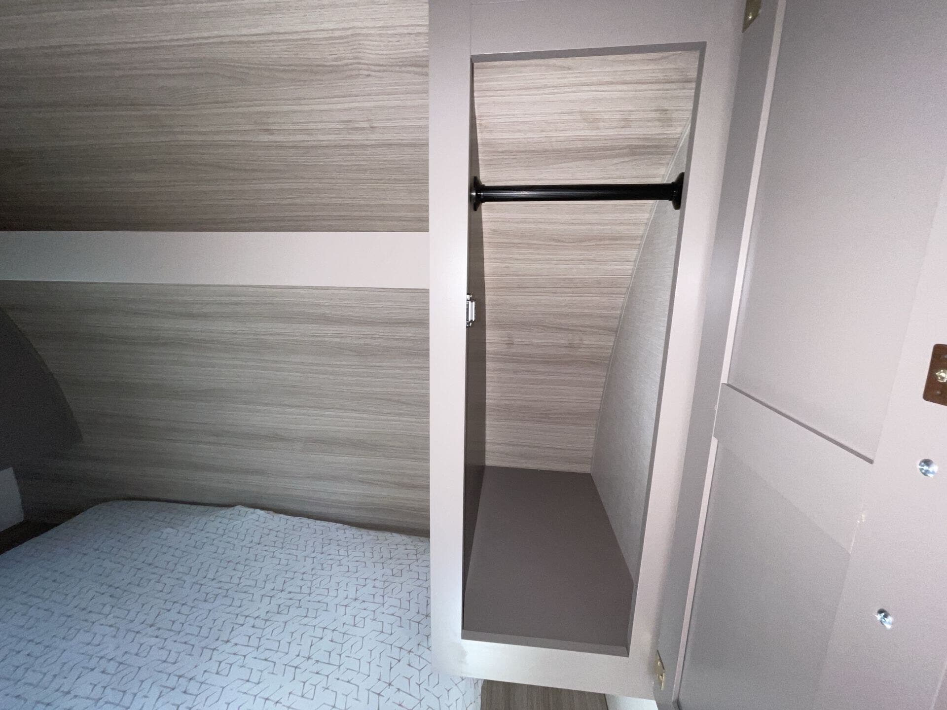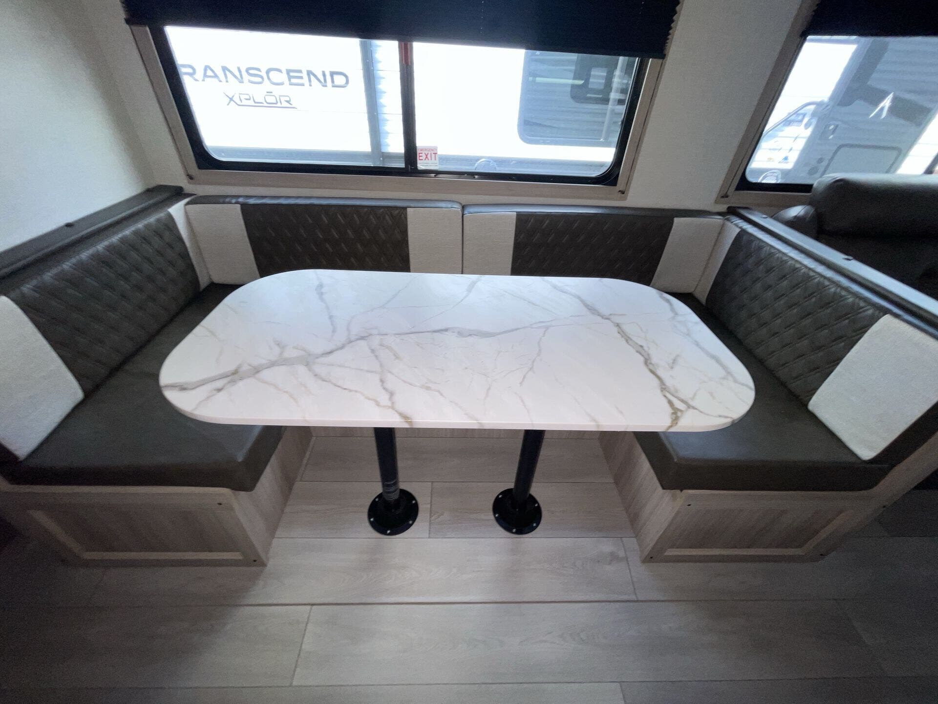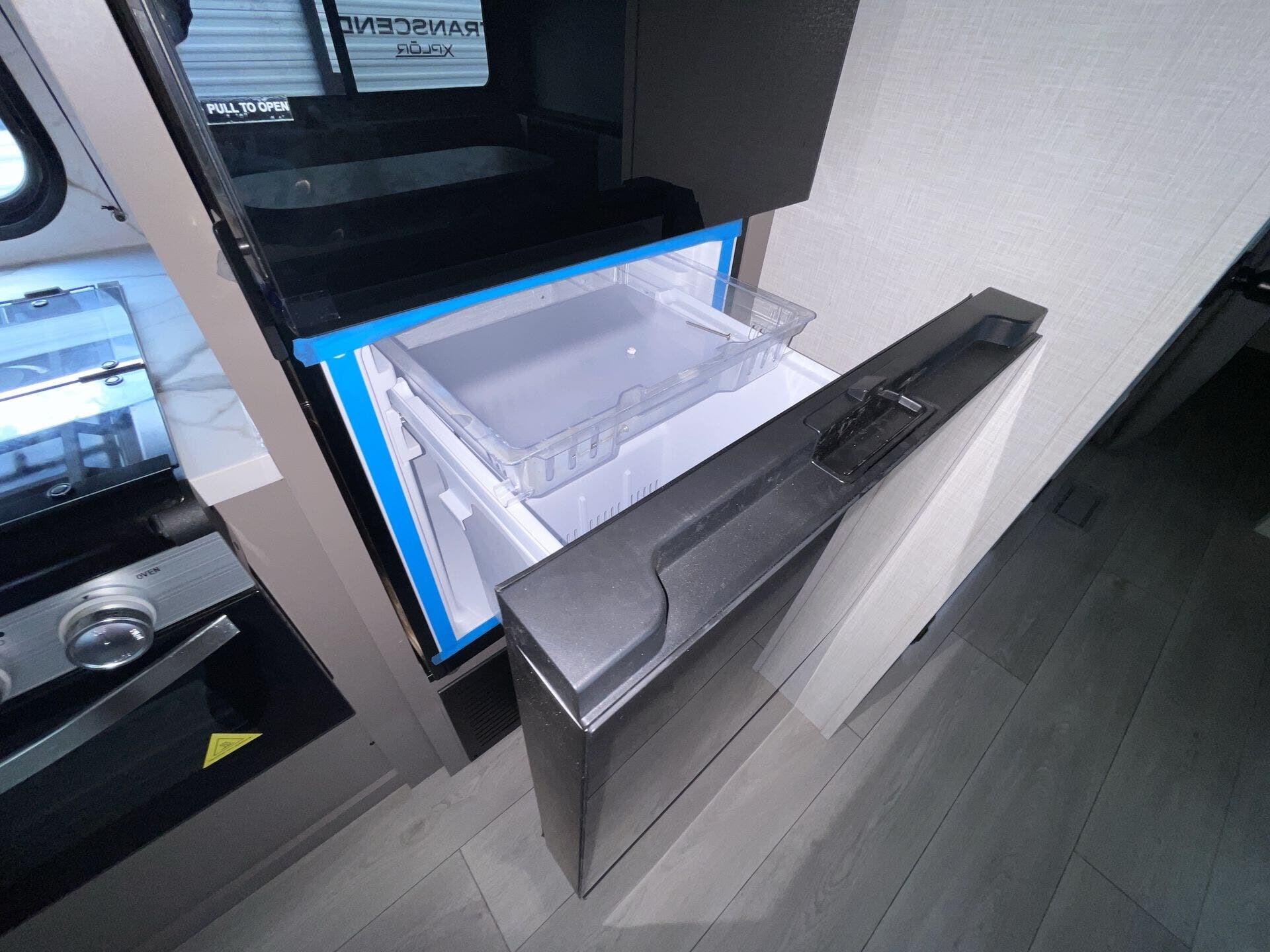 Inside, the 301BHK features a well-thought-out floorplan that maximizes space and comfort. The rear bunkhouse offers multiple bunks for kids or guests, providing a private sleeping area, while the front master bedroom includes a queen bed and ample wardrobe storage. The central living area is highlighted by a large slide-out with theater seating, a U-shaped dinette, and an entertainment center—perfect for relaxing, dining, or enjoying movie nights on the road. The fully equipped kitchen features stainless steel appliances, solid-surface countertops, and a spacious pantry, making meal prep easy and enjoyable.