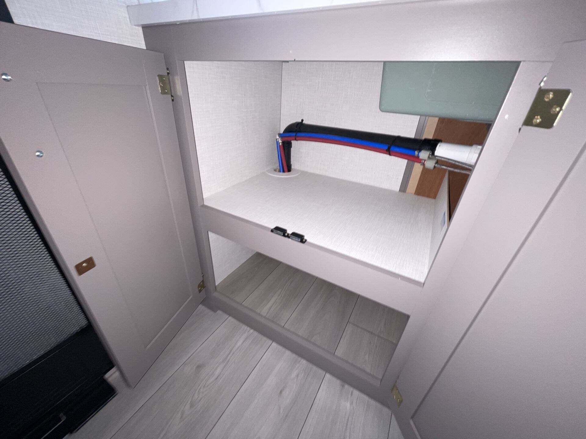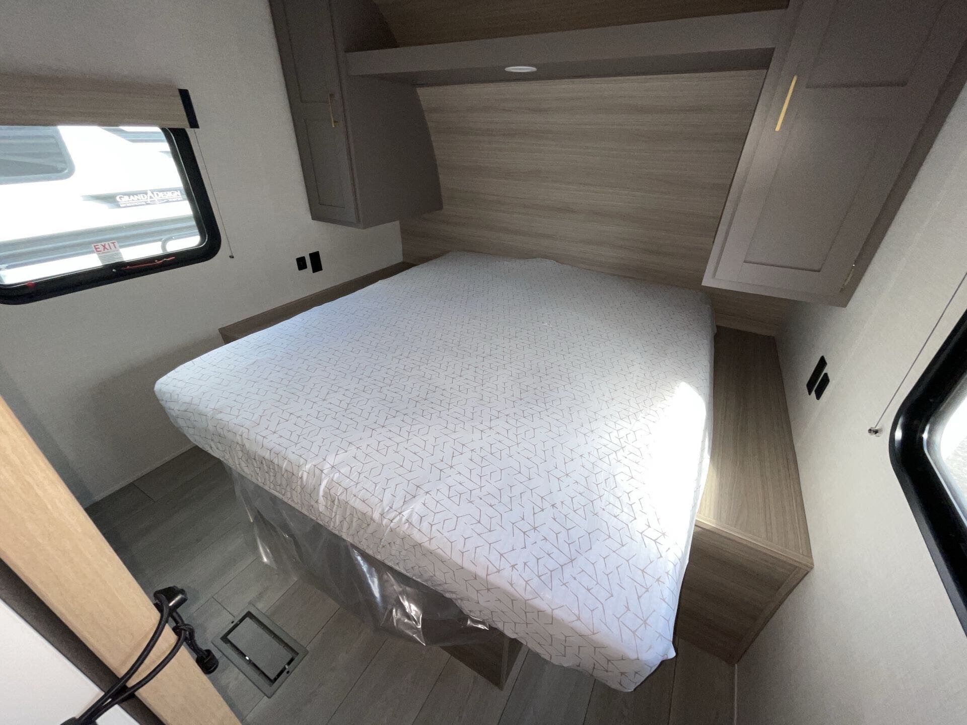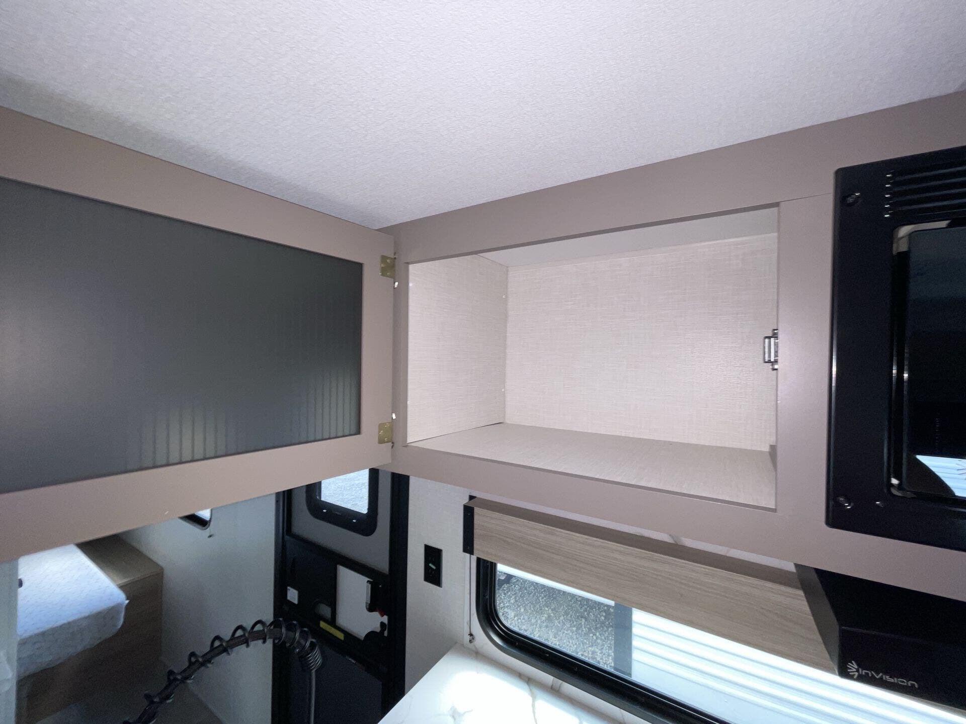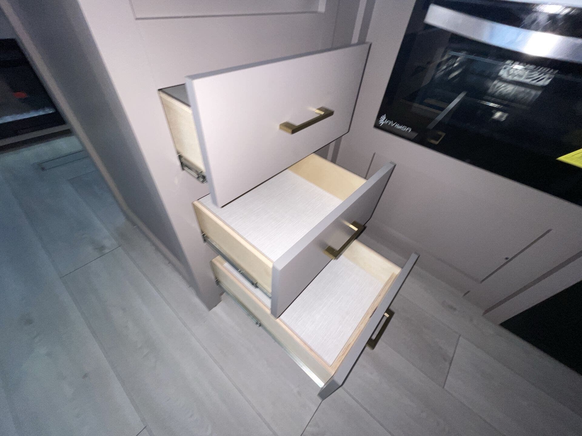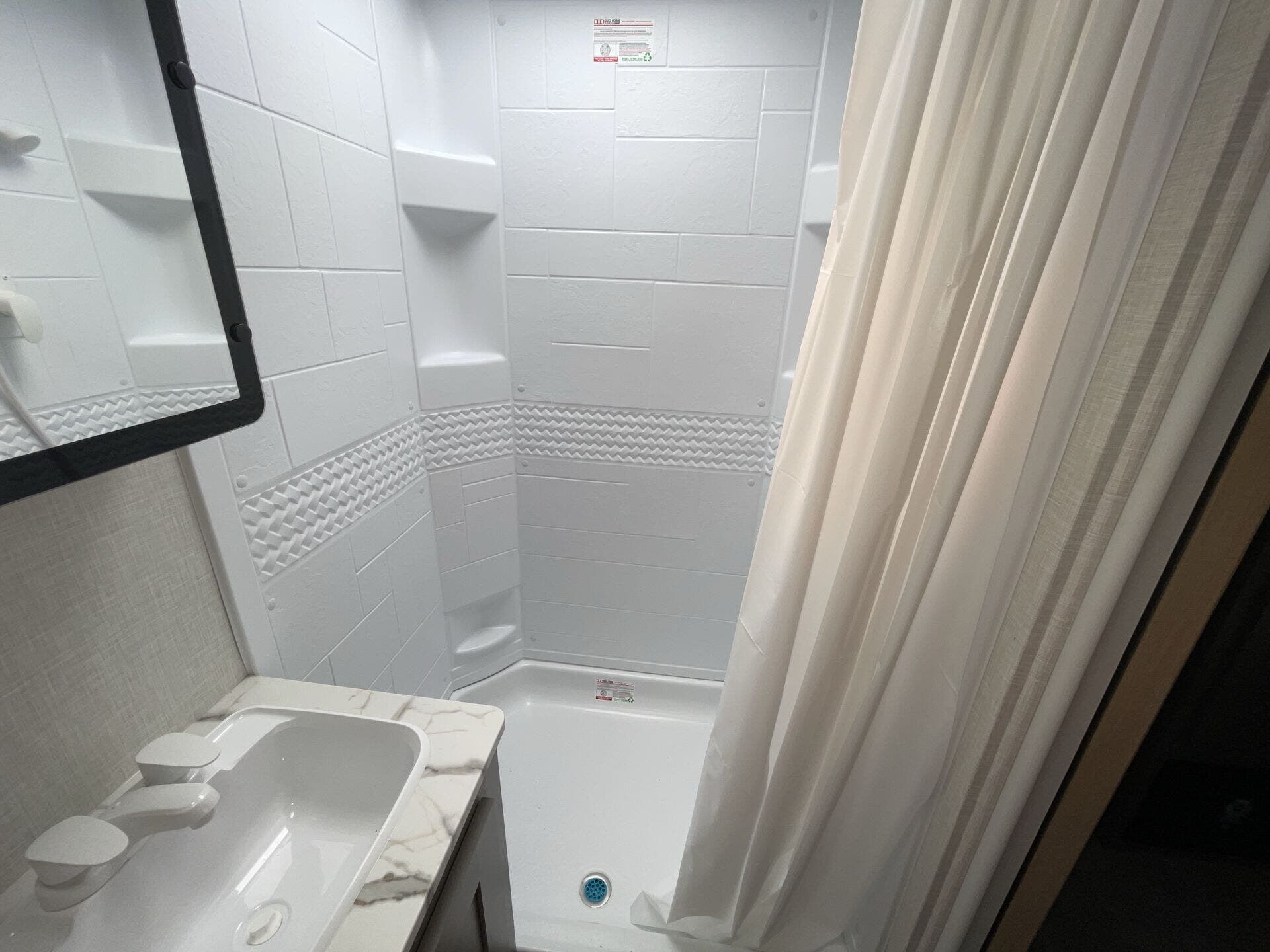 Inside, the 301BHK features a well-thought-out floorplan that maximizes space and comfort. The rear bunkhouse offers multiple bunks for kids or guests, providing a private sleeping area, while the front master bedroom includes a queen bed and ample wardrobe storage. The central living area is highlighted by a large slide-out with theater seating, a U-shaped dinette, and an entertainment center—perfect for relaxing, dining, or enjoying movie nights on the road. The fully equipped kitchen features stainless steel appliances, solid-surface countertops, and a spacious pantry, making meal prep easy and enjoyable.