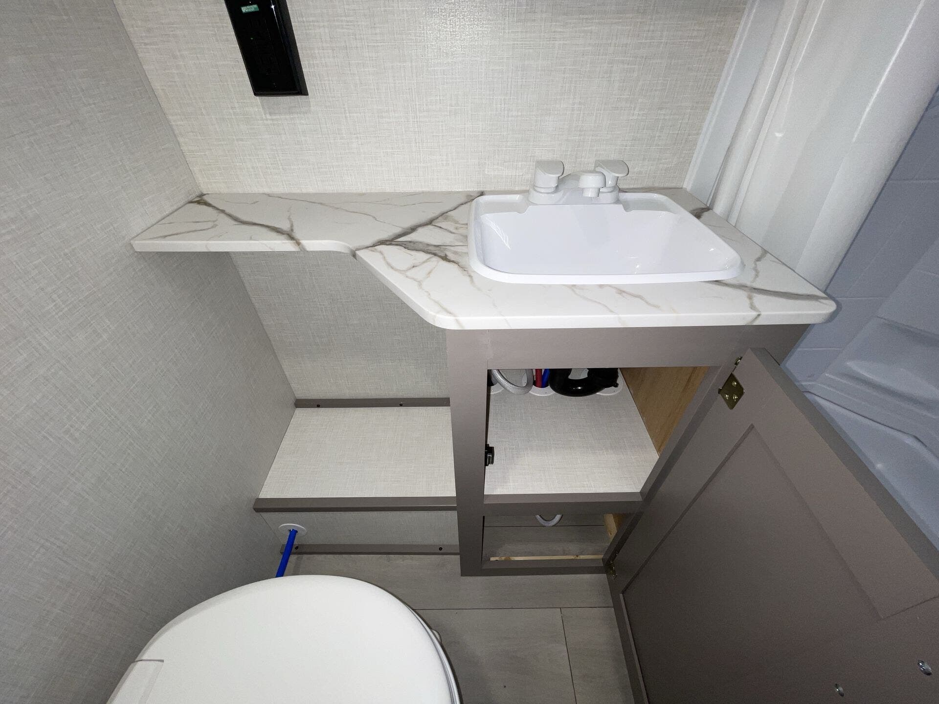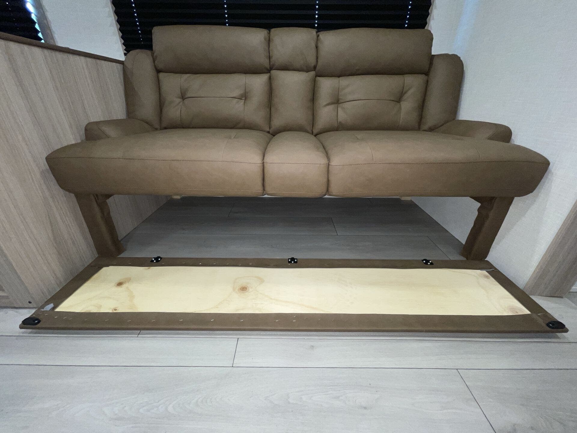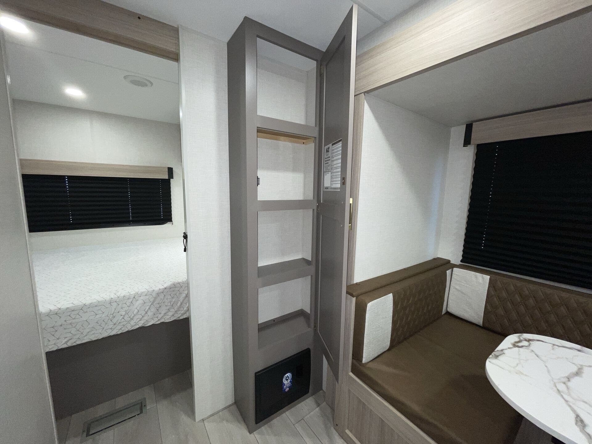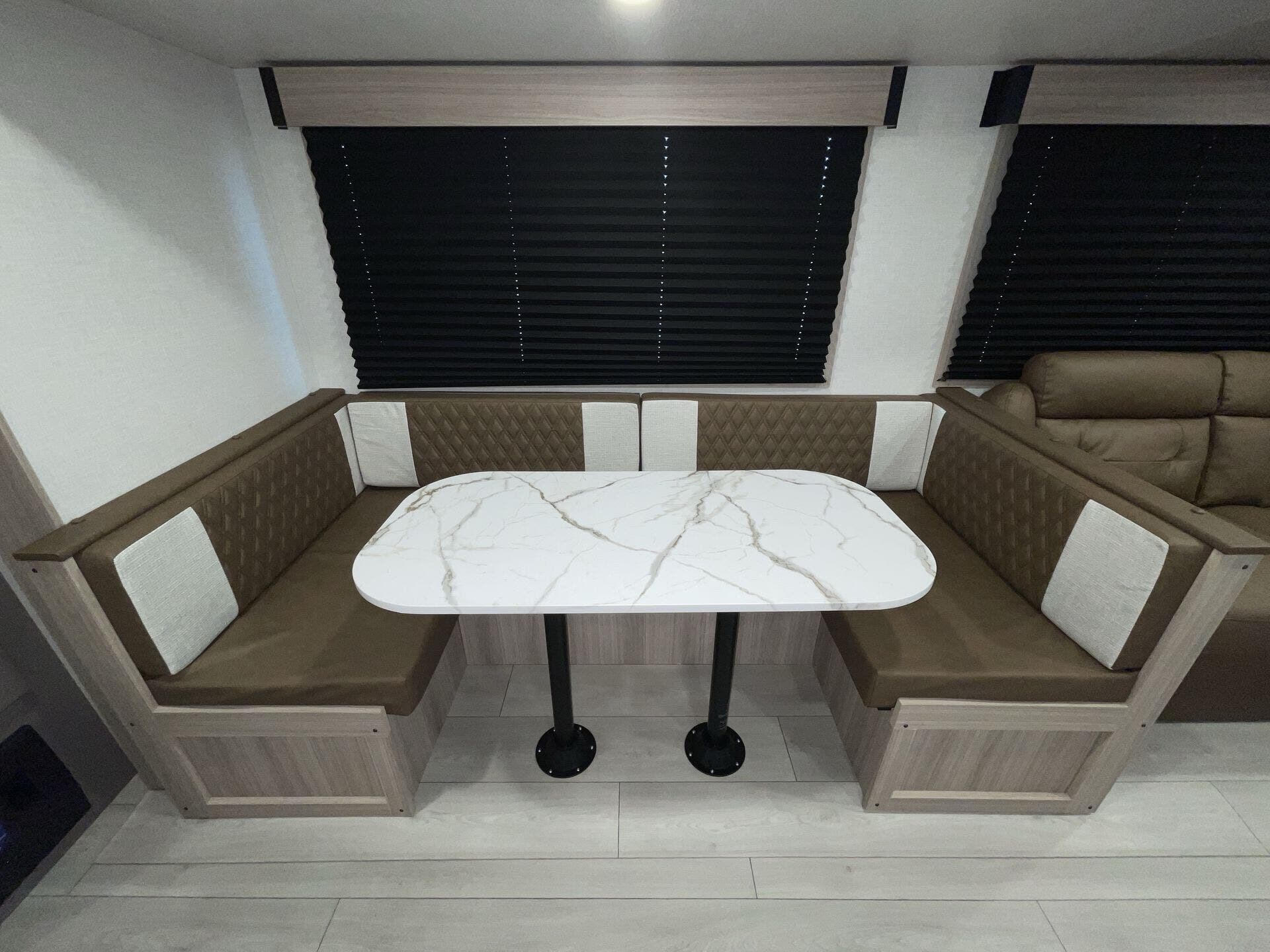 Booth Dinette, Dinette Bed, Fireplace, Kitchen Sink, Medicine Cabinet, Overhead Cabinetry, Pantry, Queen Bed, Removable Table, Roof Vents, Shower, Sofa Bed, Toilet, U-Shaped Dinette, Wardrobe(s)