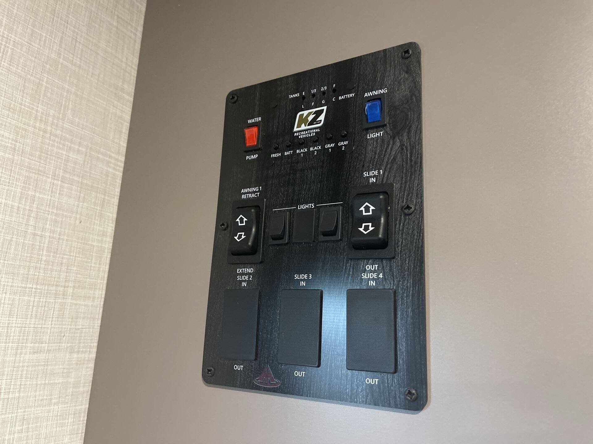 Awning, Detachable Power Cord, Leveling Jacks, Pass Thru Storage, Power Awning, Roof Vent, Screen Door, Skylight, Slideout, Spare Tire Kit -