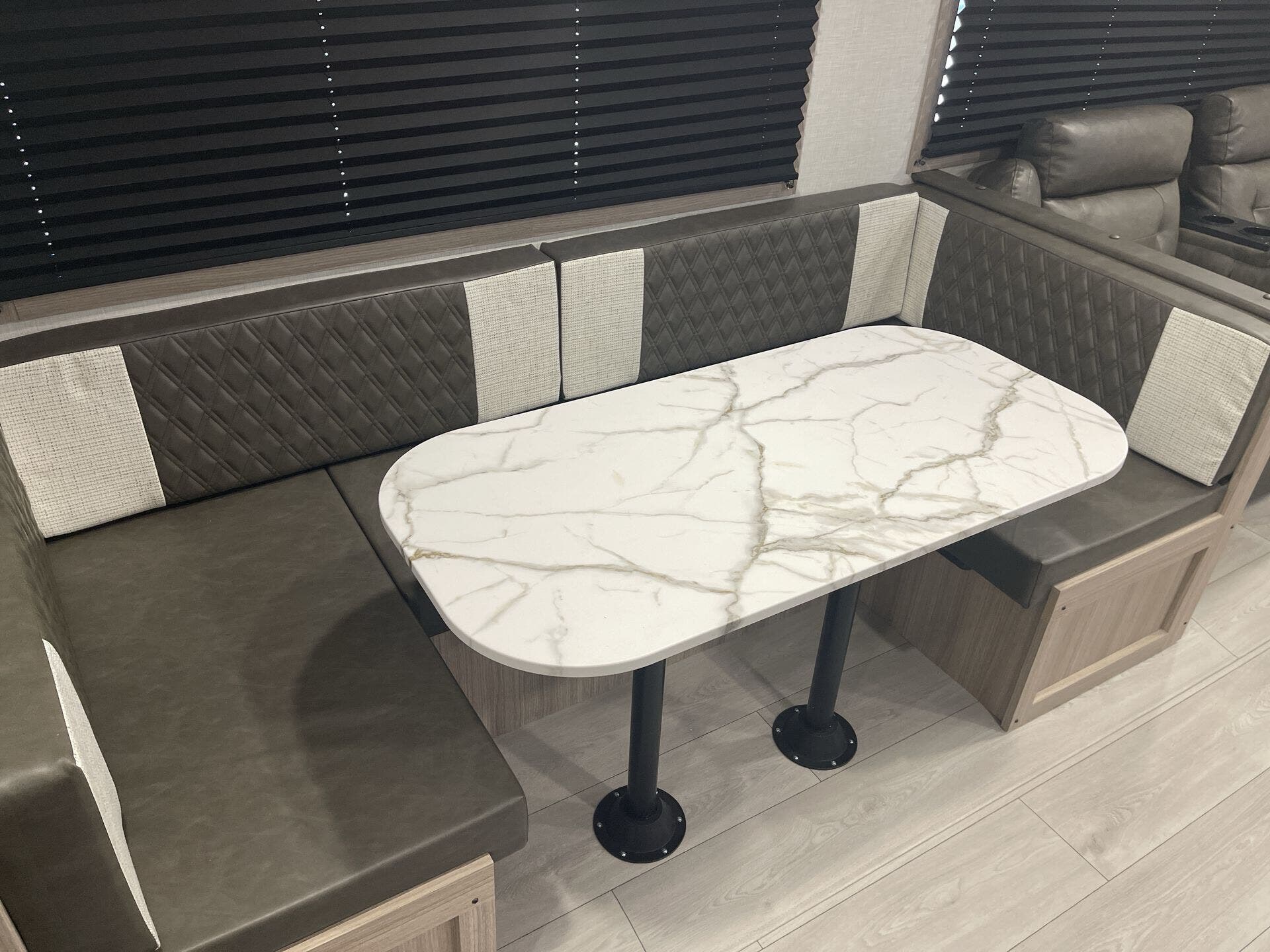 Booth Dinette, Dinette Bed, Fireplace, Kitchen Sink, Medicine Cabinet, Overhead Cabinetry, Pantry, Queen Bed, Removable Table, Roof Vents, Shower, Sofa Bed, Toilet, U-Shaped Dinette, Wardrobe(s)