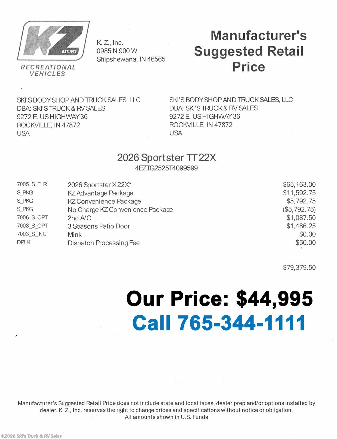Request More Info on this 2026 K-Z Sportster X 22X Offered for sale by Ski's Truck & RV Sales