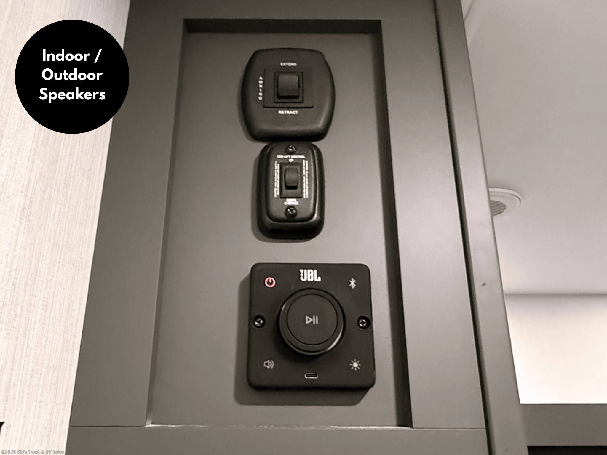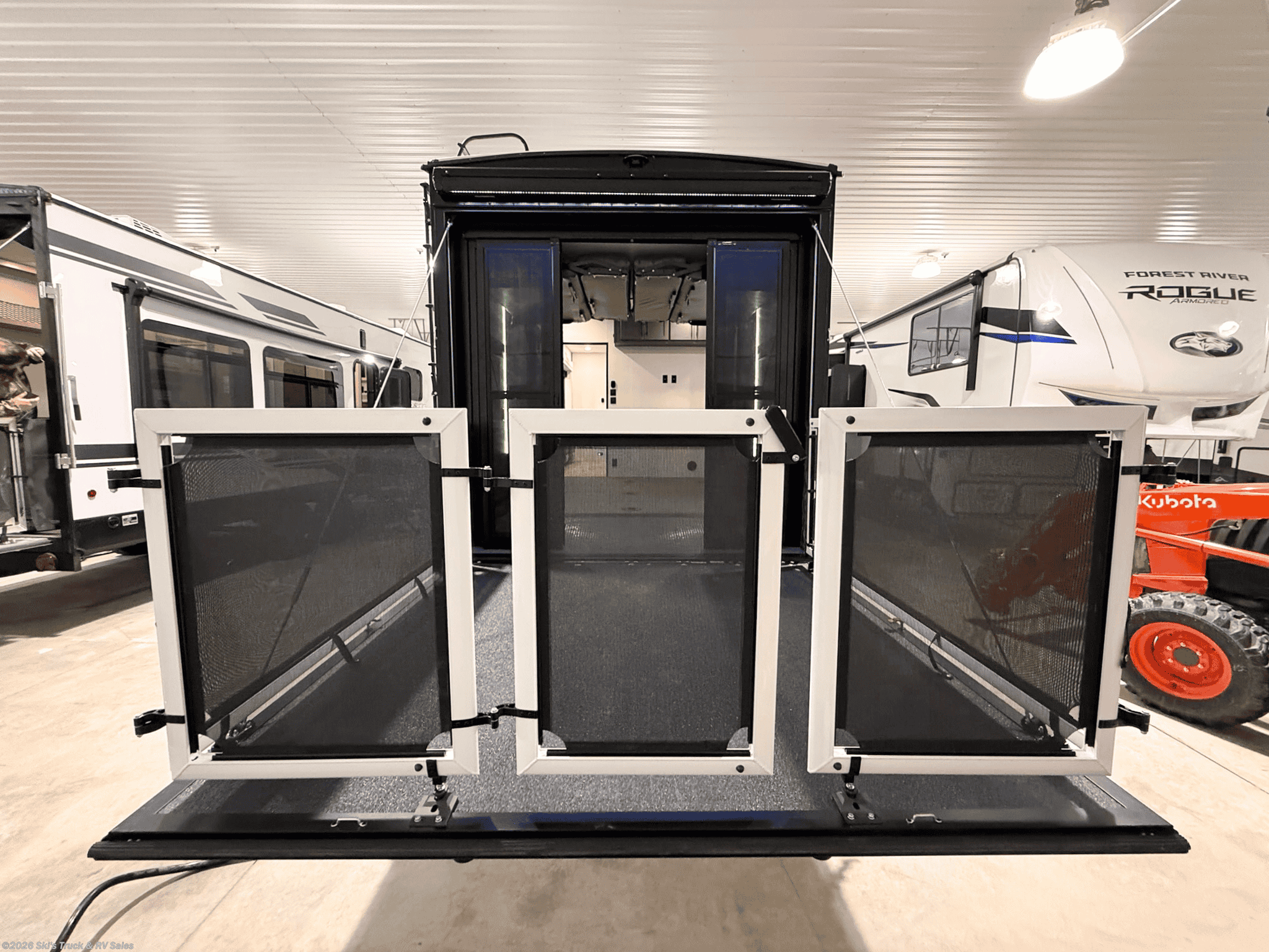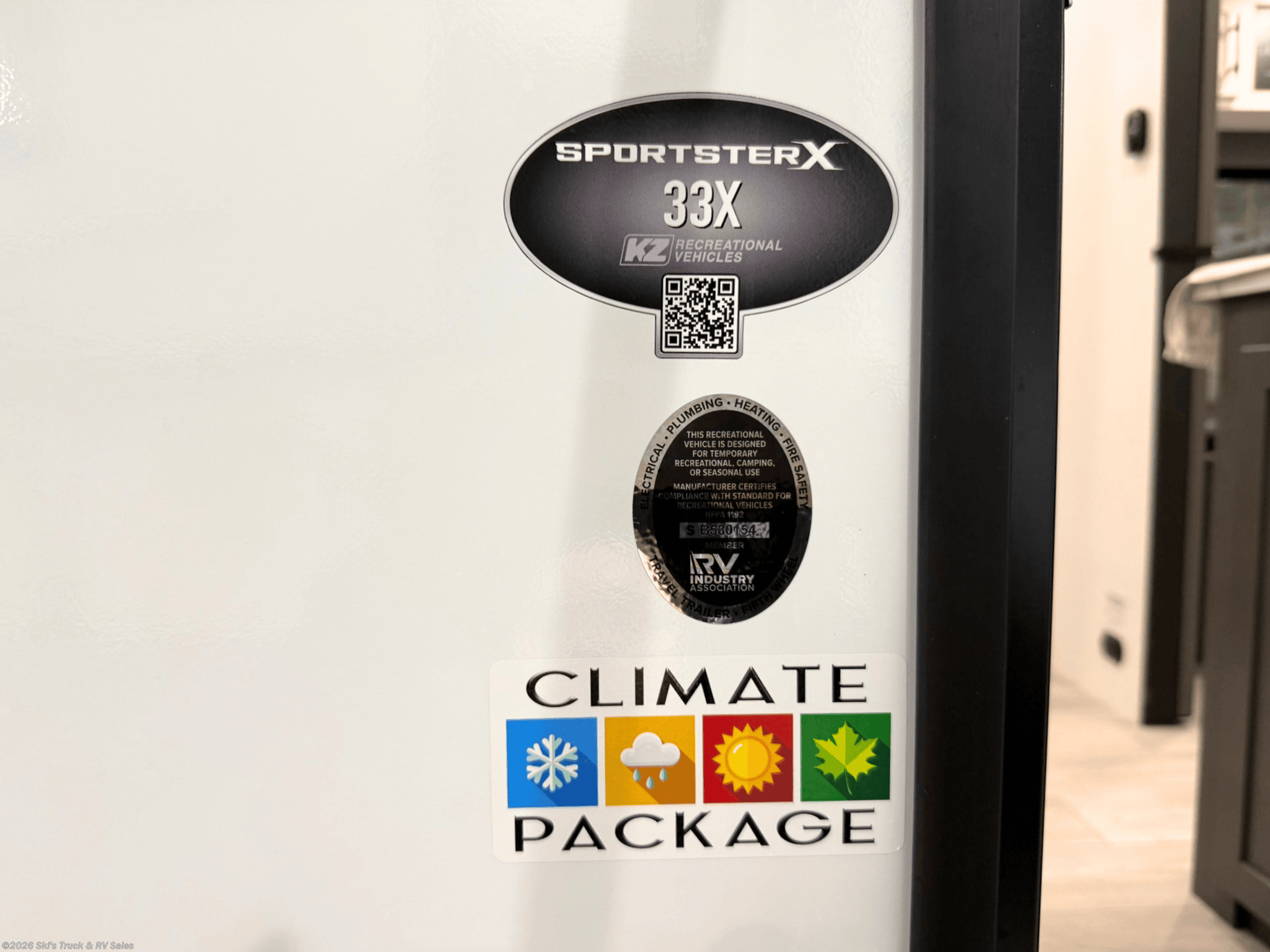 2026 KZ Sportster X 33X Travel Trailer Toy Hauler; 35 Foot; Sleeps 6; Large Garage Area: 13 Ft. w/9 Floor Tie-Downs and 3 Season Patio Doors; Hitch Weight: 1,720 Lbs.; Dry Weight: 10,210 Lbs.; 50 Amp; Auto Leveling; 94 Gal. Fresh Water Cap.; 40 Gal. Black Water Cap.; 64 Gal. Gray Water Cap.; Two 20 Lbs. Propane Tanks; Two A/C: 15,000 BTU / 13,500 BTU; 30,000 BTU Furnace; 10 C.F. (12V) Refrigerator; On Demand Tankless Water Heater; Microwave; 3-Burner Stove/Oven; W/D Prep.; Three TV Jacks; 40 in. TV; AM/FM; Speakers; Stainless Steel Sink; Pantry; Queen Bed; Power Bed with Sit / Sleep in Garage; Theater Seats; One Bathroom with Shower; Foot Flush Toilet; 20 Ft. Power Awning with LED Lights; 8 Ft. Power Awning with LED Lights on Party Deck; Backup Camera Prep.; Solar Package; Outside Shower; Outside Kitchen with Griddle; Exterior Storage; Foldup Steps; Grab Handle; Leash Latch; Battery Disconnect; Black Tank Flush; Climate Package; Azdel Sidewalls; 5500 Watt Generator; 30 Gal. Fuel Station; Tinted Windows; Roller Shades; Aluminum Wheels; Spare Tire; Two Year Limited Warranty; Financing Available; Nice Travel Trailer Toy Hauler for the Price: $54,995. Call Skis Truck & RV Sales at 765-344-1111 or visit us at for more information.