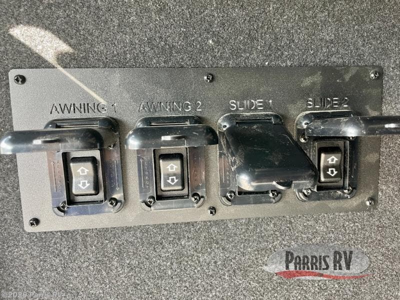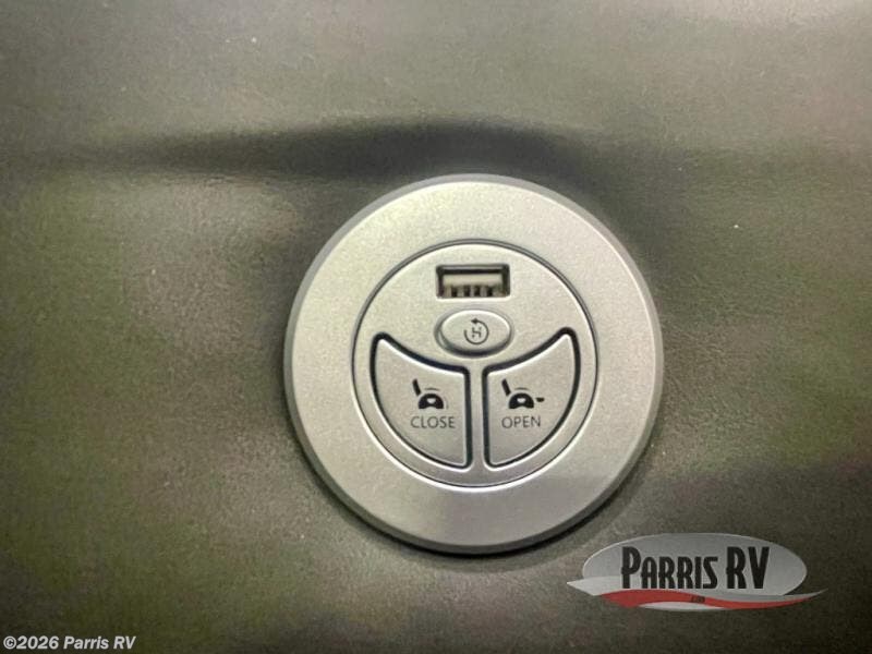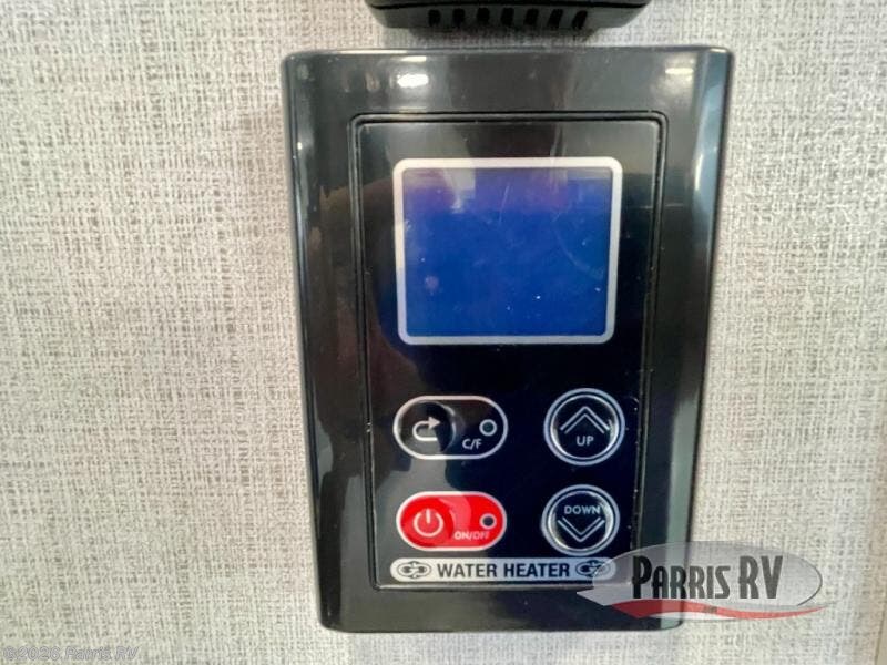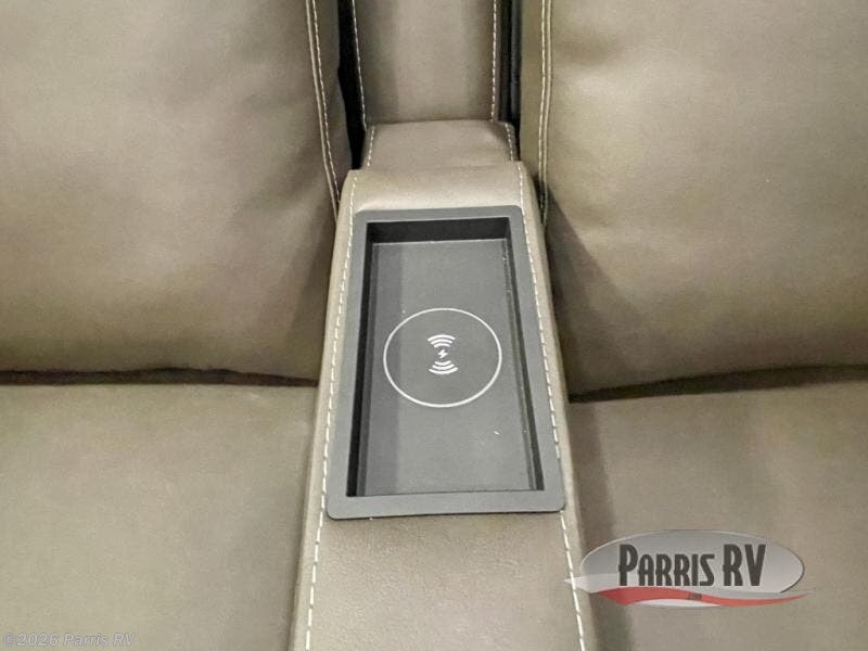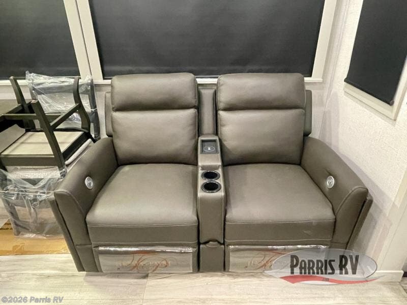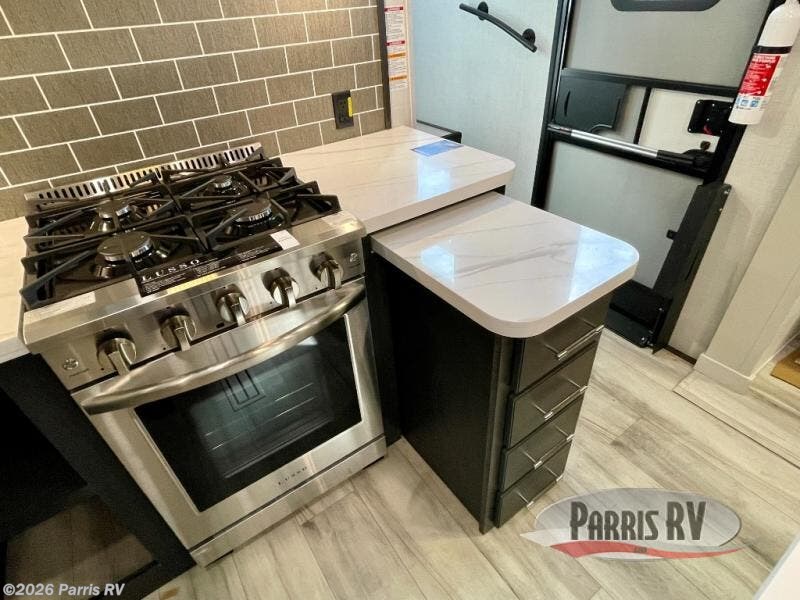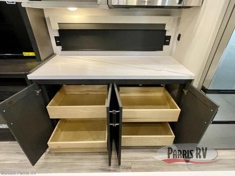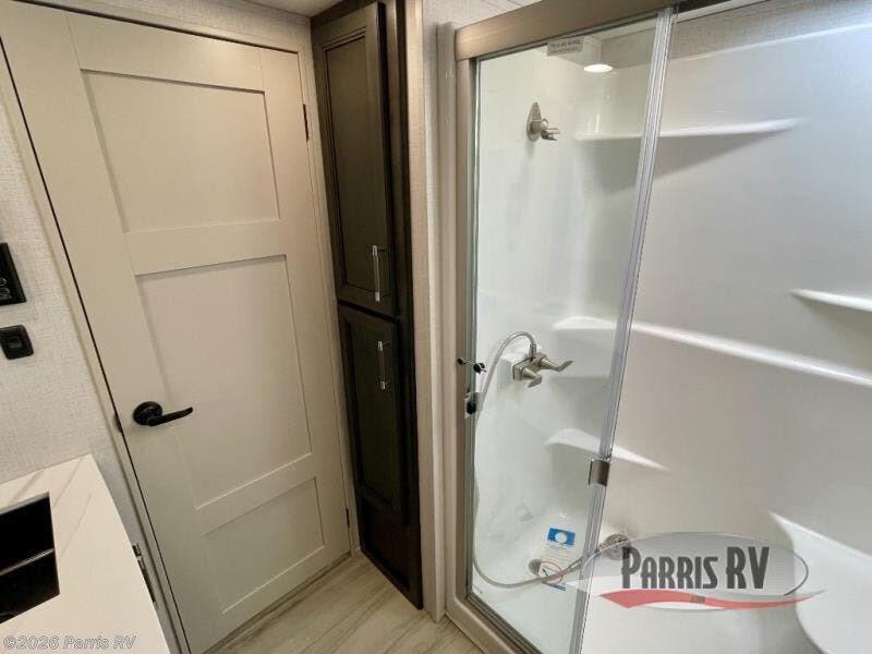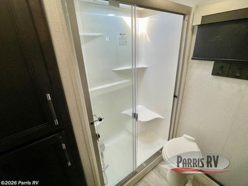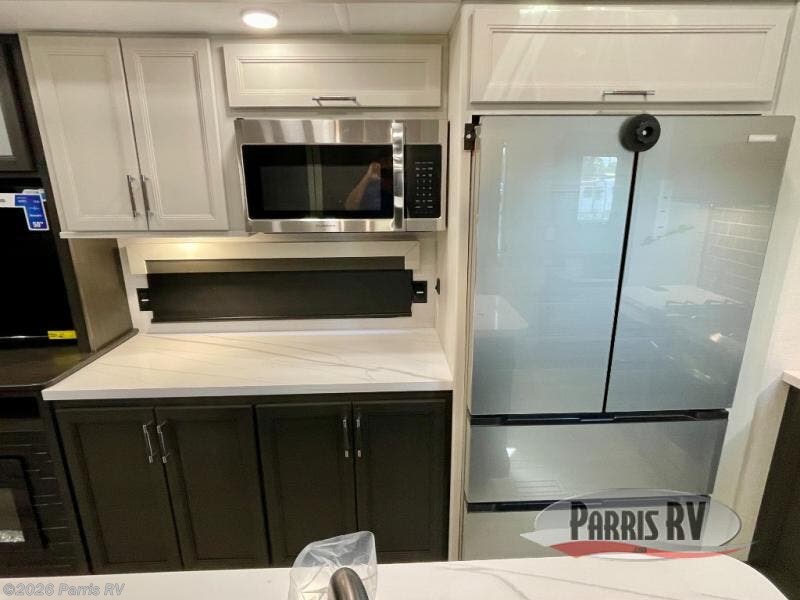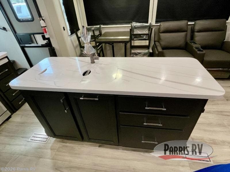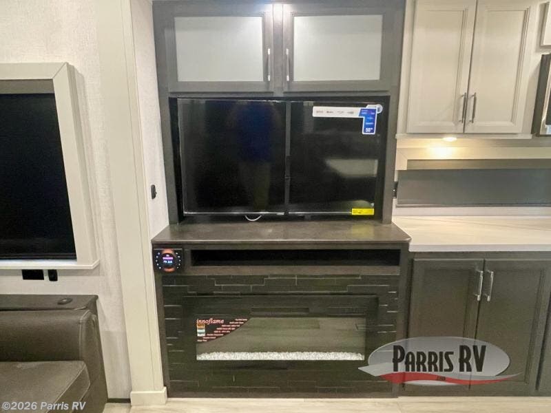 You will feel right at home camping in this fifth wheel! The chef will have lots of countertop space to prepare their best meals along with a kitchen island, two pull-out pantries to store your dishes, and an 18 cu. ft. residential refrigerator to store any leftovers. The free standing dinette offers a comfortable place to enjoy your meals, and the theater seating across from the fireplace and entertainment center will be perfect for movie nights. There is also a rear hide-a-bed sofa sleeper for any guests you may have. You will love the full bath that includes a shower with a seat, a linen closet, plus two bath sinks for convenience. And don't overlook the front bedroom with a sliding door, king bed slide out, and master closet for all your things. You'll also find stackable washer and dryer prep, two drawers, and a Smart HDTV for movies in bed.