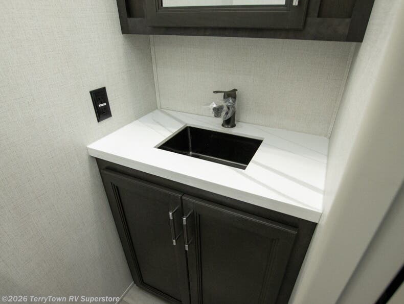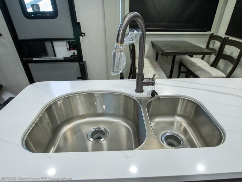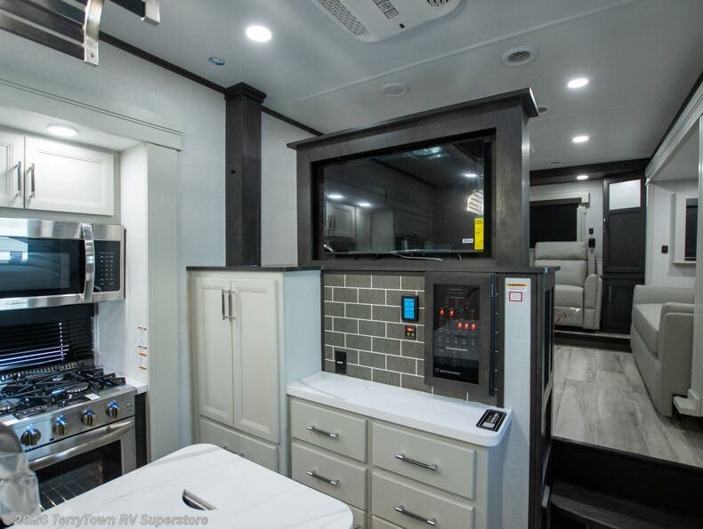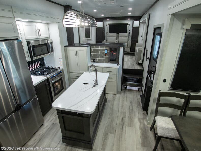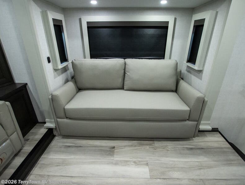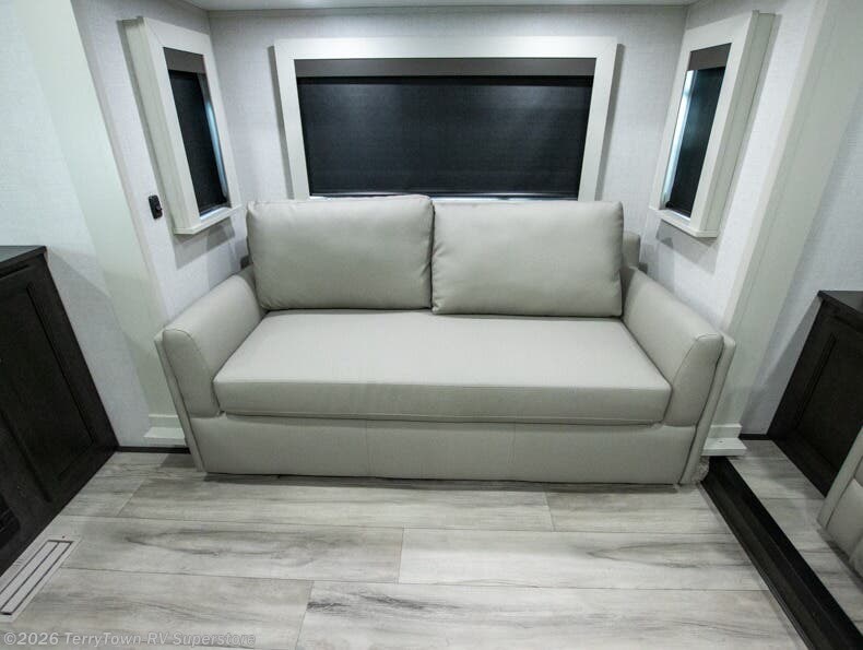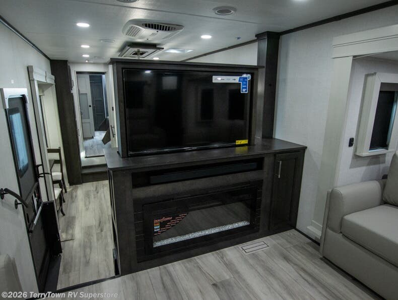 Find the comfort and luxury in this fifth wheel! Imagine your morning coffee on the spacious middle kitchen, and prepping your favorite breakfast on your kitchen island with a sink, making for a good meal-prep zone for endless cooking possibilities. You can start your favorite movie queued up in the living room with dual hide-a-bed sofas and a fireplace that sets the mood for comfort and delight every day. When it is time to unwind, your private rear bedroom welcomes you with a king bed, smart storage, and soft lighting that turns travel into rest, featuring a master bathroom with all you need to freshen up and treat yourself with plenty of storage, a dual sink vanity, and space for a washer/dryer prep for your convenience.