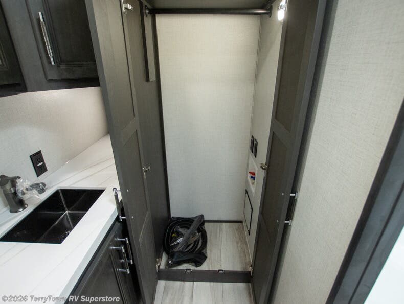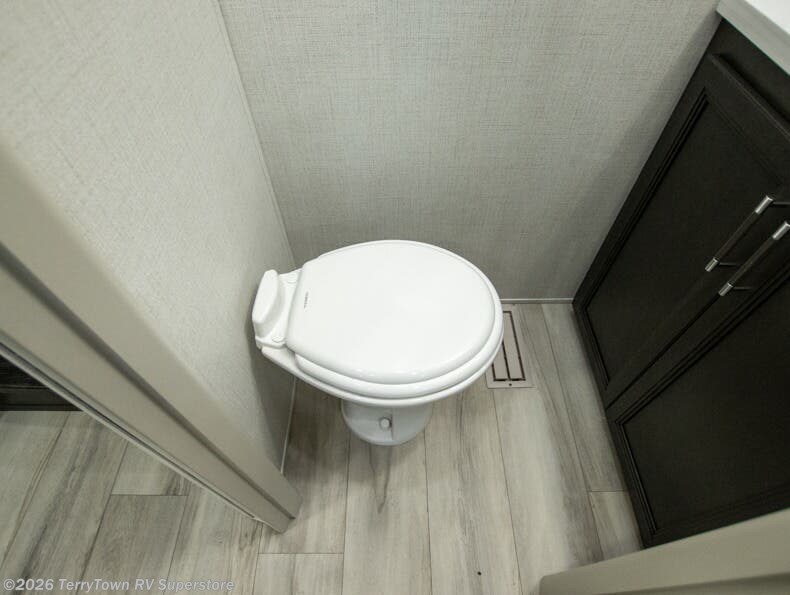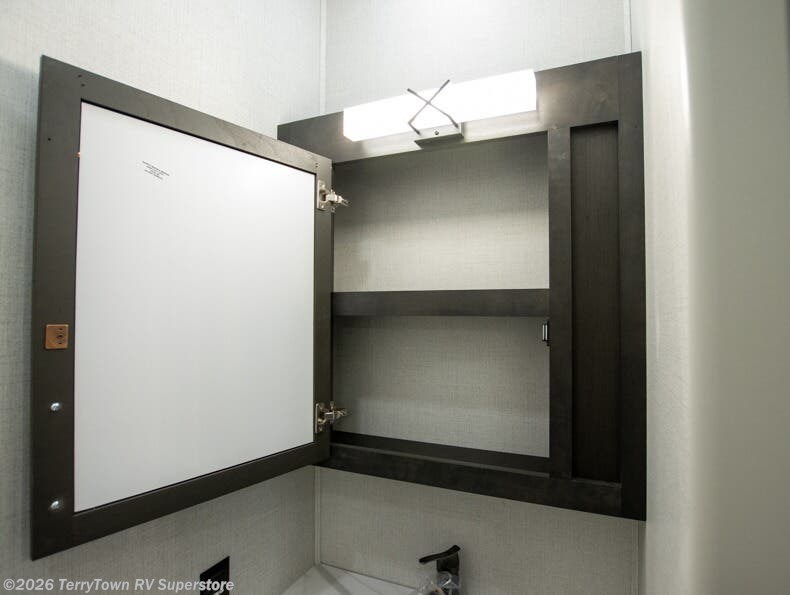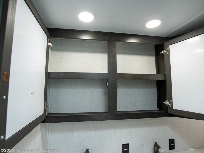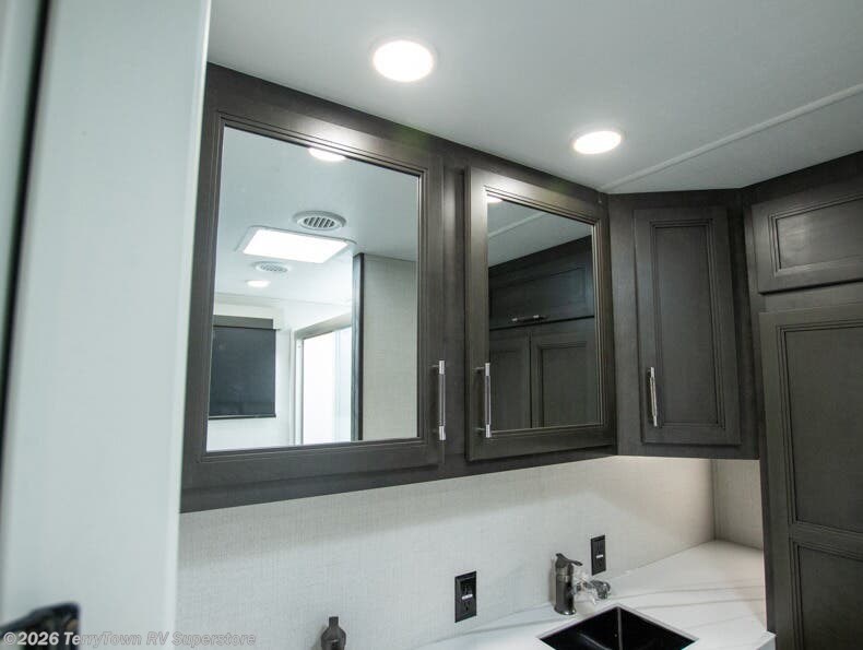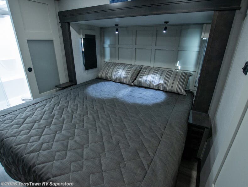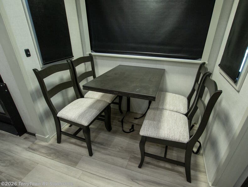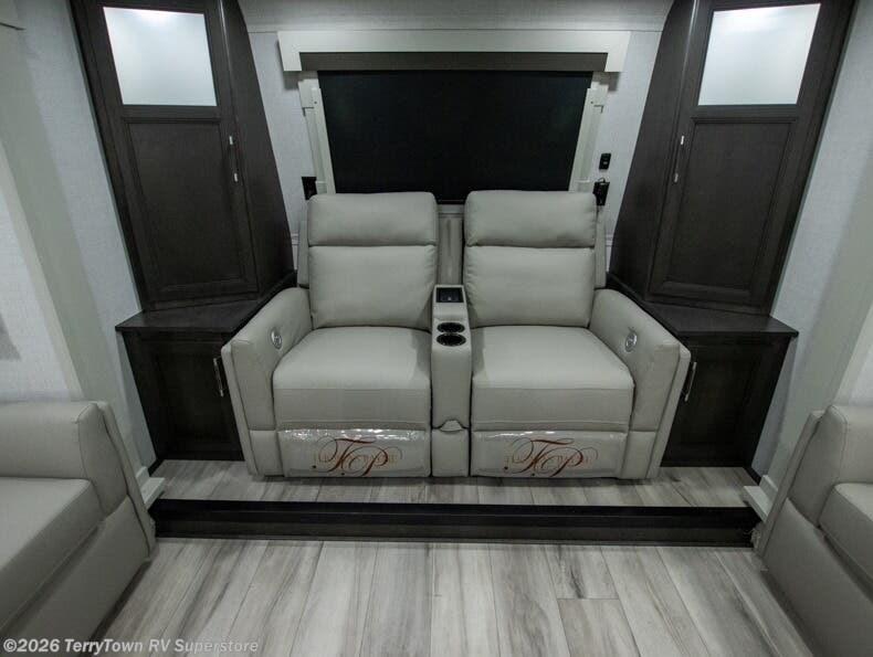 Find the comfort and luxury in this fifth wheel! Imagine your morning coffee on the spacious middle kitchen, and prepping your favorite breakfast on your kitchen island with a sink, making for a good meal-prep zone for endless cooking possibilities. You can start your favorite movie queued up in the living room with dual hide-a-bed sofas and a fireplace that sets the mood for comfort and delight every day. When it is time to unwind, your private rear bedroom welcomes you with a king bed, smart storage, and soft lighting that turns travel into rest, featuring a master bathroom with all you need to freshen up and treat yourself with plenty of storage, a dual sink vanity, and space for a washer/dryer prep for your convenience.