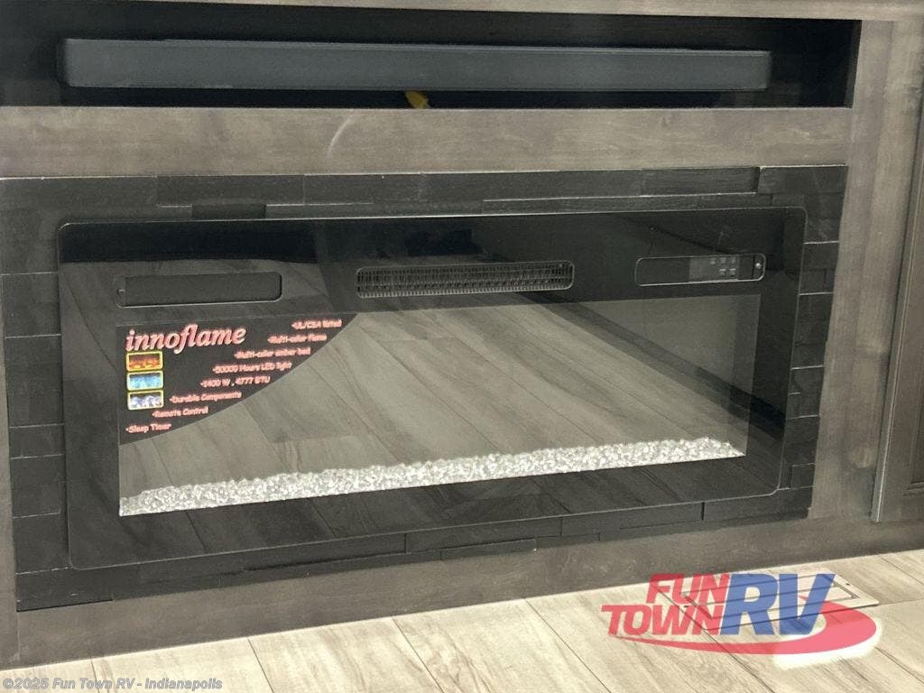 Find the comfort and luxury in this fifth wheel! Imagine your morning coffee on the spacious middle kitchen, and prepping your favorite breakfast on your kitchen island with a sink, making for a good meal-prep zone for endless cooking possibilities. You can start your favorite movie queued up in the living room with dual hide-a-bed sofas and a fireplace that sets the mood for comfort and delight every day. When it is time to unwind, your private rear bedroom welcomes you with a king bed, smart storage, and soft lighting that turns travel into rest, featuring a master bathroom with all you need to freshen up and treat yourself with plenty of storage, a dual sink vanity, and space for a washer/dryer prep for your convenience.