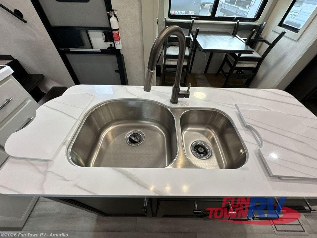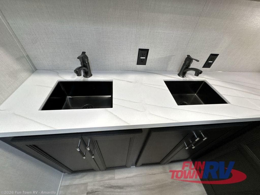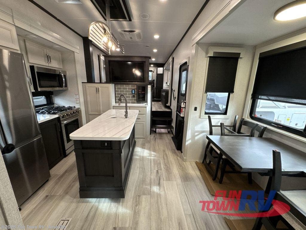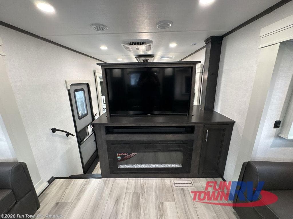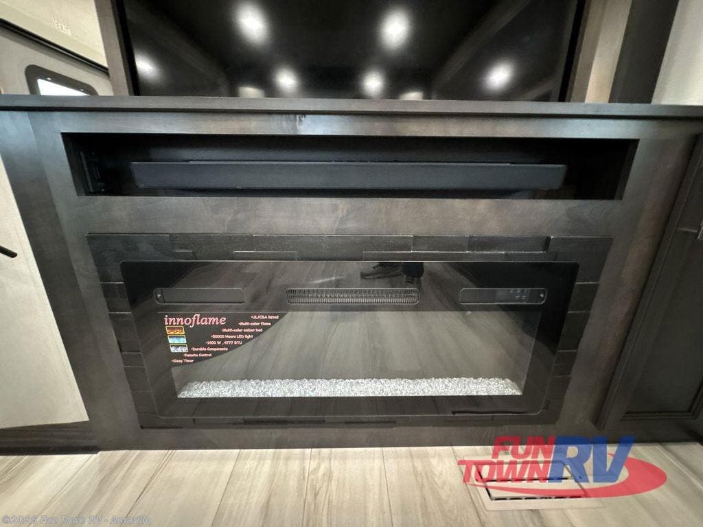 Find the comfort and luxury in this fifth wheel! Imagine your morning coffee on the spacious middle kitchen, and prepping your favorite breakfast on your kitchen island with a sink, making for a good meal-prep zone for endless cooking possibilities. You can start your favorite movie queued up in the living room with dual hide-a-bed sofas and a fireplace that sets the mood for comfort and delight every day. When it is time to unwind, your private rear bedroom welcomes you with a king bed, smart storage, and soft lighting that turns travel into rest, featuring a master bathroom with all you need to freshen up and treat yourself with plenty of storage, a dual sink vanity, and space for a washer/dryer prep for your convenience.