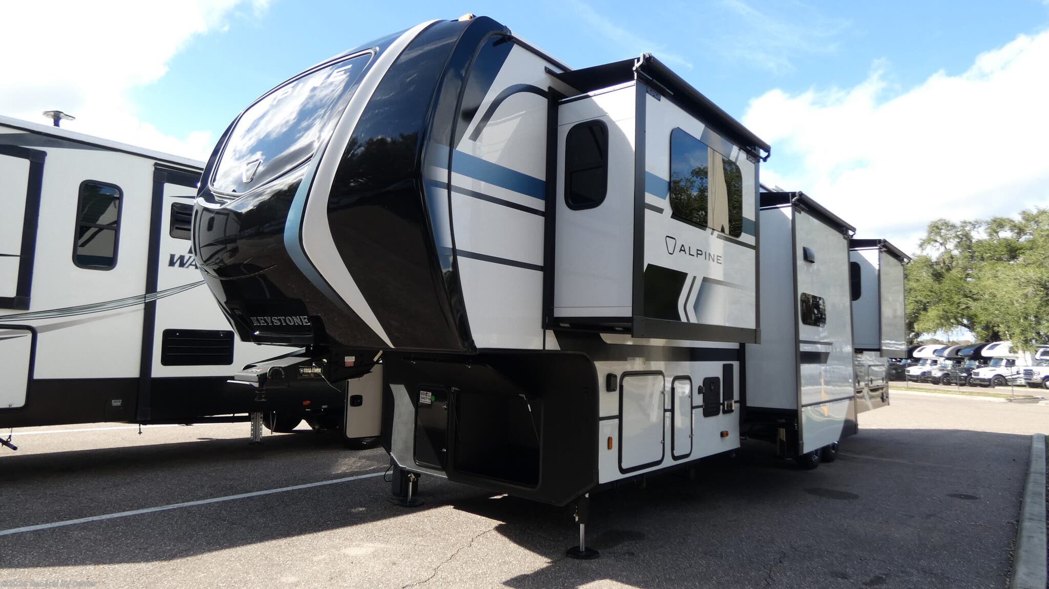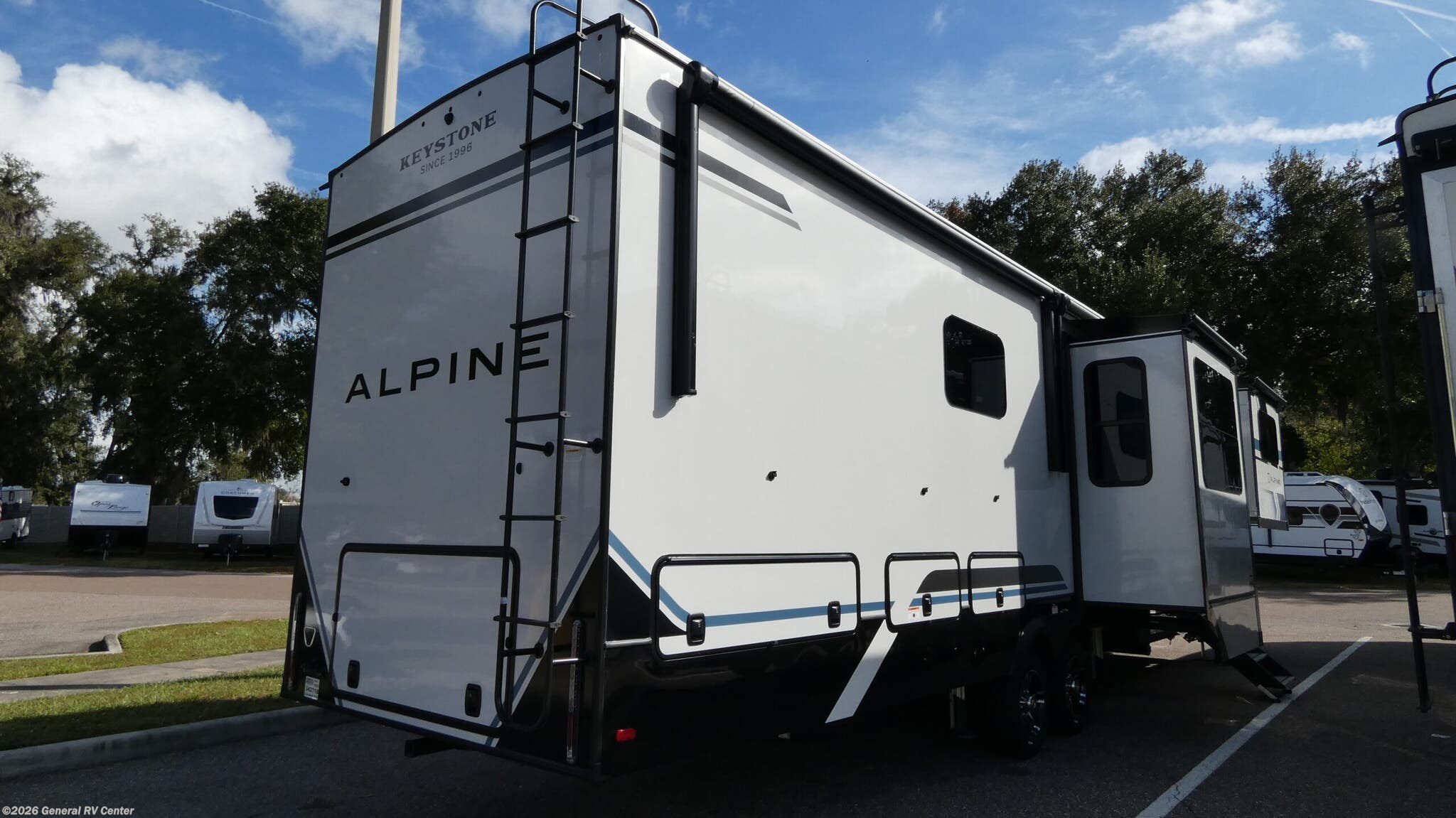**Keystone RV Alpine fifth wheel 3710FL highlights:** * Bath and a Half * Walk-In-Shower * Master Bedroom * Free Standing Dinette * Front Living Room Find the comfort and luxury in this fifth wheel! Imagine your morning coffee on the spacious middle kitchen, and prepping your favorite breakfast on your kitchen island with a sink, making for a good meal-prep zone for endless cooking possibilities. You can start your favorite movie queued up in the living room with dual hide-a-bed sofas and a fireplace that sets the mood for comfort and delight every day. When it is time to unwind, your private rear bedroom welcomes you with a king bed, smart storage, and soft lighting that turns travel into rest, featuring a master bathroom with all you need to freshen up and treat yourself with plenty of storage, a dual sink vanity, and space for a washer/dryer prep for your convenience. Luxury is not an option, it is a standard with each one of these Keystone RV Alpine fifth wheels! A 8' 4" wide body construction will create an open, residential feeling, and cutting-edge technology will provide a hassle-free camping experience. The Tru-Fit slide construction is more durable and minimizes motor structural stress, as well as resists leaking, and the Blade Pure airflow system provides residential comfort with its high-performance. Each fifth wheel includes designer flooring throughout, stunning solid wood cabinet doors, luxurious crown molding, and solid surface countertops in the kitchen. The exterior also includes an outside shower with hot and cold water, Lippert strut assisted SolidSteps, Hitch Vision with LED lighting, and many more conveniences!