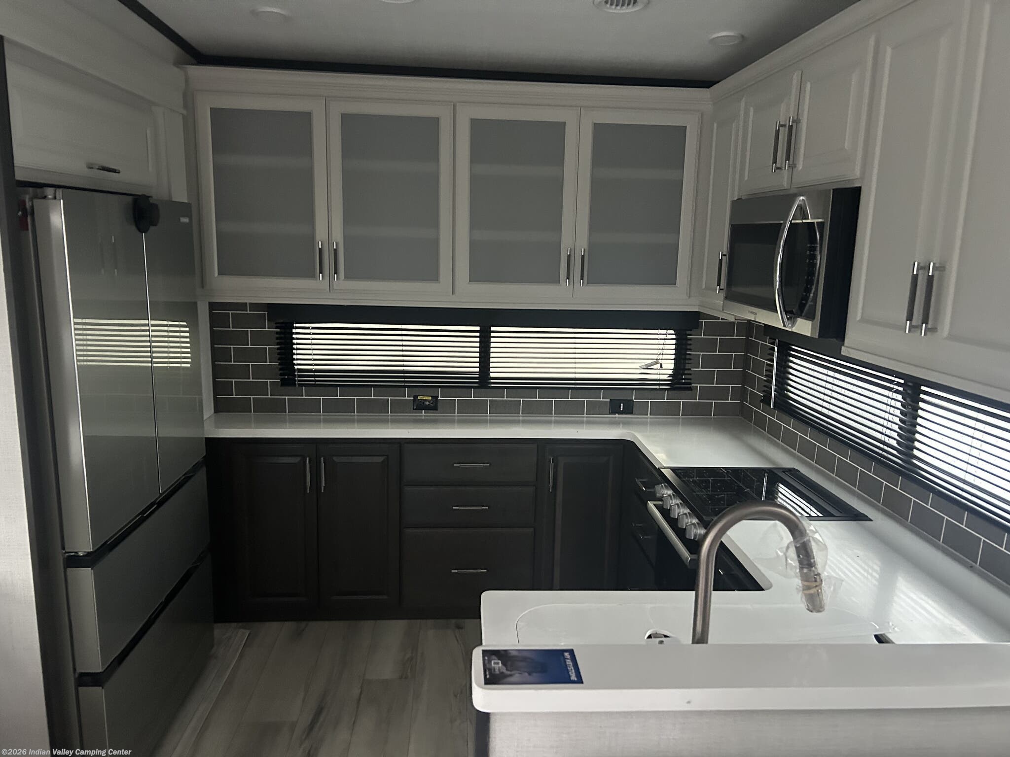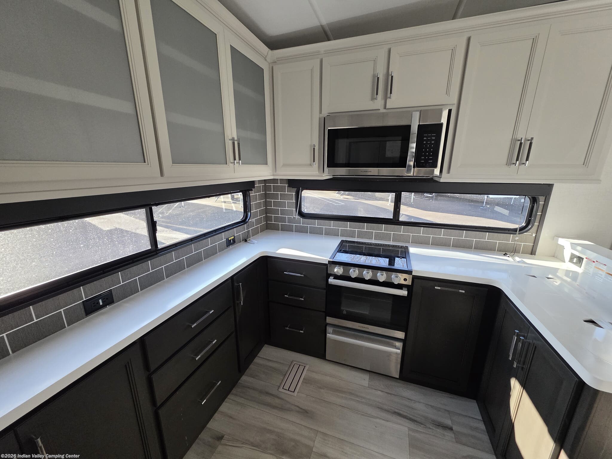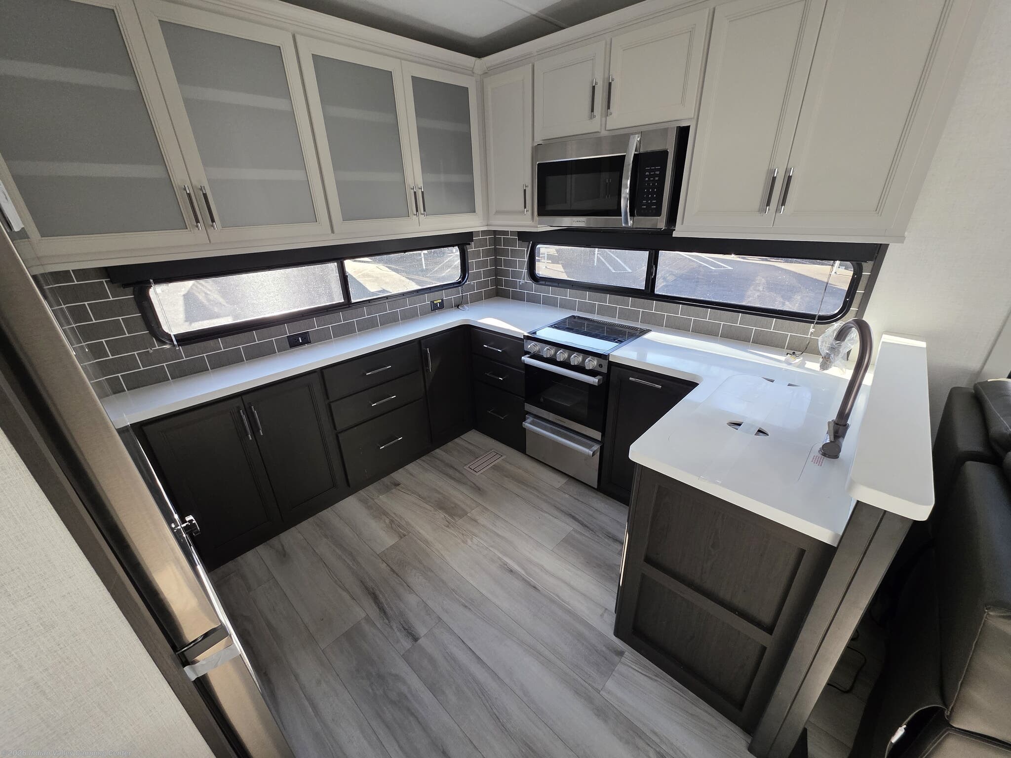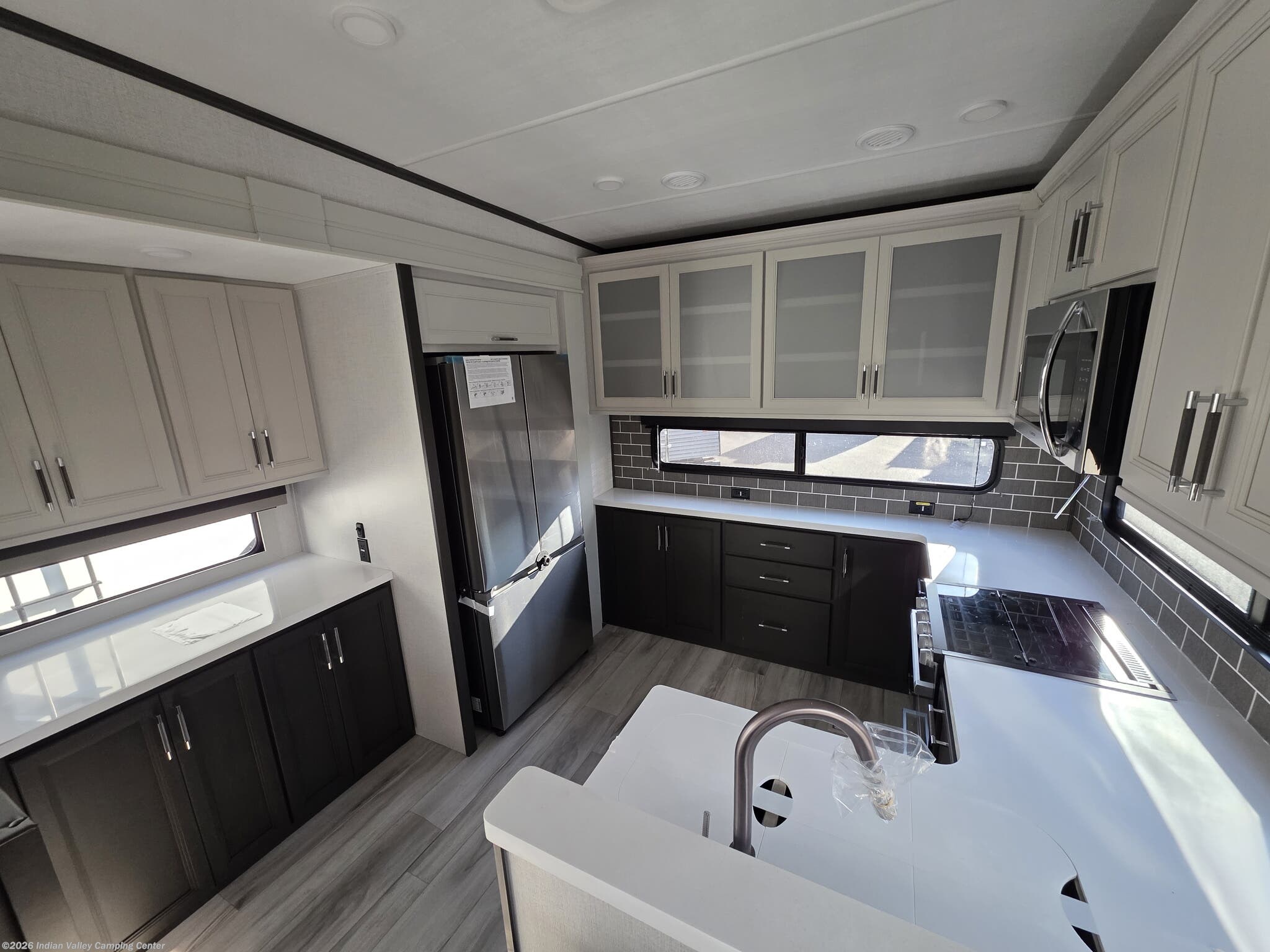 This fifth wheel is equipped with a remarkable range of amenities that redefine the RV experience. The rear kitchen layout offers ample space for meal preparation, featuring modern appliances such as a microwave, oven, and stove top burner. The refrigerator ensures that your food stays fresh, while the water heater provides hot showers after a long day of exploring.