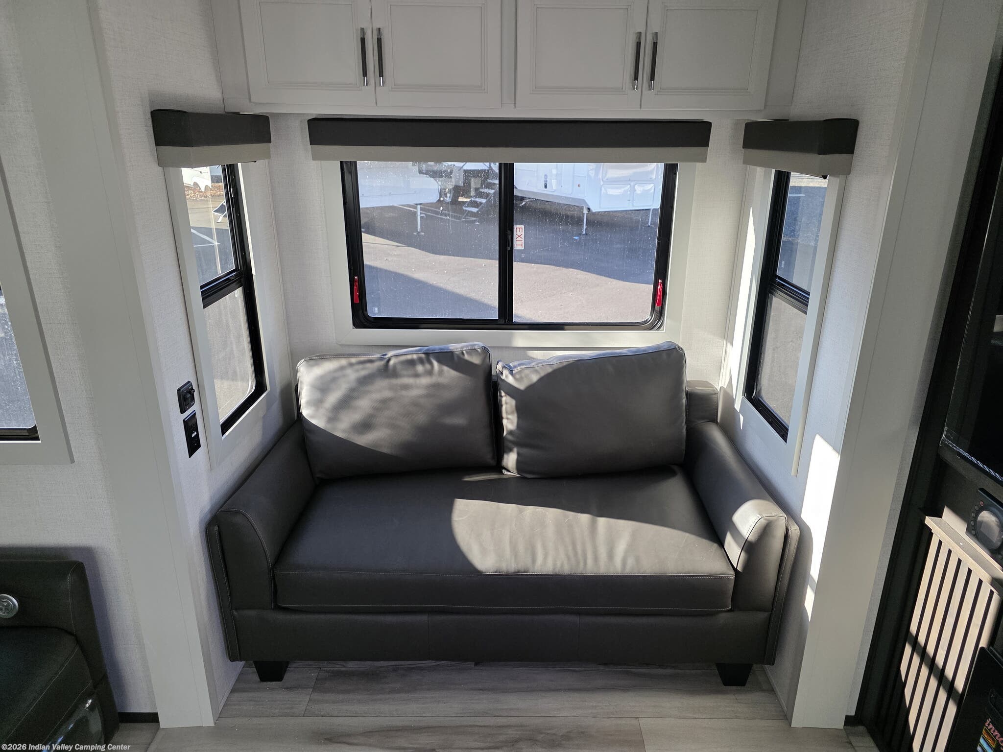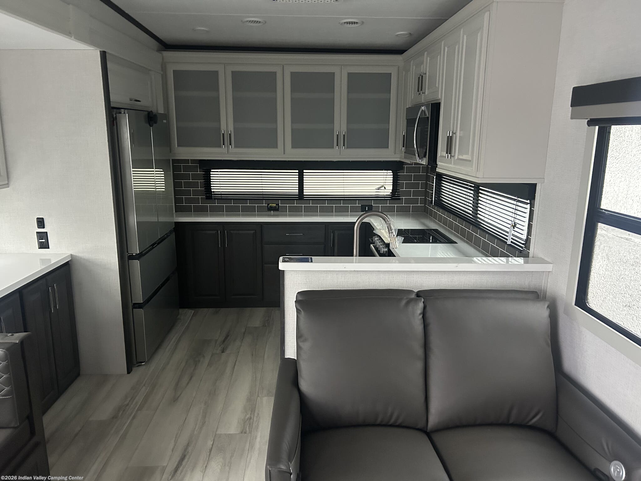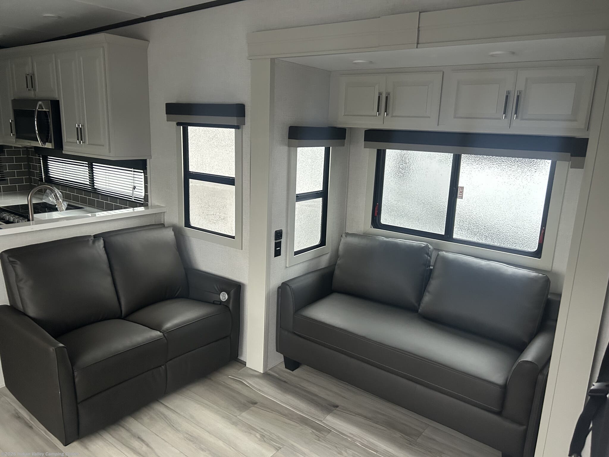 This fifth wheel is equipped with a remarkable range of amenities that redefine the RV experience. The rear kitchen layout offers ample space for meal preparation, featuring modern appliances such as a microwave, oven, and stove top burner. The refrigerator ensures that your food stays fresh, while the water heater provides hot showers after a long day of exploring.