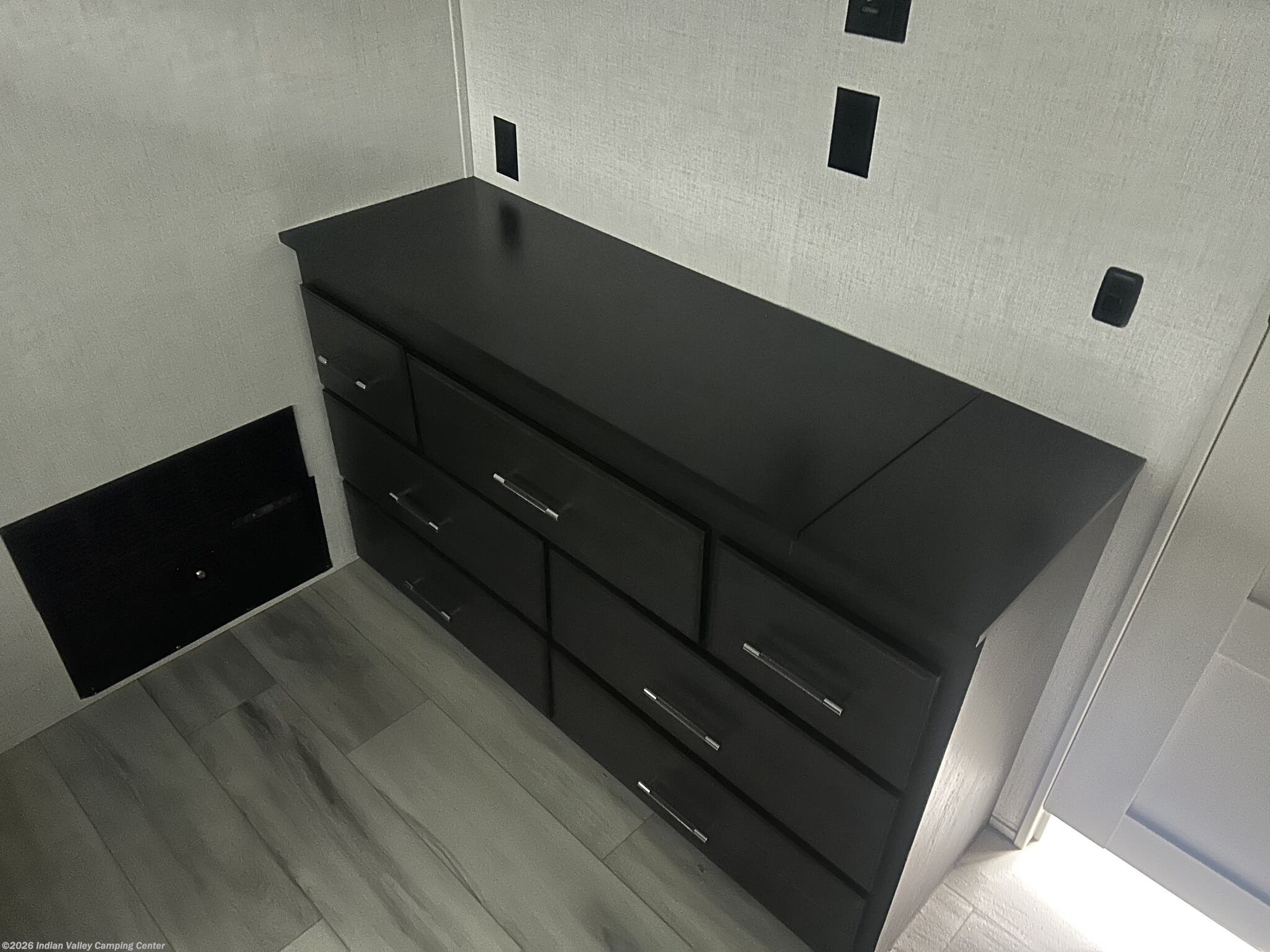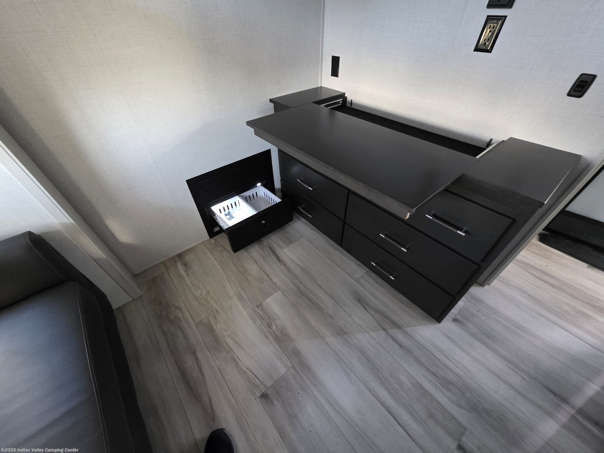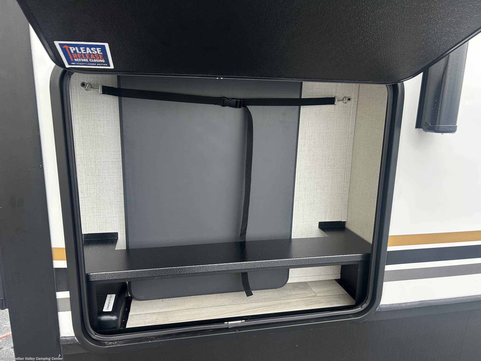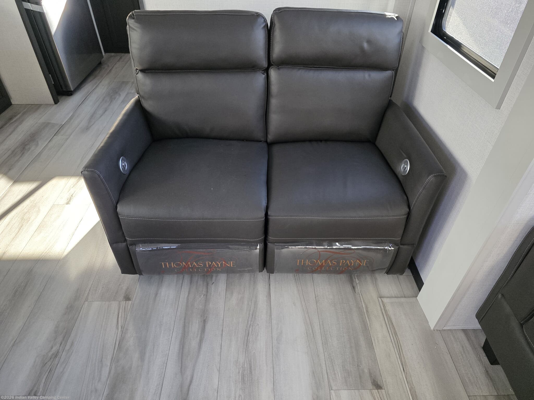 This fifth wheel is equipped with a remarkable range of amenities that redefine the RV experience. The rear kitchen layout offers ample space for meal preparation, featuring modern appliances such as a microwave, oven, and stove top burner. The refrigerator ensures that your food stays fresh, while the water heater provides hot showers after a long day of exploring.