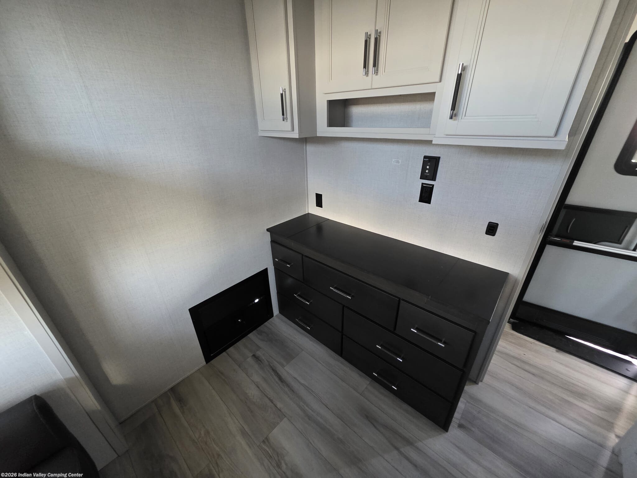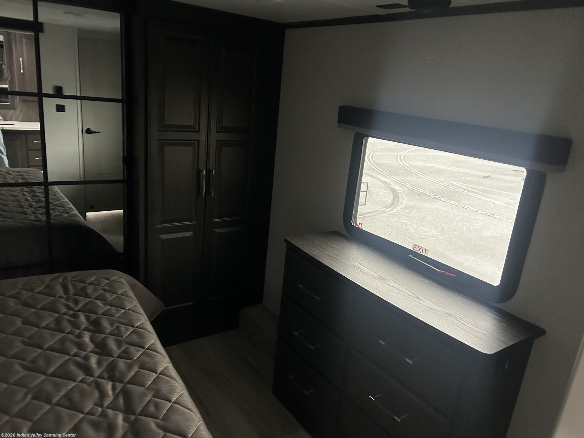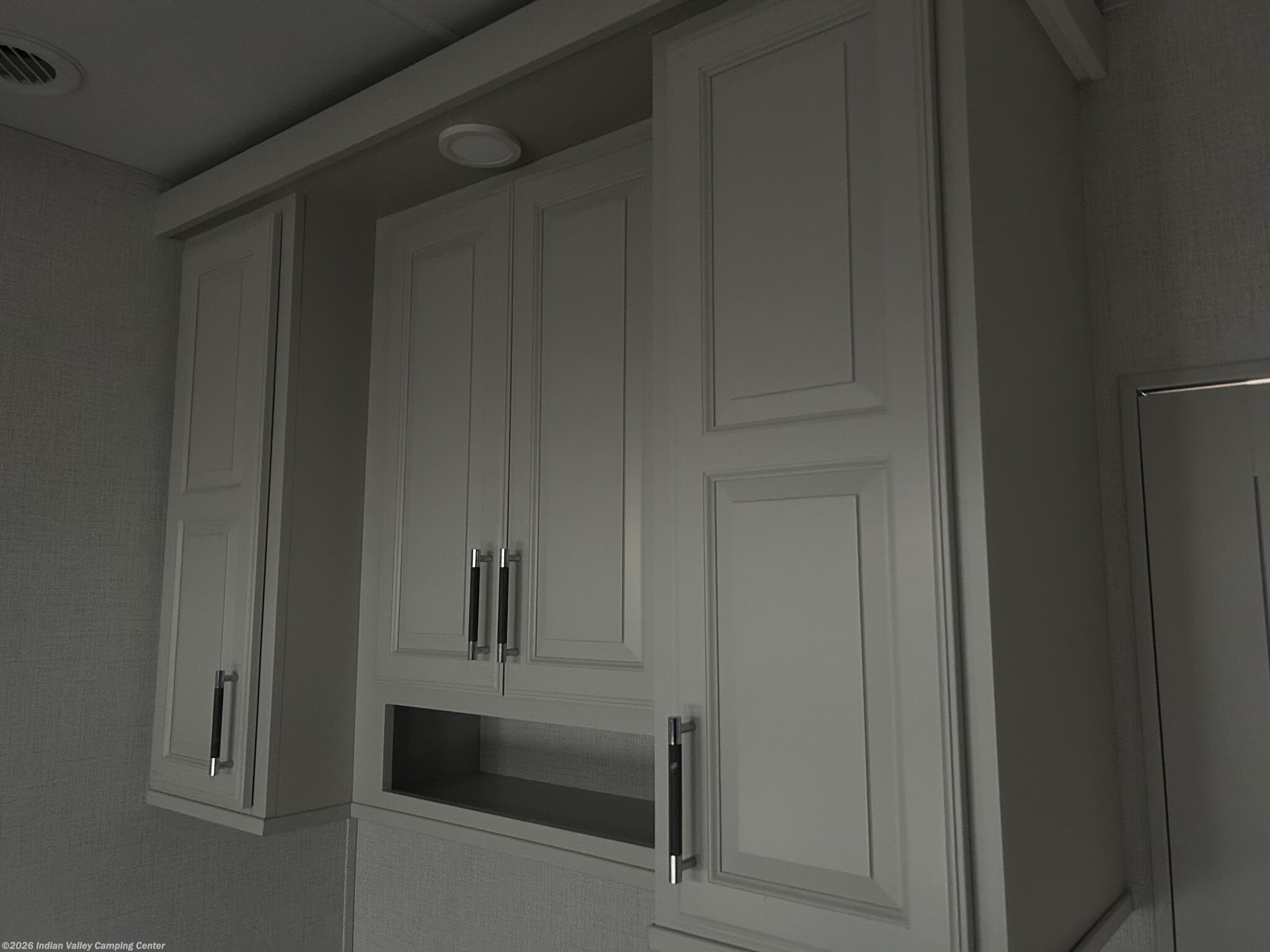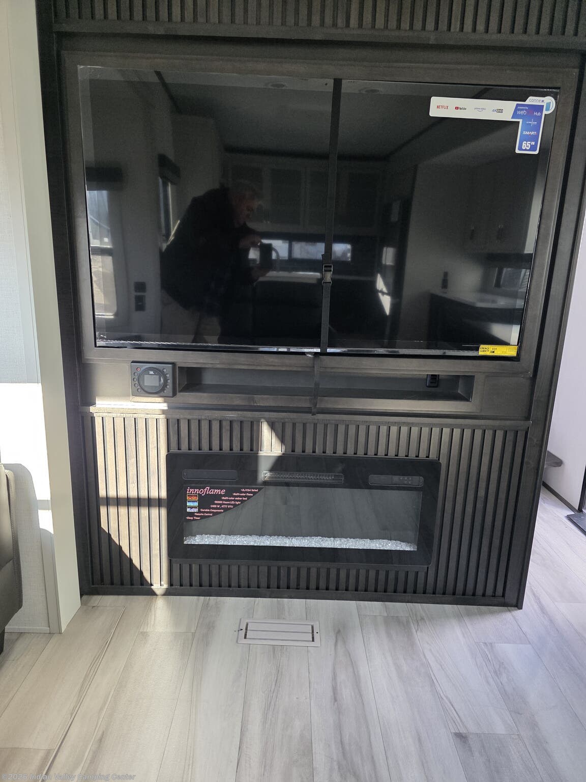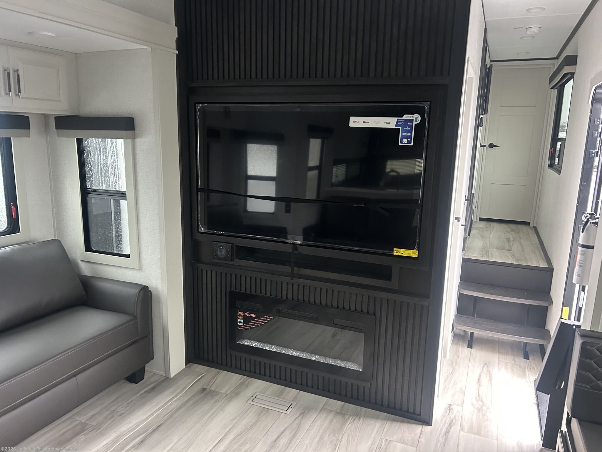 No detail is overlooked in this well-designed RV. The spacious master suite features a king-sized bed, providing a luxurious sleep space. The bathroom includes a shower and toilet, while the medicine cabinet offers practical storage solutions. For those cooler nights, the cozy fireplace adds warmth and ambiance.