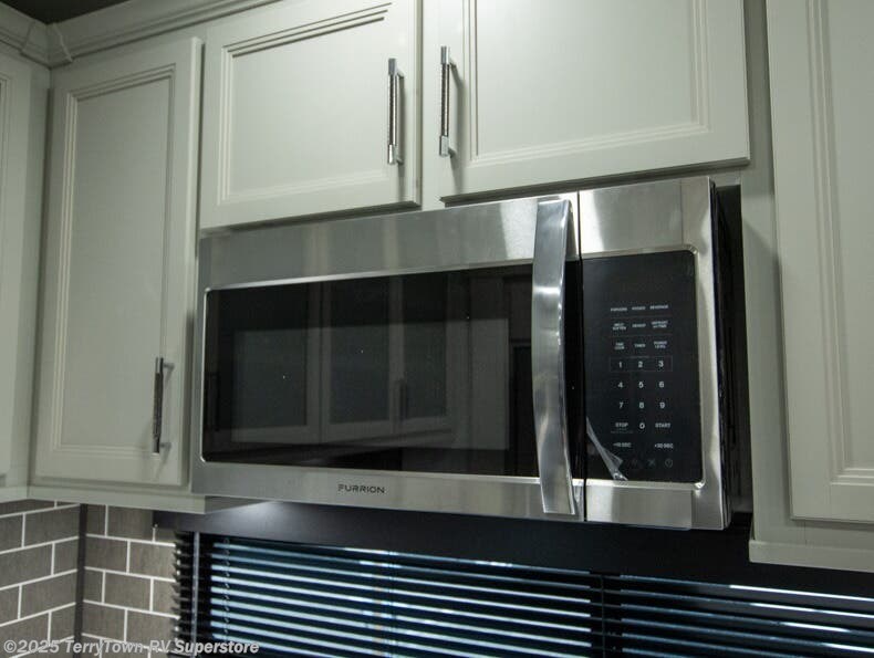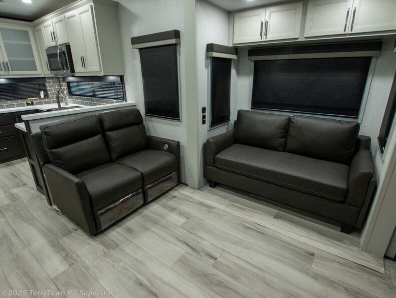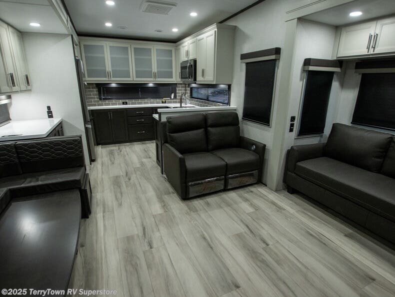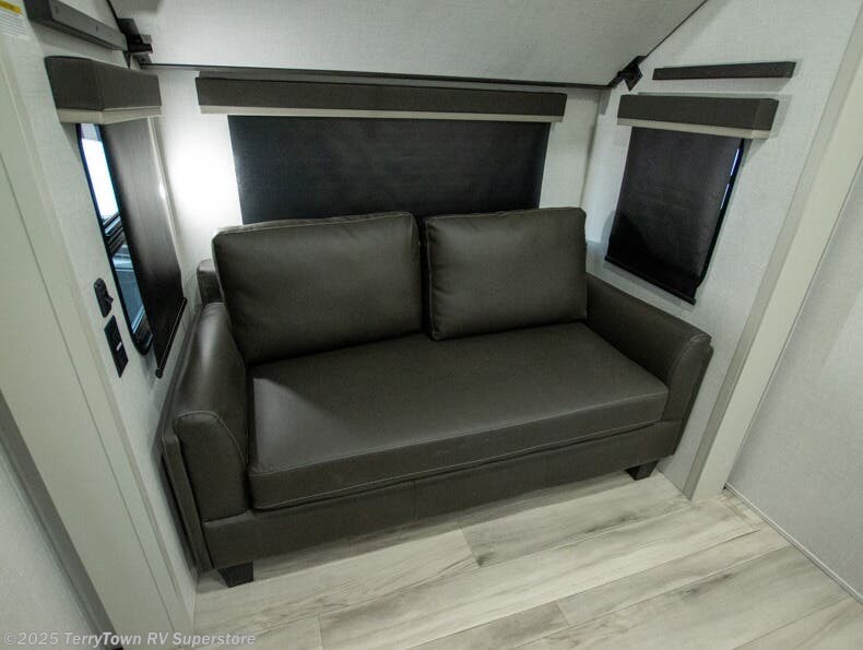 The whole gang will love camping in this fifth wheel since there is space for everyone! A front master bedroom includes a king bed slide out, master closet, and stackable washer and dryer prep if you choose to go full-time. Your guests or little ones will love the middle bunkhouse with a flip bunk above a hide-a-bed sofa, along with a pull-out table and storage space. Everyone can meet in the living area which features dual opposing slides for more space, theater seating, a sleeper sofa, and a U-shaped dinette, providing even more sleeping space. And check out the rear kitchen with its wrap-around counter space, Furrion appliances, and large pantry to keep snacks stocked!