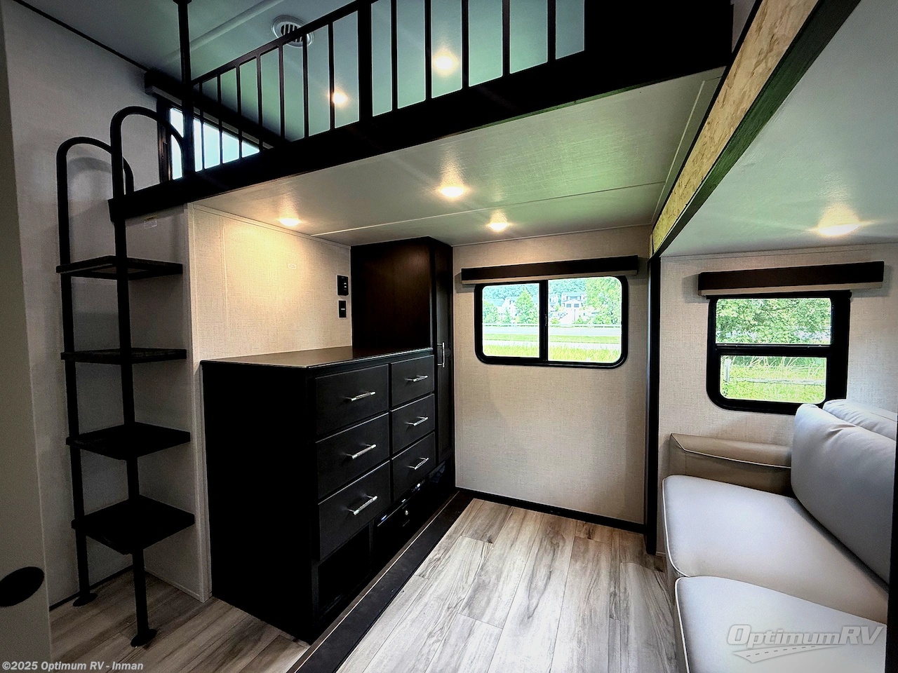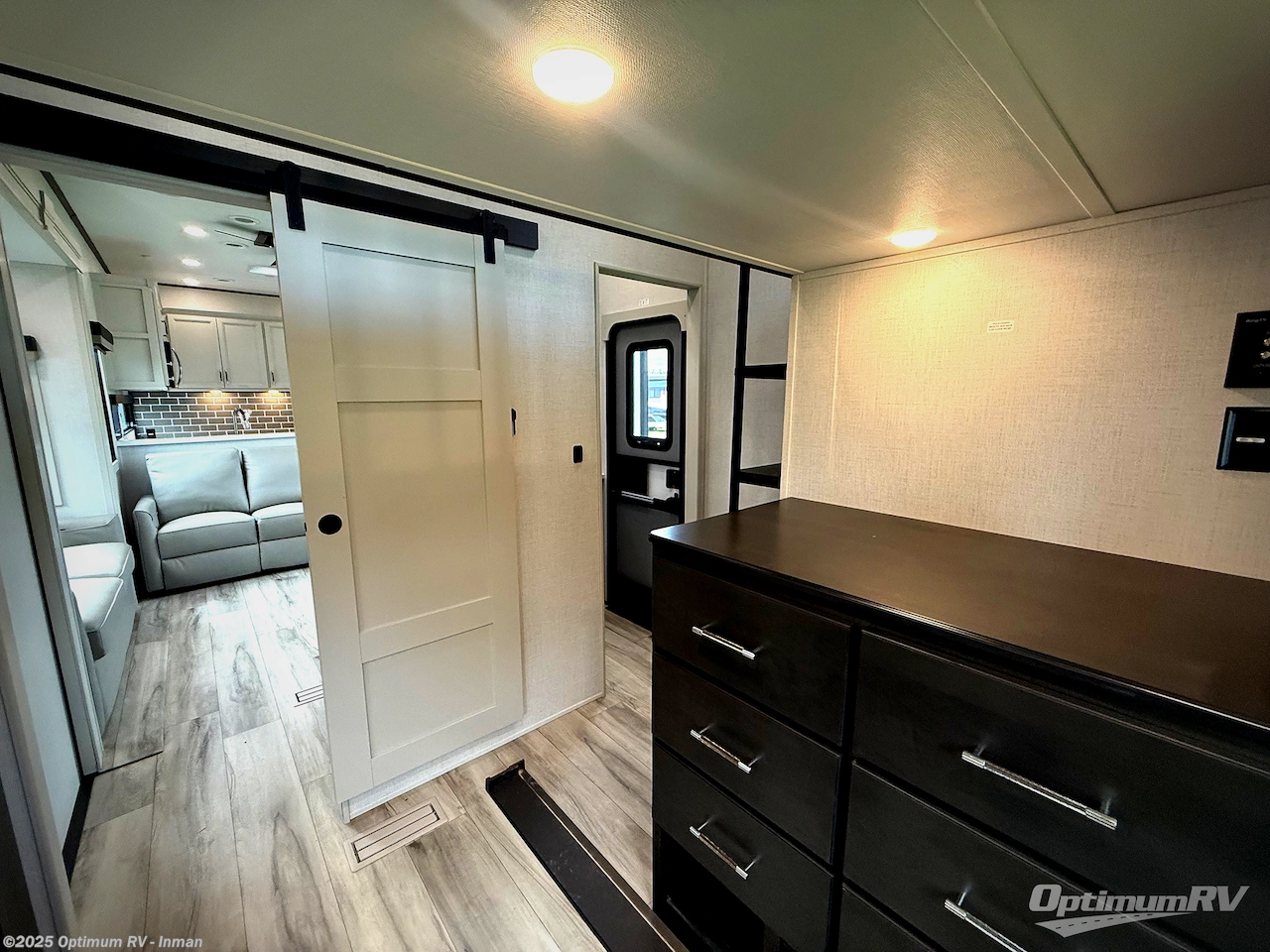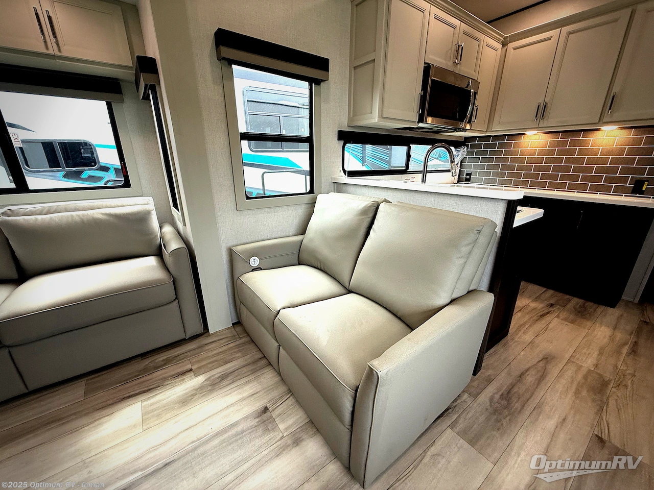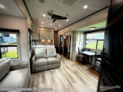 Are you looking for a spacious fifth wheel with space for you and your guests? Look no further than this four slide out unit with dual entry doors, a front master bedroom, and a rear bedroom/den with a loft! There is also a half bath here and a hide-a-bed sofa with storage underneath. You'll find the second hide-a-bed sofa in the living room, along with theater seating, a feature wall with a 50" TV, and a free-standing dinette with chairs where you can dine together. Furrion appliances in the kitchen let you create yummy meals each day, and there is a pantry and residential refrigerator to keep food stocked. Head to the front master bedroom where you can relax on the king bed slide out, store your clothes in the master closet, and easily use the dual entry bath. There is even stackable washer and dryer prep if you want the option to make laundry day easier!