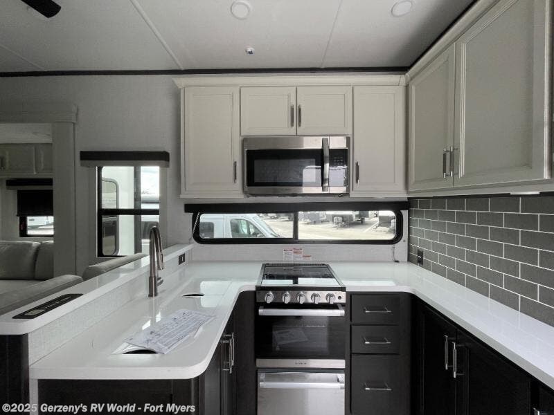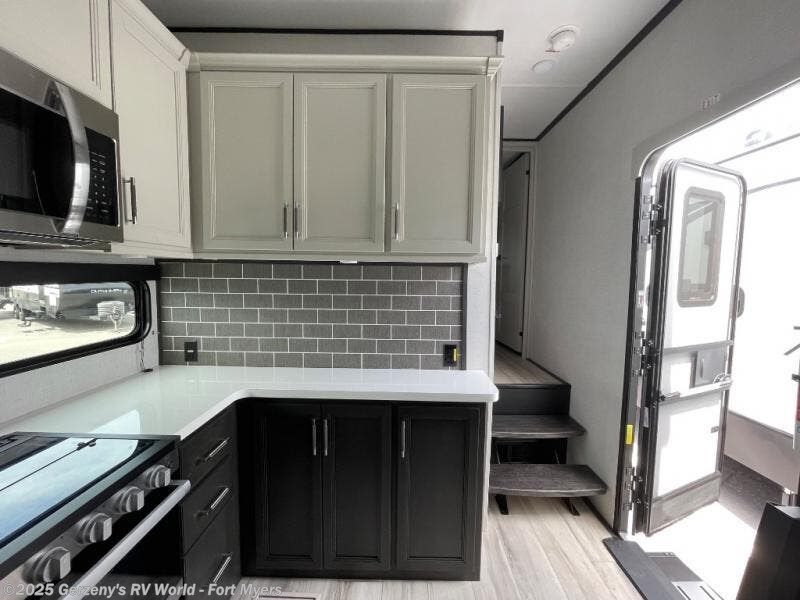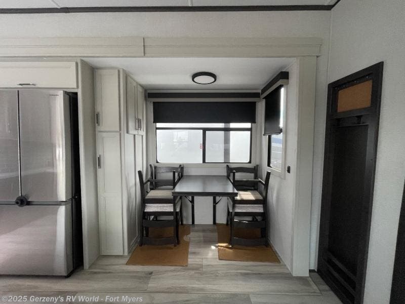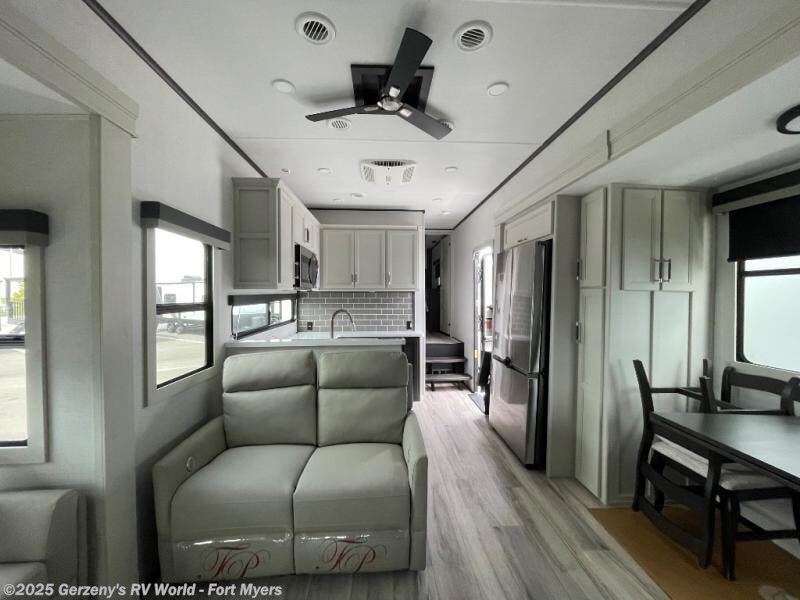 Are you looking for a spacious fifth wheel with space for you and your guests? Look no further than this four slide out unit with dual entry doors, a front master bedroom, and a rear bedroom/den with a loft! There is also a half bath here and a hide-a-bed sofa with storage underneath. You'll find the second hide-a-bed sofa in the living room, along with theater seating, a feature wall with a 50" TV, and a free-standing dinette with chairs where you can dine together. Furrion appliances in the kitchen let you create yummy meals each day, and there is a pantry and residential refrigerator to keep food stocked. Head to the front master bedroom where you can relax on the king bed slide out, store your clothes in the master closet, and easily use the dual entry bath. There is even stackable washer and dryer prep if you want the option to make laundry day easier!