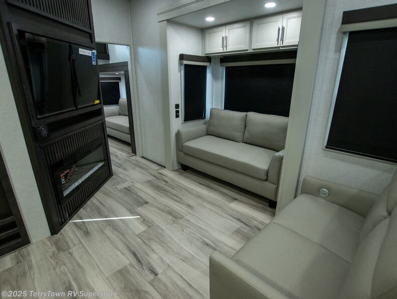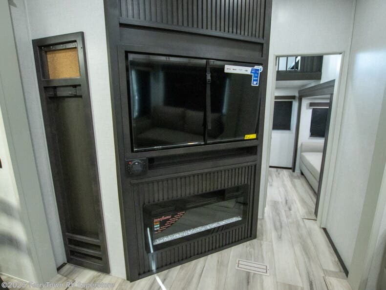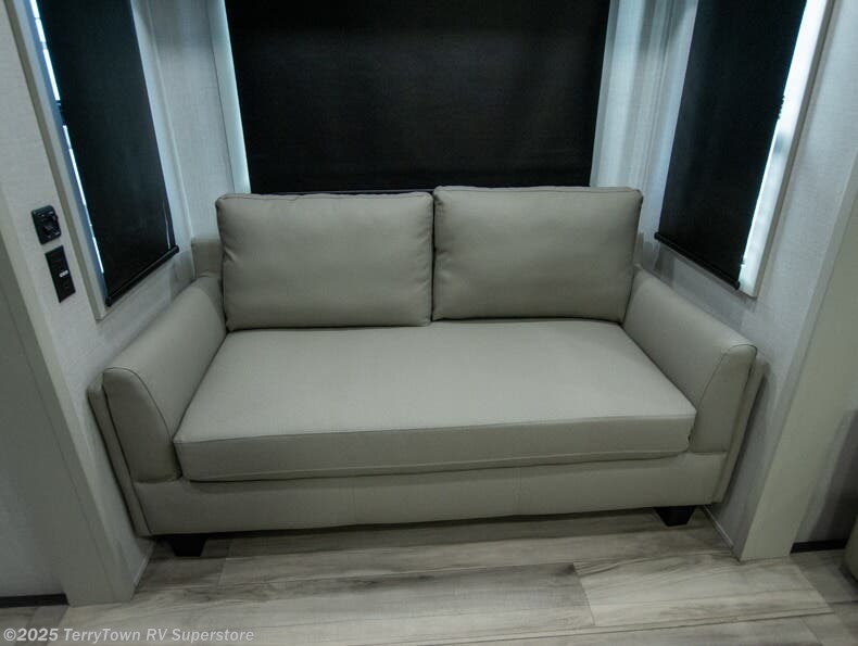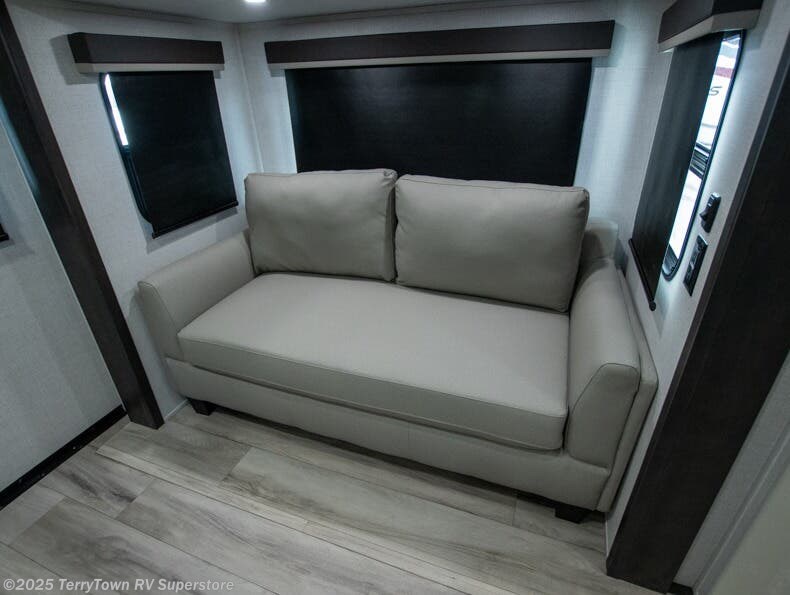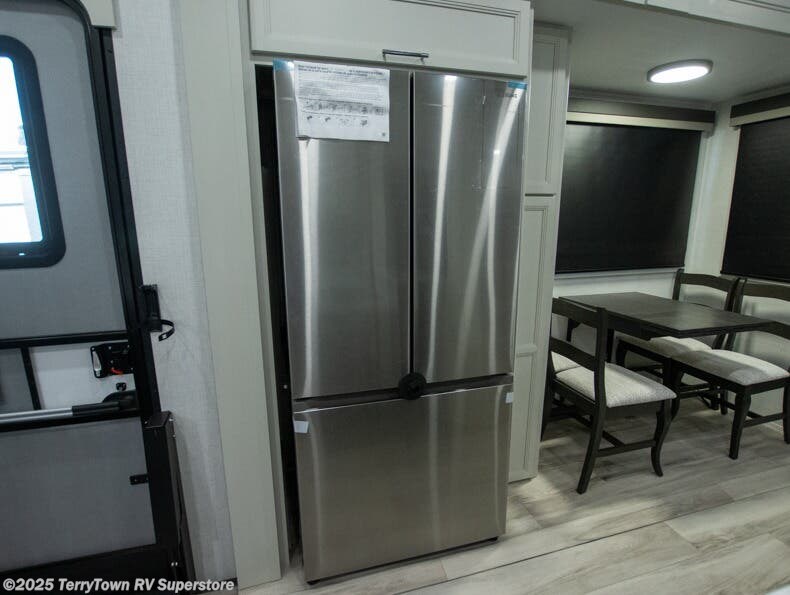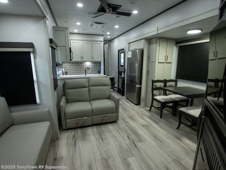 Are you looking for a spacious fifth wheel with space for you and your guests? Look no further than this four slide out unit with dual entry doors, a front master bedroom, and a rear bedroom/den with a loft! There is also a half bath here and a hide-a-bed sofa with storage underneath. You'll find the second hide-a-bed sofa in the living room, along with theater seating, a feature wall with a 50" TV, and a free-standing dinette with chairs where you can dine together. Furrion appliances in the kitchen let you create yummy meals each day, and there is a pantry and residential refrigerator to keep food stocked. Head to the front master bedroom where you can relax on the king bed slide out, store your clothes in the master closet, and easily use the dual entry bath. There is even stackable washer and dryer prep if you want the option to make laundry day easier!