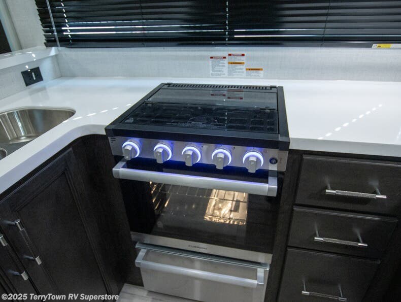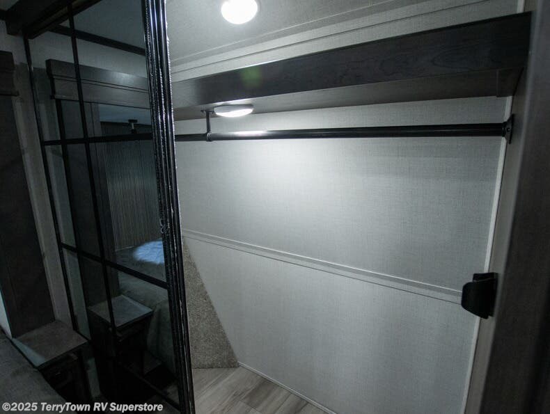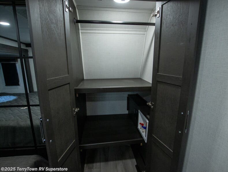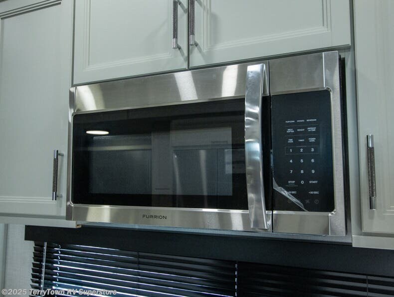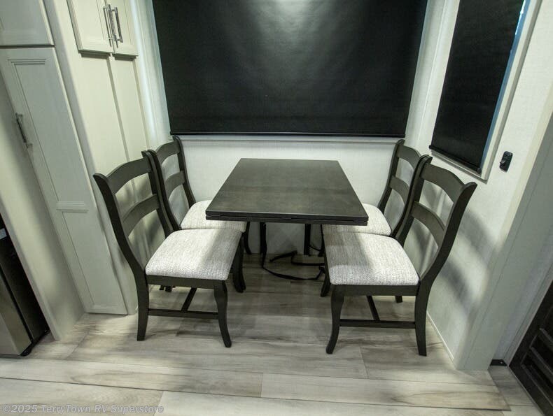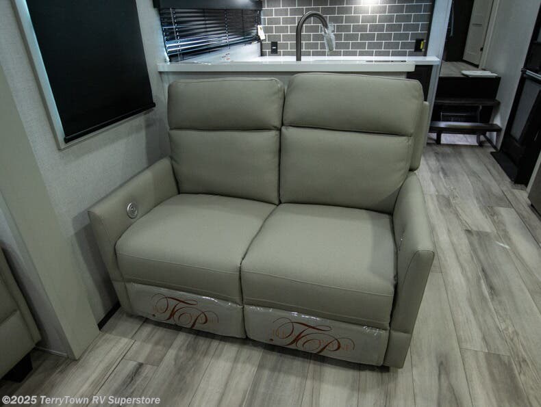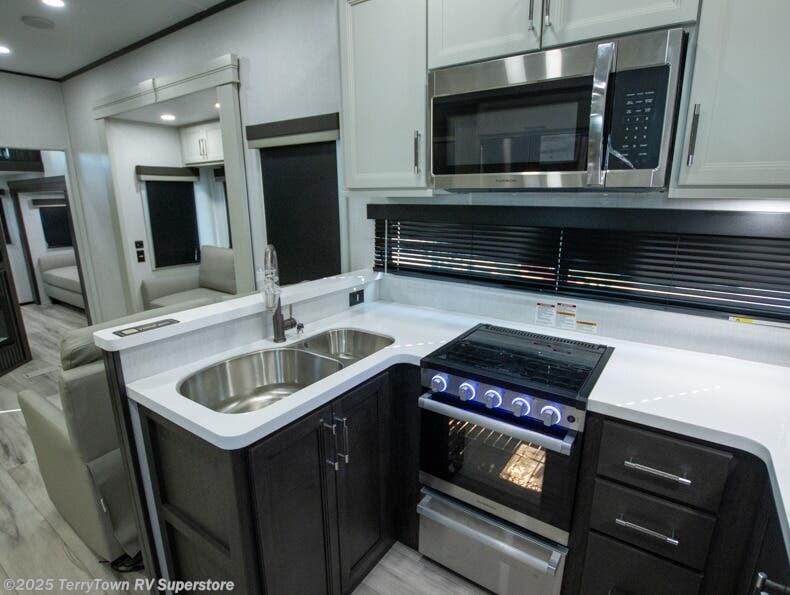 Are you looking for a spacious fifth wheel with space for you and your guests? Look no further than this four slide out unit with dual entry doors, a front master bedroom, and a rear bedroom/den with a loft! There is also a half bath here and a hide-a-bed sofa with storage underneath. You'll find the second hide-a-bed sofa in the living room, along with theater seating, a feature wall with a 50" TV, and a free-standing dinette with chairs where you can dine together. Furrion appliances in the kitchen let you create yummy meals each day, and there is a pantry and residential refrigerator to keep food stocked. Head to the front master bedroom where you can relax on the king bed slide out, store your clothes in the master closet, and easily use the dual entry bath. There is even stackable washer and dryer prep if you want the option to make laundry day easier!