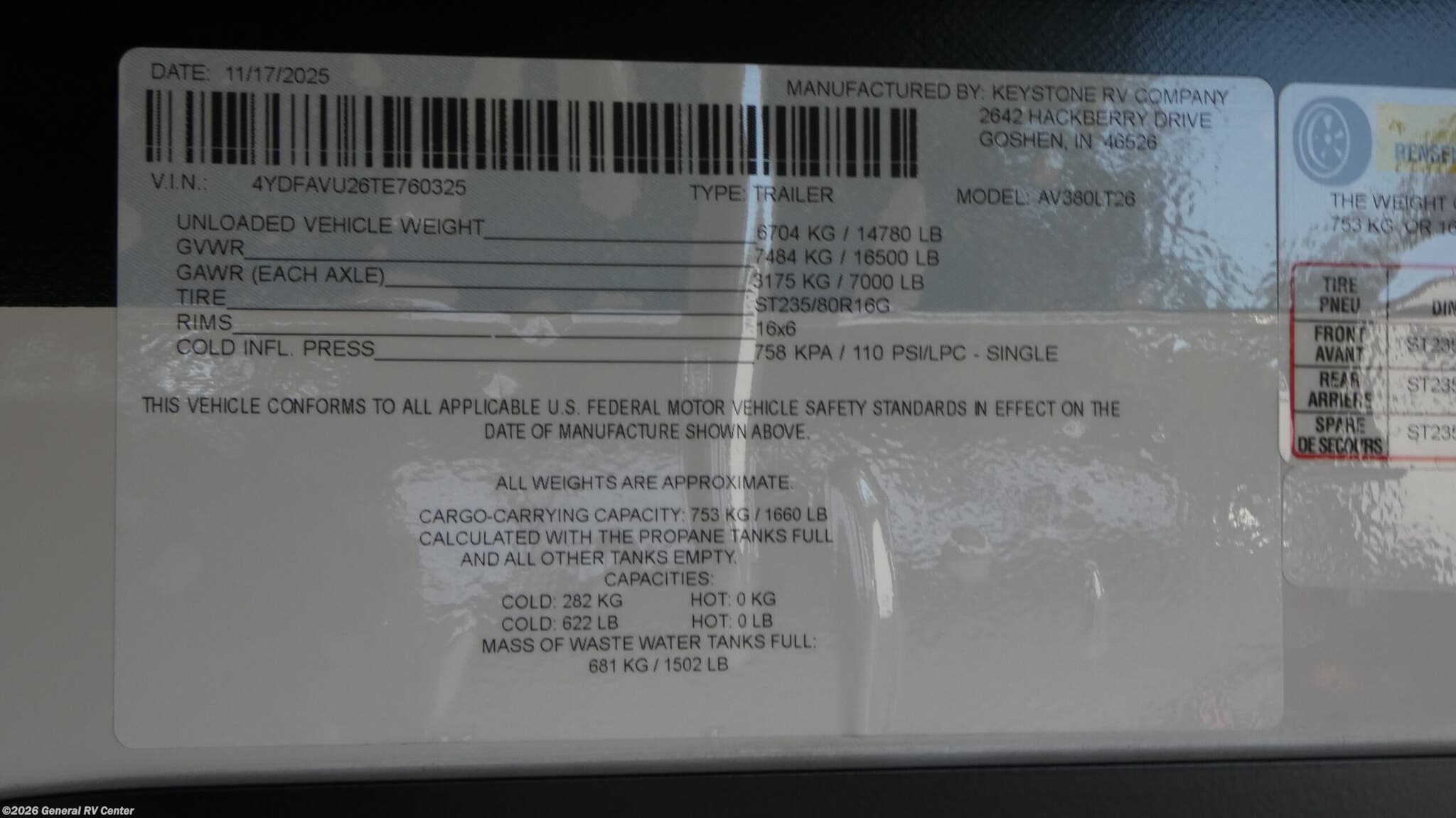 2026 Keystone Alpine Avalanche Edition 380LT Specifications