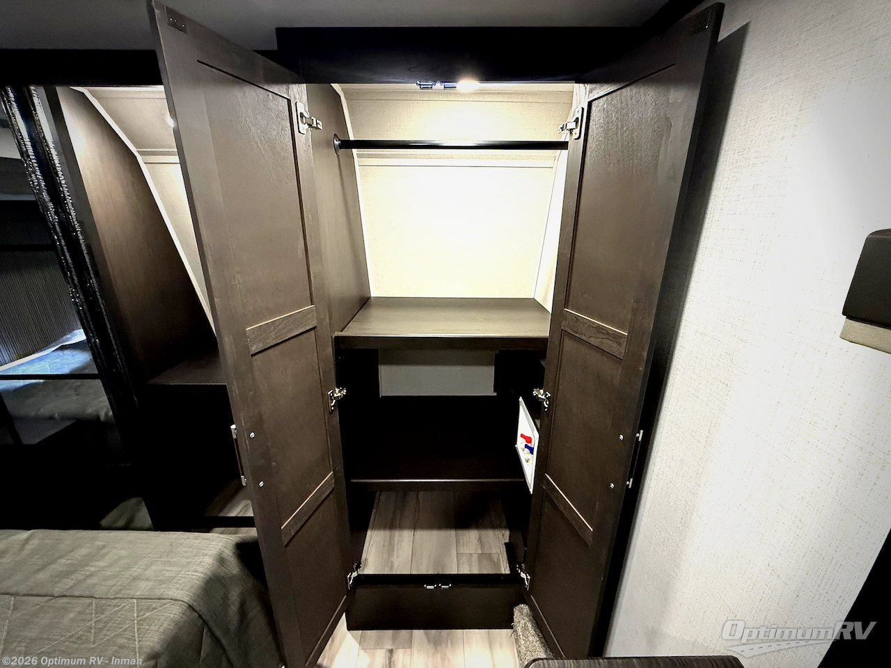 It will be so easy to enjoy trips in this spacious fifth wheel that can sleep six each night! The rear living room features L-shaped sofa slide outs with ottomans, a 65" TV with a large feature wall, and a fireplace to make it cozier. There is a stylish lighted beam and lighted steps that lead to the middle kitchen with dual opposing slides, a kitchen island, triple pantries, and a free-standing dinette. And the chef will appreciate all the kitchen appliances to make their best meals for the whole gang. As you head up the steps, you'll find a full bath to easily freshen up each day, and you'll love the front private bedroom with a king bed slide, master closet with hidden shoe storage, plus stackable washer and dryer prep!