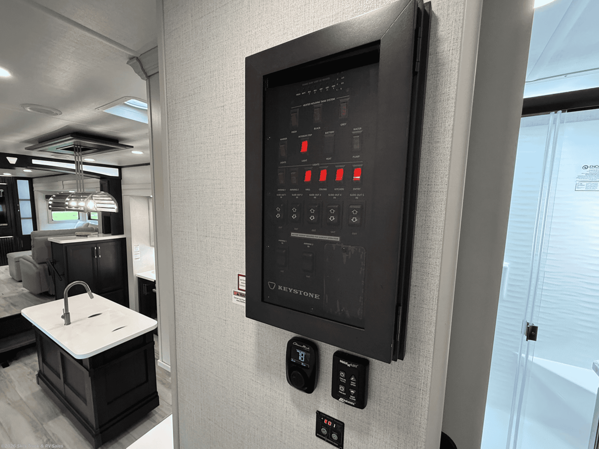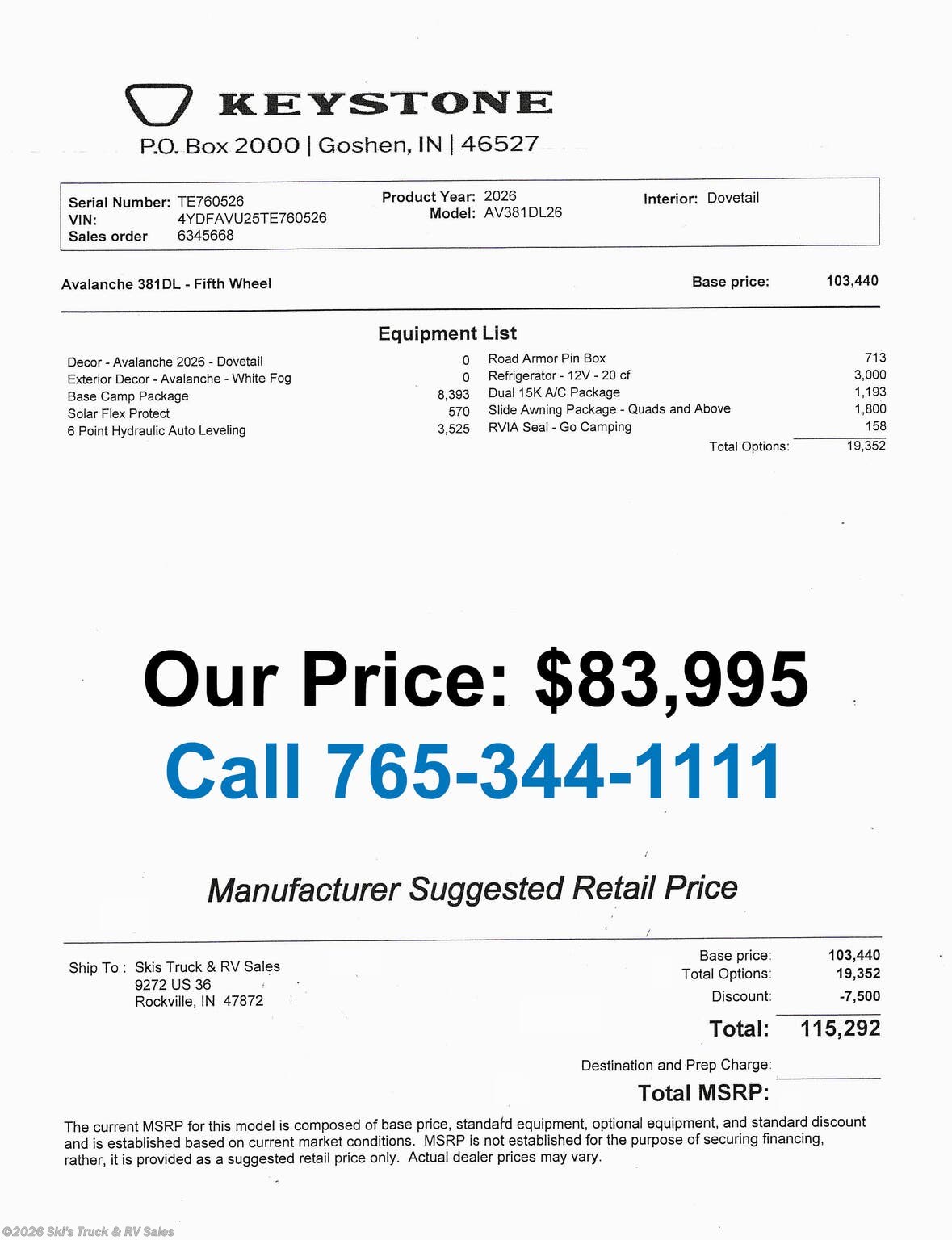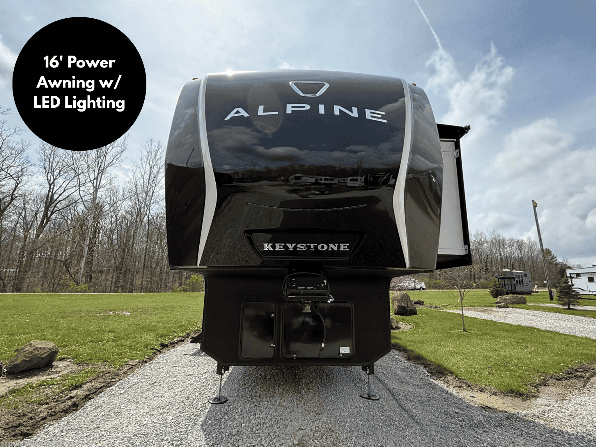 2026 Keystone Alpine Avalanche Edition 381DL Fifth Wheel; 42 Foot; 5 Slides with Toppers; Sleeps 6; 50 Amp; Hitch Weight: 2,900 Lbs.; Dry Weight: 15,660 Lbs.; Auto Leveling; 75 Gal. Fresh Water Cap.; 49 Gal. Black Water Cap.; 83 Gal. Gray Water Cap.; Two 30 Lbs. Propane Tanks; Two ACs: 15,000 / 15,000 BTUs (Wired for Third AC); 35,000 BTU Furnace; 20 C.F. (12V) Refrigerator; On Demand Water Heater; Microwave; 3-Burner Stove/Oven; Three TV Jacks; 65 In. TV; AM/FM; Speakers; One Fireplace; Pantry; Stainless Steel Sink; Solid Surface Countertops; Free Standing Dinette; Two L Shaped Sofas with Ottomans; King Bed; One Bathroom with Shower/Sitting Area; 16 Foot Power Awning with LED Lights; Solar Package; Backup Camera Prep.; Outside Shower; Lots of Exterior Storage; Foldup Steps; Grab Handle; Roof Ladder; Rear Hitch; Key Alike System; Battery Disconnect; Black Tank Flush; Climate Package; Tinted Windows; Roller Shades; Lots of Windows; Aluminum Wheels; Spare Tire; Road Armor Pin Box; One Year Limited Warranty; Financing Available; Great Floorplan in this Fifth Wheel: $83,995. Call 765-344-1111 or visit us online at for more information and photos.
