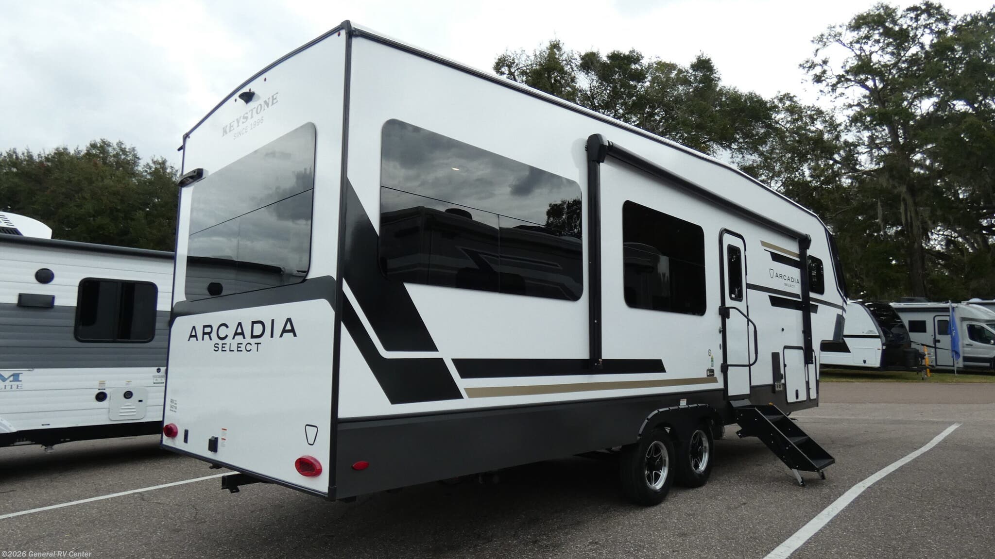 Experience the ultimate in comfort and style with the 2026 Keystone Arcadia Select 28SLS. This thoughtfully designed RV offers a perfect blend of luxury and functionality, making it an ideal choice for both weekend getaways and extended adventures. With a spacious interior stretching over 32 feet, this model features a rear living area that invites relaxation with its plush tri-fold sofa and cozy recliners. The center kitchen is equipped with a convection microwave and a full-size refrigerator, making meal preparation a breeze while you enjoy the open road. The Arcadia Select 28SLS is designed to accommodate up to four guests comfortably, featuring a queen-sized bed in the front bedroom and a convertible sleeping area. The center bath is conveniently located and features a stylish barn door, adding a touch of elegance to the space. Outside, the 17-foot powered retractable awning provides the perfect spot for outdoor relaxation, while the solid step entry ensures easy access. With ample storage, dual gray water tanks, and a robust cargo capacity, this RV is ready to support all your adventures. For more details or to see this beautiful model in person, visit your nearest General RV dealership.