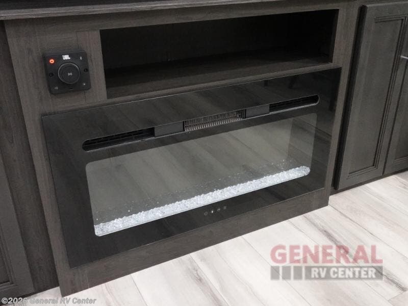 Camping is made easy in this fifth wheel! Once you arrive at the campground, you can enter in through the LCI solid entry steps and start cooking a delicious meal in the middle kitchen with the 21" Furrion range with Piezo ignition,10 cu. ft. 12V "Solar Friendly" refrigerator, and 0.9 cu. ft. microwave to pop a bag of popcorn for movie night. The rear living area offers a more at-home feel with a rear entertainment center with a fireplace, theater seating, and plenty of space to move about thanks to the opposing slide outs. There is also a free standing dinette to play card games and enjoy meals and an XL sofa sleeper that extends to a king-size sleeping space. The full bath includes a 48" x 30" shower with a glass door and a skylight for more standing space, and the front private bedroom includes a queen bed for a great night's rest. You'll also find a wardrobe slide here and an end table with an outlet and a USB port to charge your electronics.