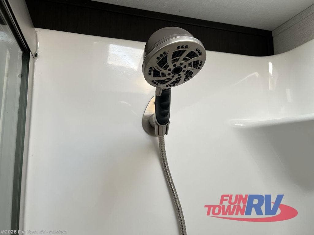 You will feel right at home in this fifth wheel! The chef will love the kitchen island with a bamboo sink cover for extra meal prepping space, and the 16 cu. ft. "Solar Friendly" refrigerator with dent resistant doors is big enough to bring all of your favorite foods to cook. There is a front private bedroom with a king bed slide for a comfortable nights rest and across from it is a dresser with hidden storage and a bench seat, plus you have a front closet with washer and dryer prep if you choose to add those appliances. Freshen up in the full bathroom with the 48" x 30" shower then head to the rear living area to relax on either the XL sofa sleeper or theater seating while you enjoy your morning coffee in front of the fireplace and watch the morning news on the 50" TV.