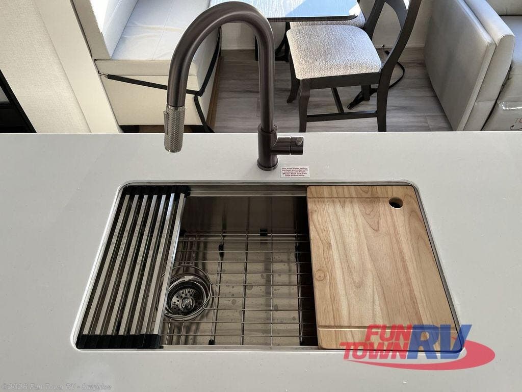 You will feel right at home in this fifth wheel! The chef will love the kitchen island with a bamboo sink cover for extra meal prepping space, and the 16 cu. ft. "Solar Friendly" refrigerator with dent resistant doors is big enough to bring all of your favorite foods to cook. There is a front private bedroom with a king bed slide for a comfortable nights rest and across from it is a dresser with hidden storage and a bench seat, plus you have a front closet with washer and dryer prep if you choose to add those appliances. Freshen up in the full bathroom with the 48" x 30" shower then head to the rear living area to relax on either the XL sofa sleeper or theater seating while you enjoy your morning coffee in front of the fireplace and watch the morning news on the 50" TV.