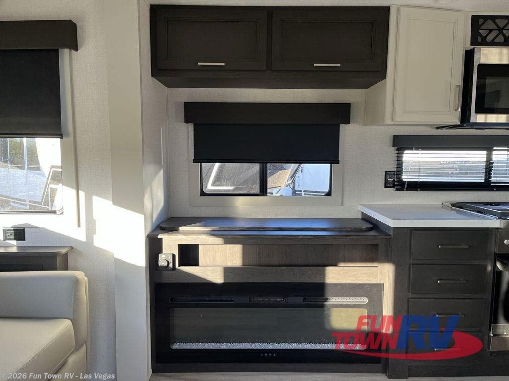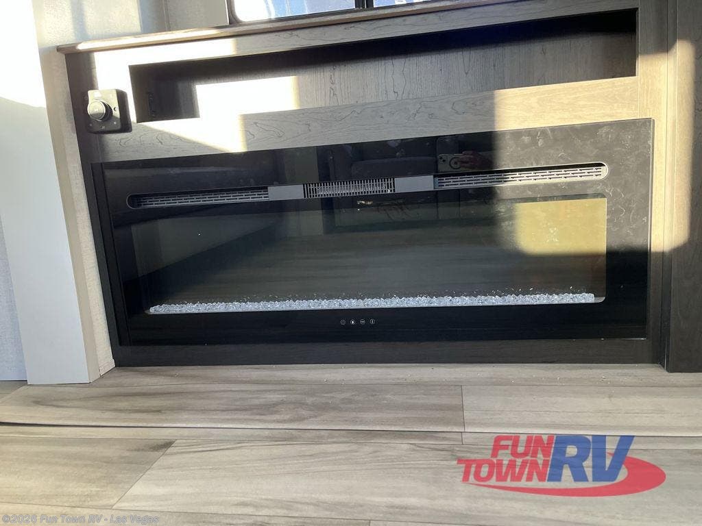 You will feel right at home in this fifth wheel! The chef will love the kitchen island with a bamboo sink cover for extra meal prepping space, and the 16 cu. ft. "Solar Friendly" refrigerator with dent resistant doors is big enough to bring all of your favorite foods to cook. There is a front private bedroom with a king bed slide for a comfortable nights rest and across from it is a dresser with hidden storage and a bench seat, plus you have a front closet with washer and dryer prep if you choose to add those appliances. Freshen up in the full bathroom with the 48" x 30" shower then head to the rear living area to relax on either the XL sofa sleeper or theater seating while you enjoy your morning coffee in front of the fireplace and watch the morning news on the 50" TV.