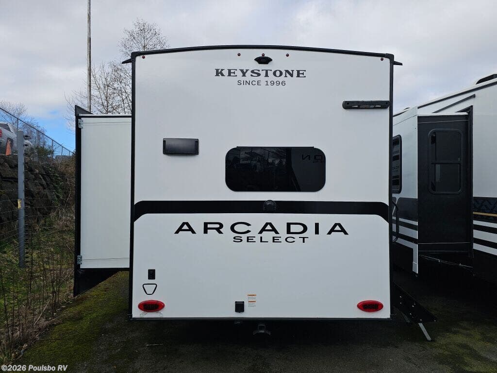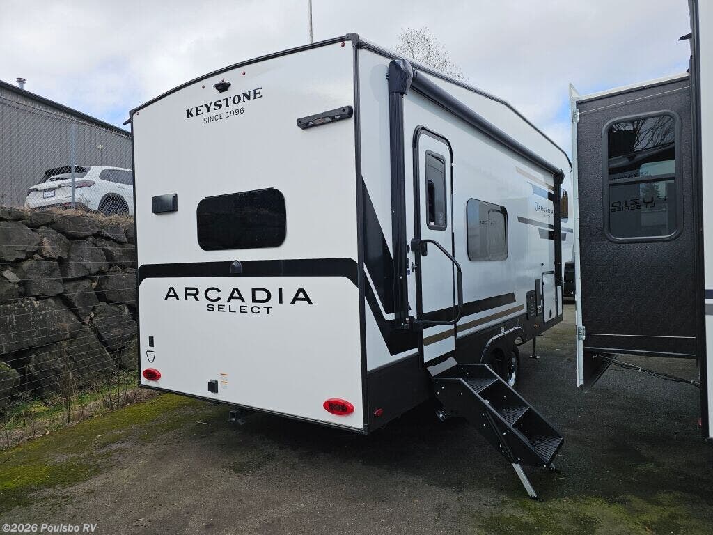 The 2026 Keystone Arcadia 21SRK offers a spacious and comfortable living area designed to enhance every moment of your travels. This new model measures 26.8 feet in length, providing ample room for relaxation and entertainment. It features one slide out that expands the interior space, allowing for greater freedom of movement and an open feel while inside. The absence of bunk beds and a bunkhouse design focuses the layout on maximizing common space and sleeping accommodations for adults or couples. With a dry weight of 7127 pounds and a GVWR of 9900 pounds, this unit is built for ease of towing and stability on the road. An included hitch weight of 1300 pounds ensures compatibility with a variety of tow vehicles. Leveling jacks add convenience when setting up at your destination, ensuring a stable and comfortable base wherever you park. Inside, the living quarters are designed with both function and comfort in mind, providing an ideal environment for cooking, dining, and unwinding after outdoor adventures. Enjoy the convenience of integrated features that simplify your RV experience, allowing you to focus on the joy of camping and exploration. This RV supports a lifestyle of flexibility and comfort, making it a perfect choice for those who value serene living spaces combined with modern amenities. As a family-owned, award-winning local RV dealer with multiple locations in Sumner, Everett, Kent, and Mt. Vernon Washington, Poulsbo RV here to help you find the perfect RV. Stock#: E6026, VIN: 4YDFARL24TE550394.