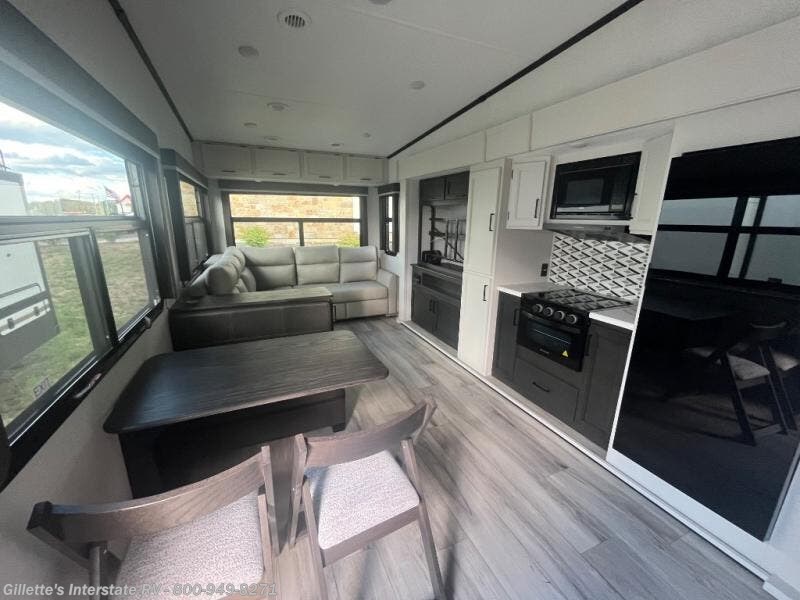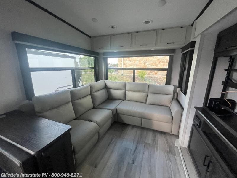 This fifth wheel will be the best RV vehicle for you and your family. Built to offer the ultimate comfort, this fifth wheel has a spacious living area that boasts a tri-fold sofa and sofa with recliners, perfect to rest while enjoying your tour favorites shows in the fabulous entertainment center. You can cook like a Michelin star chef in the incredible kitchen, fitted with a convection microwave, refrigerator, and three-burner range. Also, the overhead cabinets and pantry will allow you to keep all your food and spices organized on the go, and when your meal is done, you can enjoy it in the comfortable dinette. Convenience is our top priority; that is why the full bathroom is equipped with everything needed to take a nice shower. Finally, retreat to the comfortable queen bed, ideal for a deserved good night's rest.