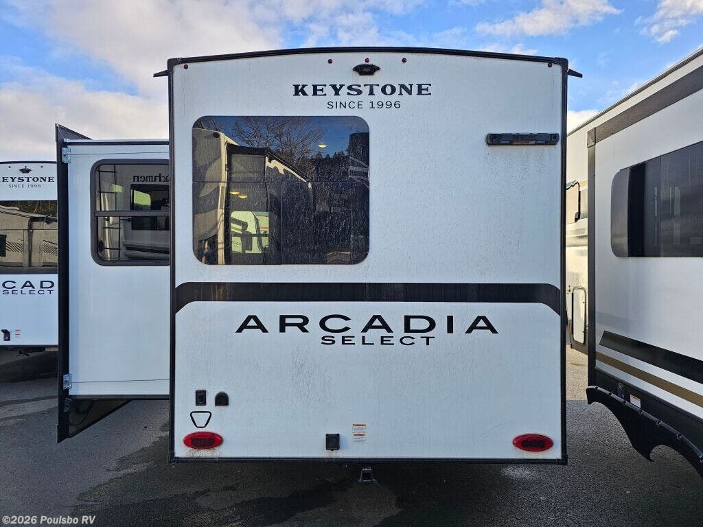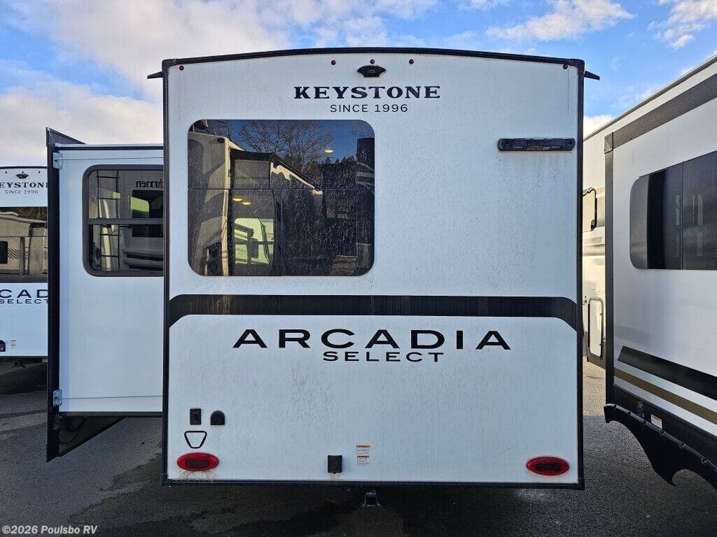 The 2026 Keystone Arcadia Select 24SRE is a new, versatile travel trailer designed to enhance your adventures with spacious living and thoughtful convenience. Offering a length of 28.1 feet, it provides an ideal balance of maneuverability and ample interior space for comfortable camping experiences. This model features one slide-out to expand your living area, creating a more open environment perfect for relaxing or entertaining. The absence of bunk beds channels space into a flexible layout that suits couples or small families seeking comfort on the road. Its dry weight of 7,564 pounds and hitch weight of 1,320 pounds allow for straightforward towing with various compatible vehicles, making your travel planning easier. The Arcadia Select 24SRE includes front and rear power leveling jacks, simplifying setup and ensuring a stable, level foundation wherever you park. Inside, you can anticipate a thoughtful floor plan that maximizes the living and sleeping accommodations, creating a welcoming retreat after your daily excursions. With Keystone's commitment to quality and design, you can expect durable construction paired with user-friendly features to enhance your RV lifestyle. Embrace the freedom of the open road with confidence, knowing this RV offers a blend of convenience and stable support wherever your journey leads. As a family-owned, award-winning local RV dealer with multiple locations in Sumner, Everett, Kent, and Mt. Vernon Washington, Poulsbo RV here to help you find the perfect RV. Stock#: S989, VIN: 4YDFARM26TE550458.