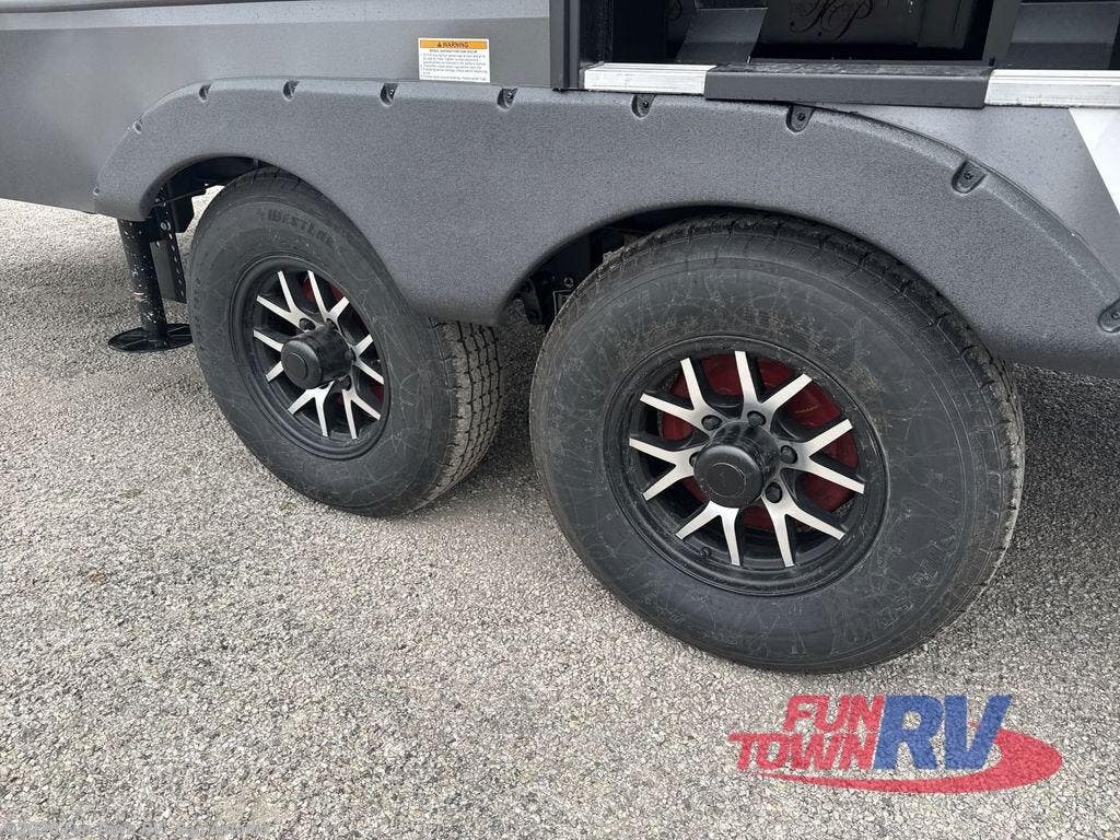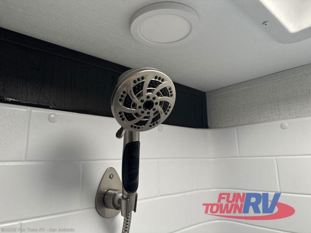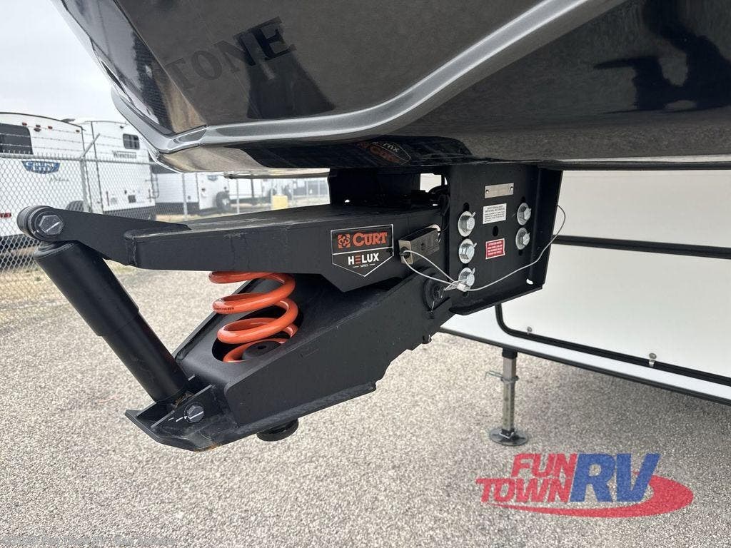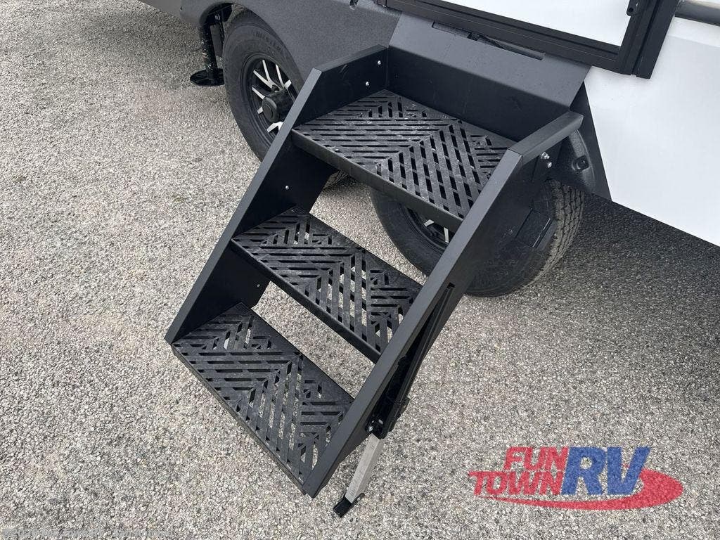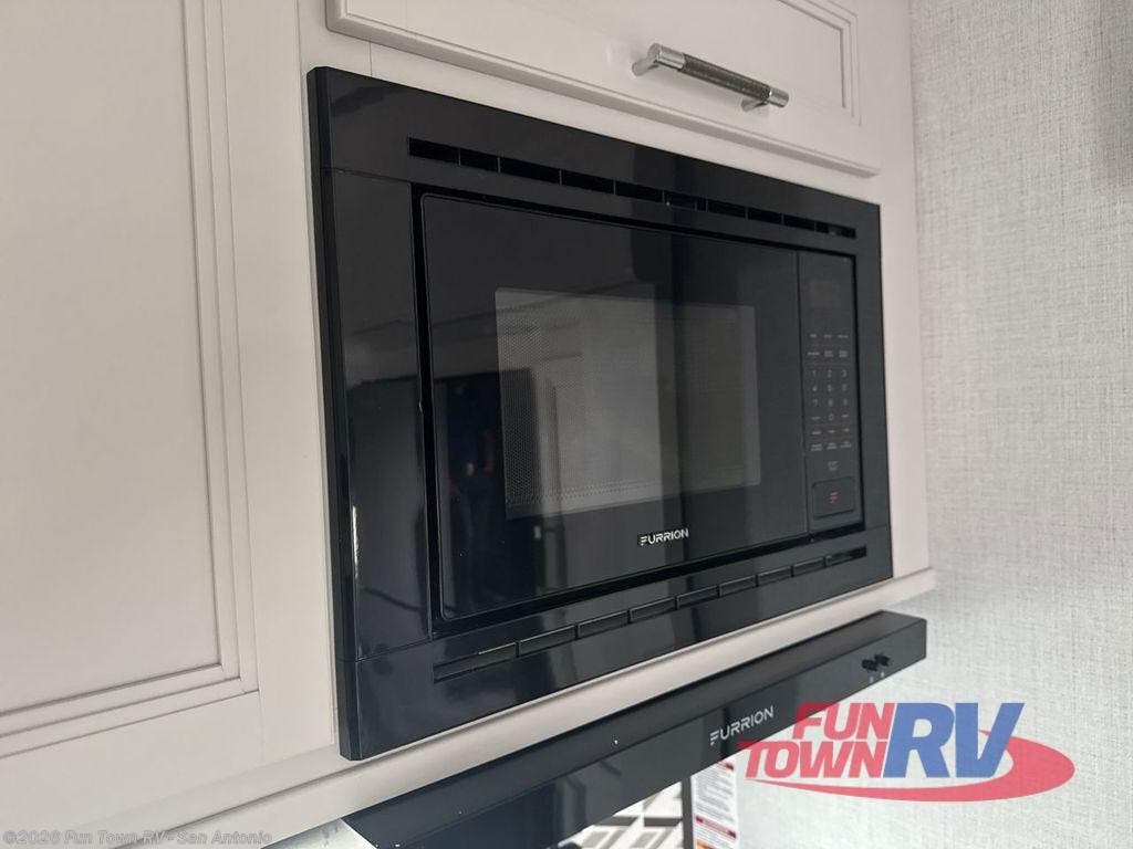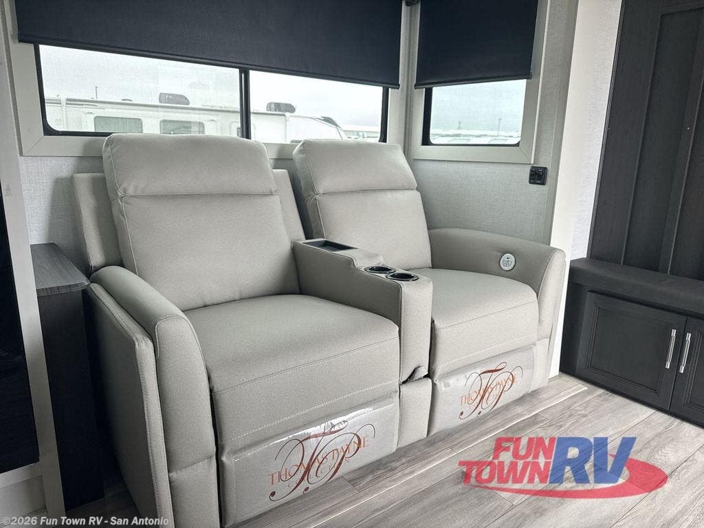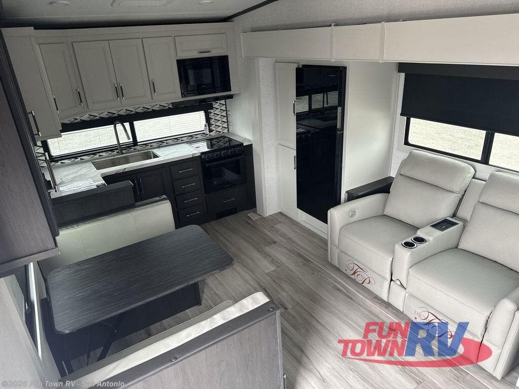 This rear kitchen fifth wheel is packed with features to make each trip memorable! Once you've arrived at the campground and set up the 21' electric awning, you can start lunch on the Grill-N-Chill outdoor kitchen before heading inside. If the weather isn't cooperating, you'll find a 21" Furrion range in the rear kitchen to whip up a meal. There is also a pantry and 12V "Solar Friendly" refrigerator for food storage. The theater seating will provide a place for you to relax in the evenings, and the full bath with a spacious shower means you can clean up before bed. Speaking of bedtime, the front private bedroom includes a queen bed for a great night's rest. There are also dual nightstands and a wardrobe slide to keep your space tidy!