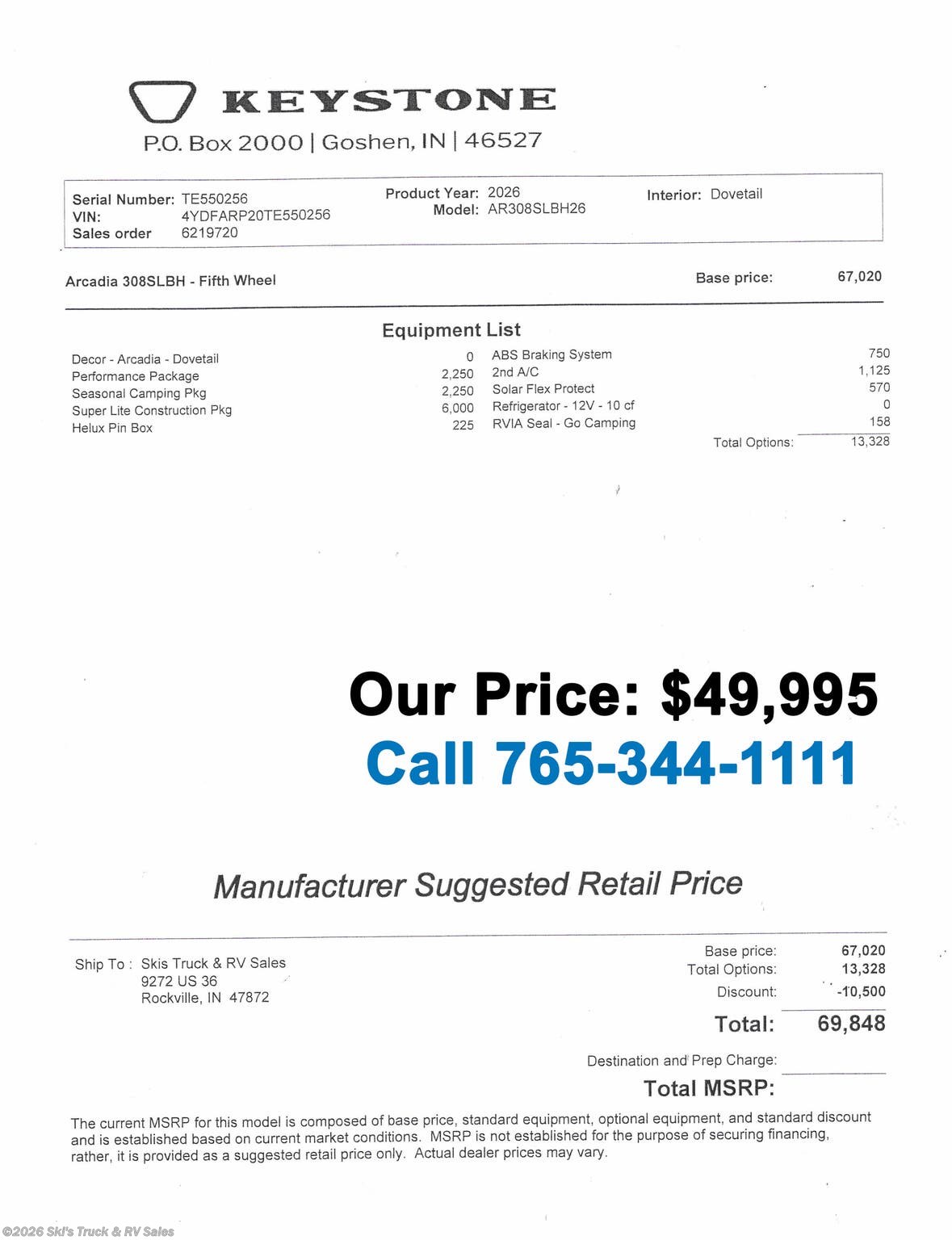 Request More Info on this 2026 Keystone Arcadia Super Lite 308SLBH Offered for sale by Ski's Truck & RV Sales
