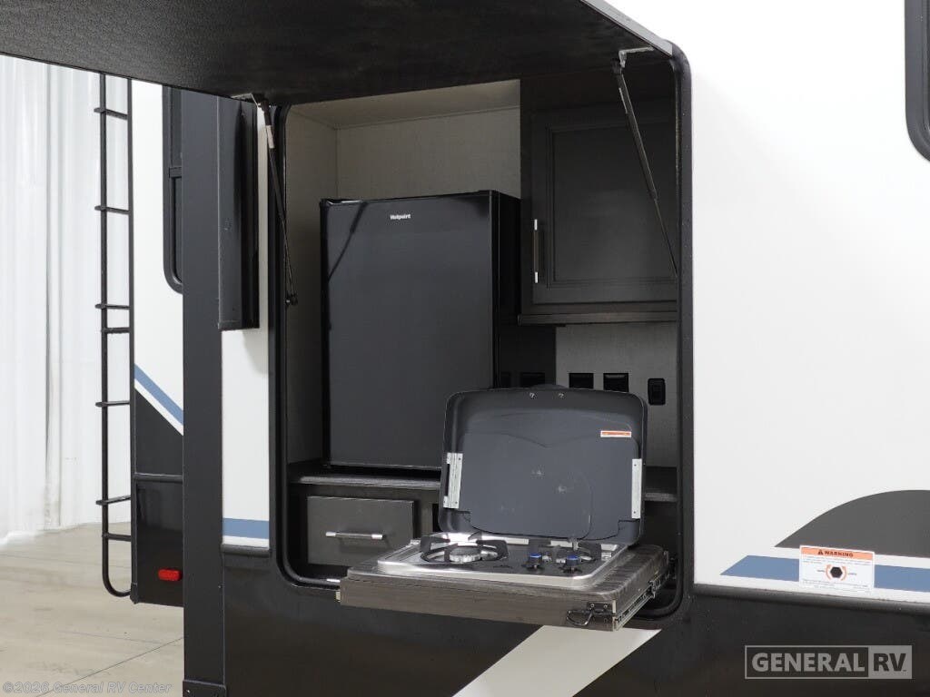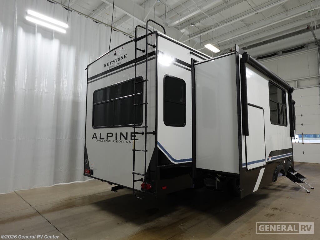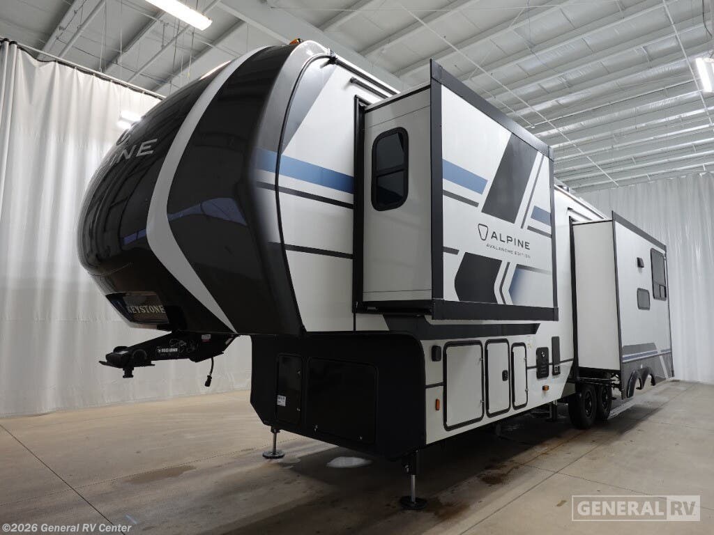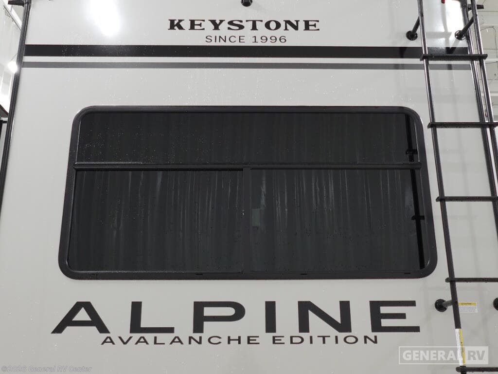 Keystone Alpine Avalanche Edition fifth wheel 302RS highlights: King Bed Kitchen Island Fireplace Hide-a-Bed Sleeper Outside Kitchen For the couple that enjoys entertaining, this fifth wheel is sure to catch your eye! Triple slides open up the interior to create an inviting place to call home while on the road. You will enjoy entertaining friends in the RV park, or even friends that come and stay a night or two since you have a hide-a-bed sofa sleeper for two! Theater seating opposite the entertainment center with 50" LED TV and fireplace makes it a cozy evening inside. The kitchen island with prep space and double sink makes it easy to be part of the conversation when prepping dinner with your guests, and you will love the refrigerator to keep your perishables fresh, along with a curio cabinet for storage and a pantry for your dry goods and snacks. You can even cook outside under the 11' Carefree awning protected from the elements at the Grill-N-Chill outside kitchen. Back inside and up the steps, you will find a front private bedroom and bath with dual entry. A king bed slide with storage beneath offers ample room for sleeping and a place to store extra blankets and things when not in use. With any Keystone luxury Alpine Avalanche Edition fifth wheel, you will experience wide-body construction that allows you to stretch out and stay awhile during any season thanks to the Polar Pack All Season Protection that includes a heated and enclosed underbelly, an Astro foil reflective layer on the roof, front and rear walls, and two static attic vents, plus more! The interior offers hardwood slide out fascia with wood accents, designer upholstered window valances with custom wood window frame, plus your choice of modern interior design. There are many more Keystone exclusives, like the Tru-Fit slide construction, the in-floor heating ducts, KeyTV™, and much more to bring you a full-packed, luxury fifth wheel!