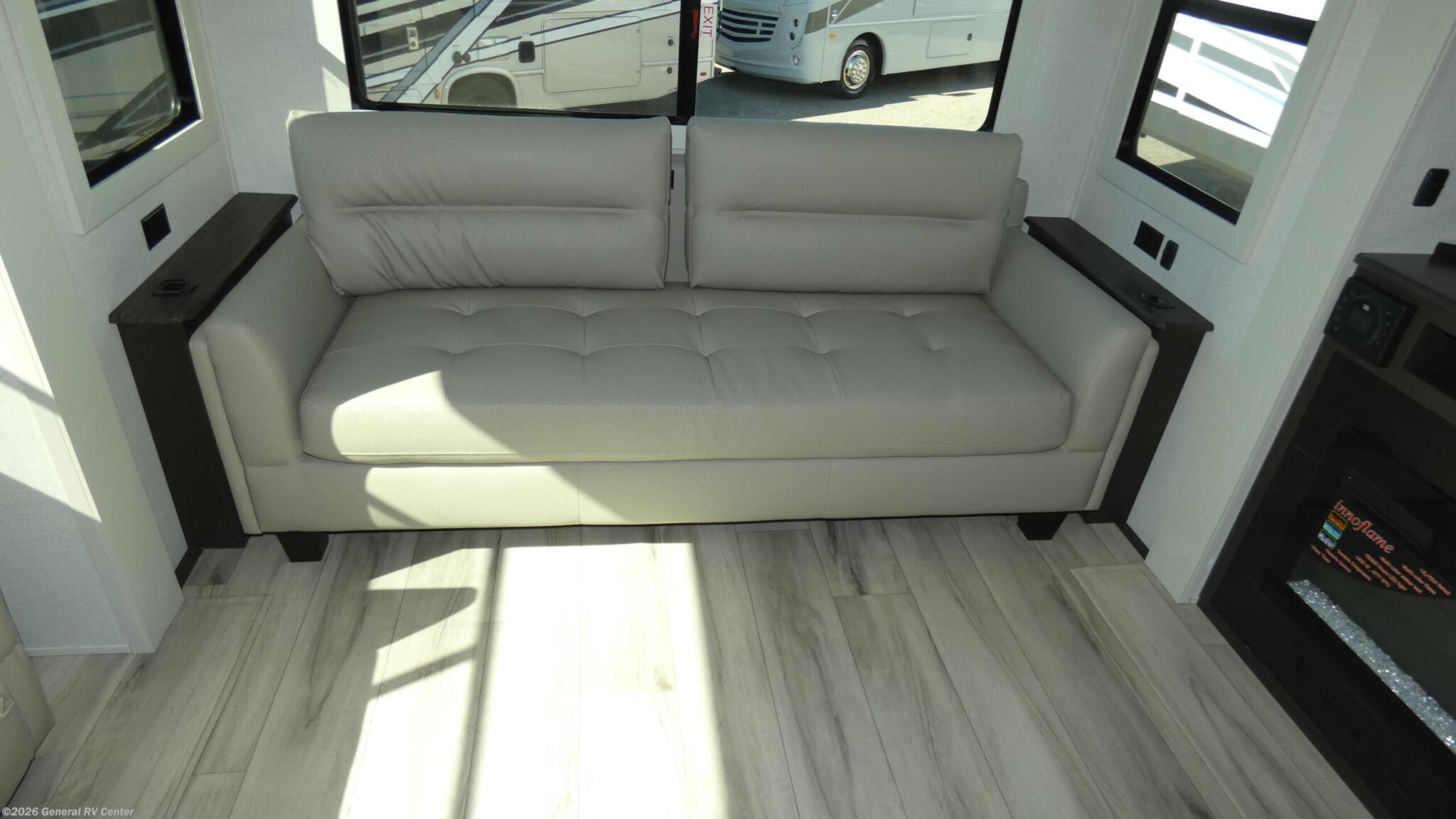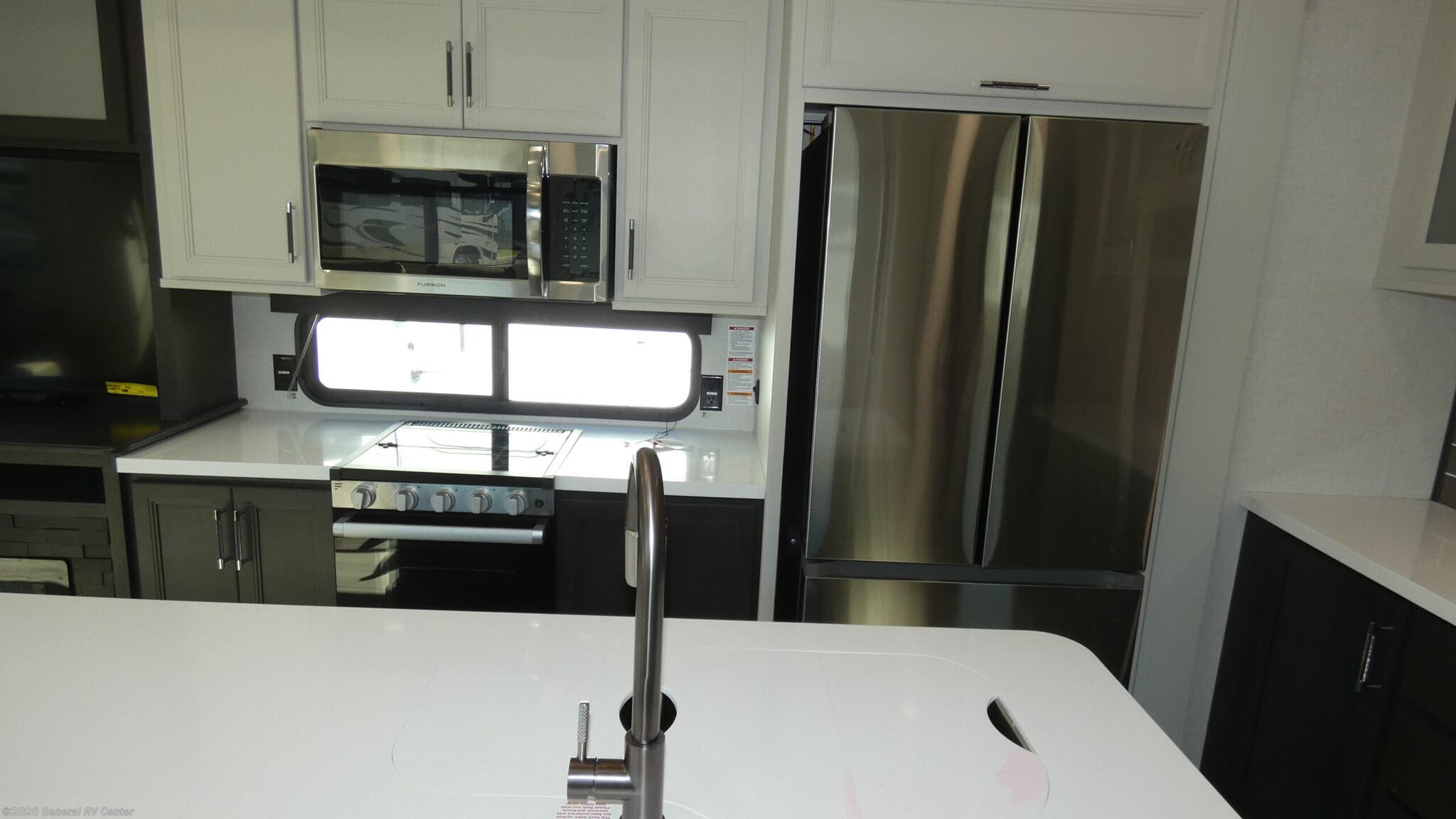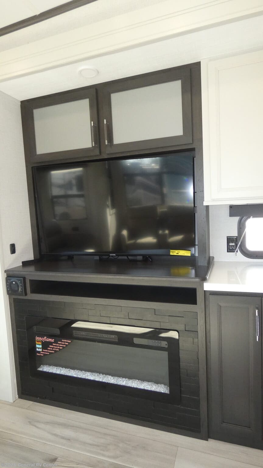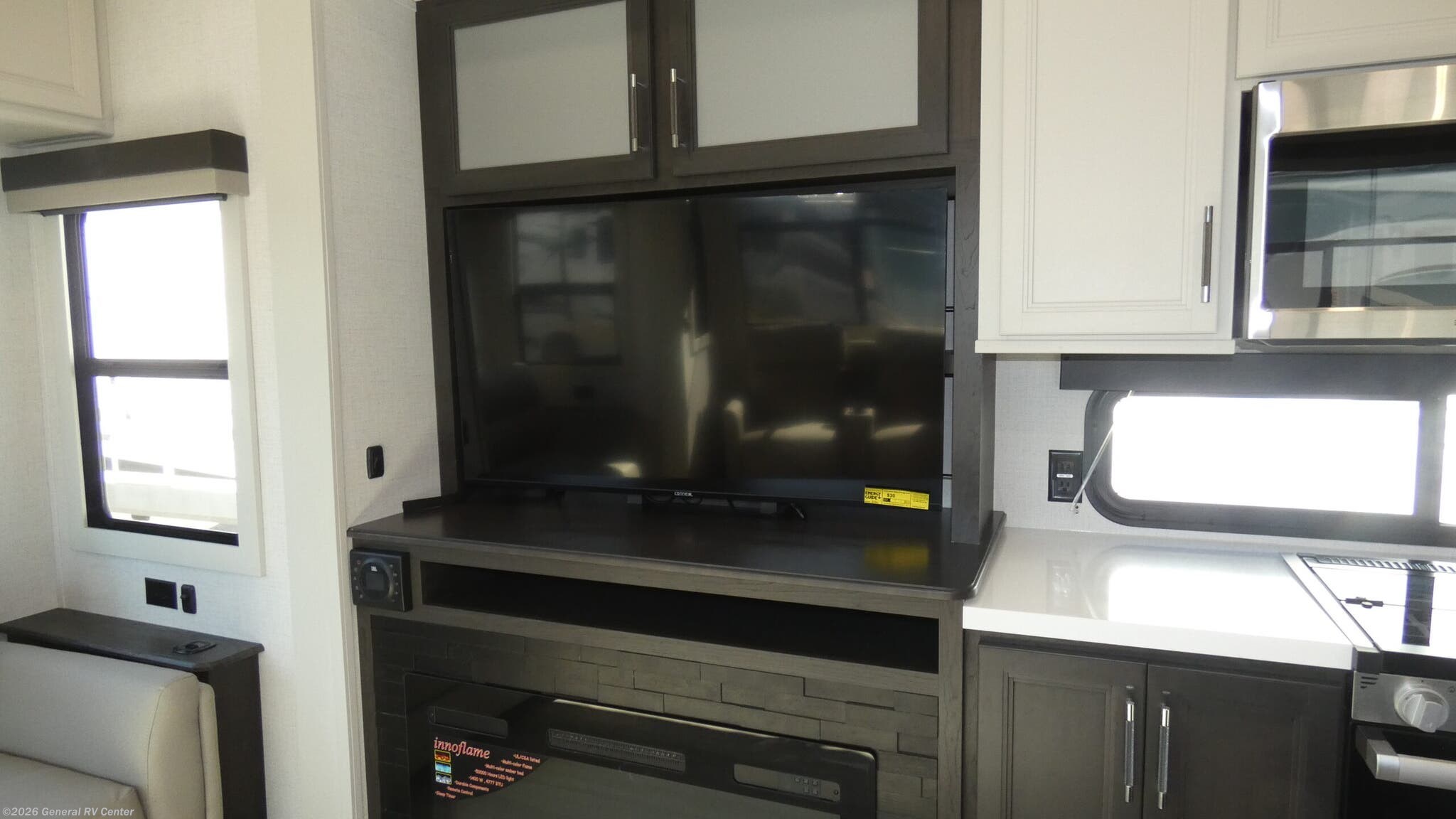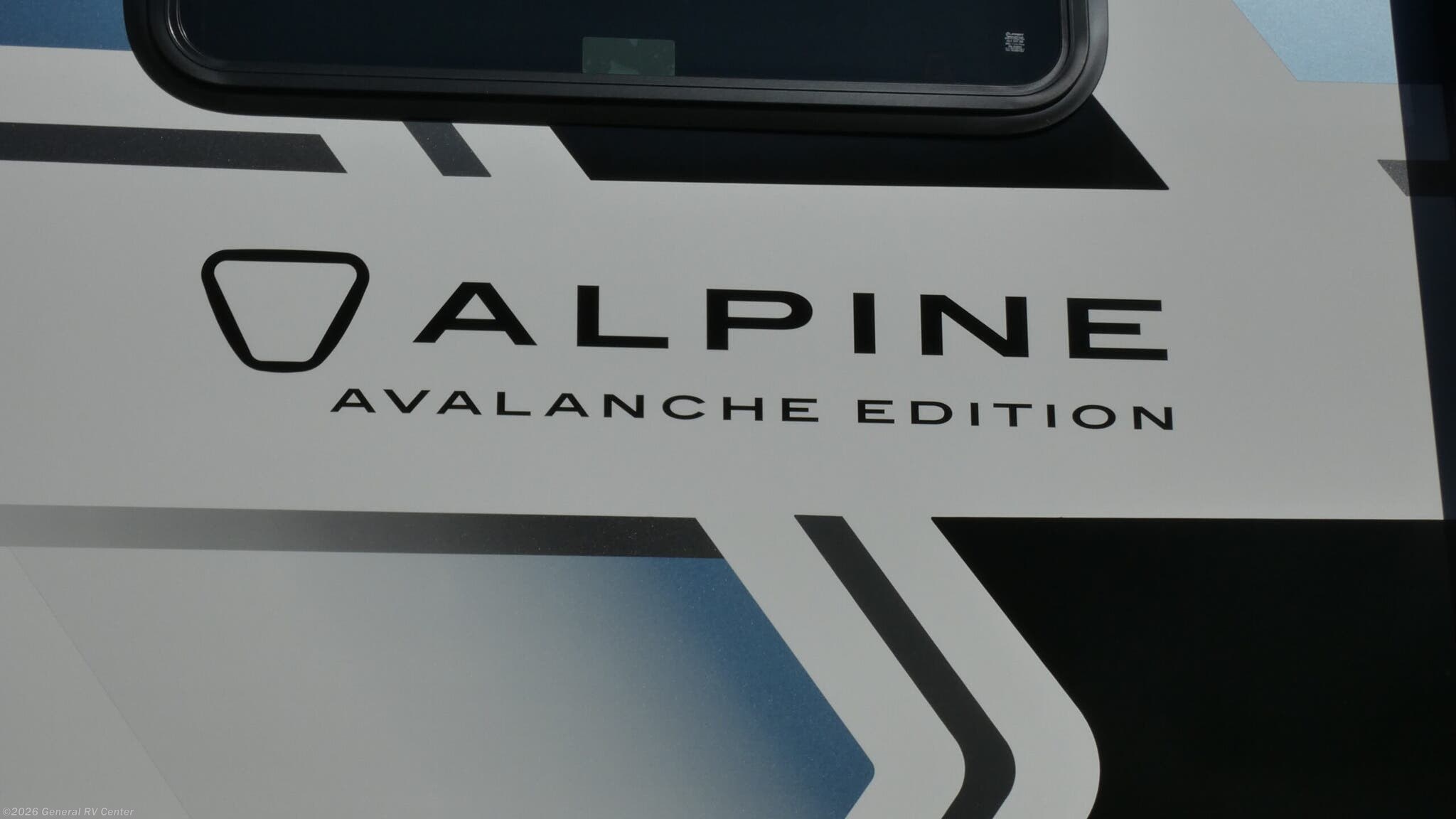 Keystone Alpine Avalanche Edition fifth wheel 321RL highlights: King Bed Kitchen Island Fireplace Hide-a-Bed Sleeper Theater Seating For the couple that loves to travel, you will truly enjoy this spacious fifth wheel featuring triple slides with dual opposing in the main combined kitchen and living area. Here you can entertain friends, even overnight, thanks to the hide-a-bed sofa sleeper. A free standing dinette and four chairs makes dining feel like home, and you will love the spacious kitchen for cooking with a large center island including prep space next to the double sink. A side hutch offers space for dishes, or place for other small appliances to be left out. The master bedroom is just beyond the spacious bath on your left up the steps and behind a space saving sliding barn style door. You will sleep comfortably on the king bed that slides out to provide even more floor space for getting dressed, and there is also a prepped area for adding a stackable washer and dryer if you choose. The bath provides a large shower and vanity with dual sinks so two can easily get ready at once! With any Keystone luxury Alpine Avalanche Edition fifth wheel, you will experience wide-body construction that allows you to stretch out and stay awhile during any season thanks to the Polar Pack All Season Protection that includes a heated and enclosed underbelly, an Astro foil reflective layer on the roof, front and rear walls, and two static attic vents, plus more! The interior offers hardwood slide out fascia with wood accents, designer upholstered window valances with custom wood window frame, plus your choice of modern interior design. There are many more Keystone exclusives, like the Tru-Fit slide construction, the in-floor heating ducts, KeyTV™, and much more to bring you a full-packed, luxury fifth wheel!