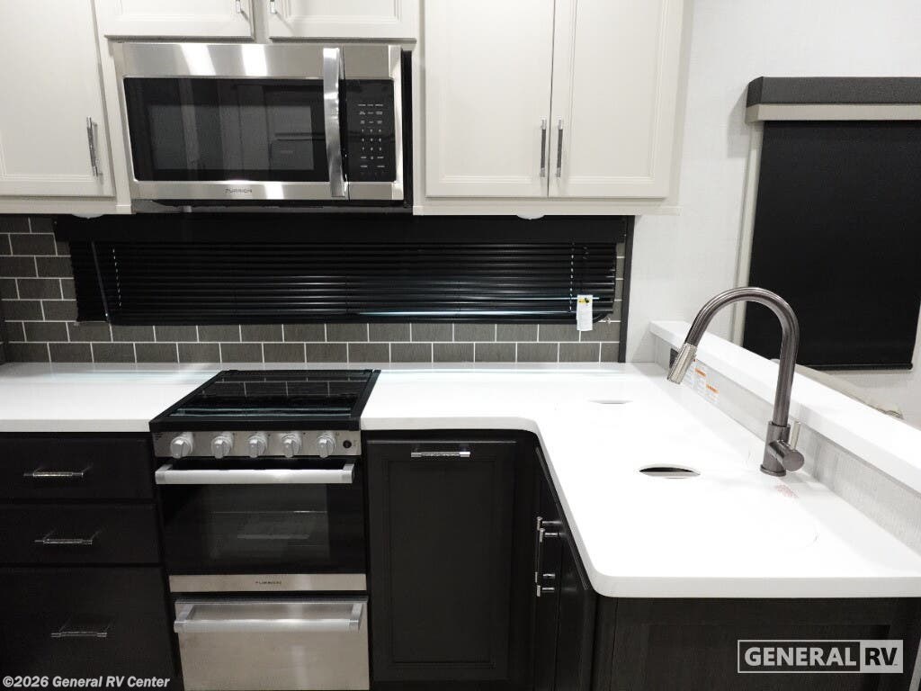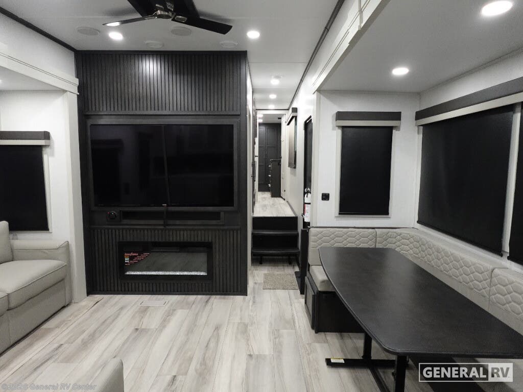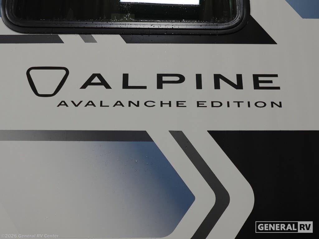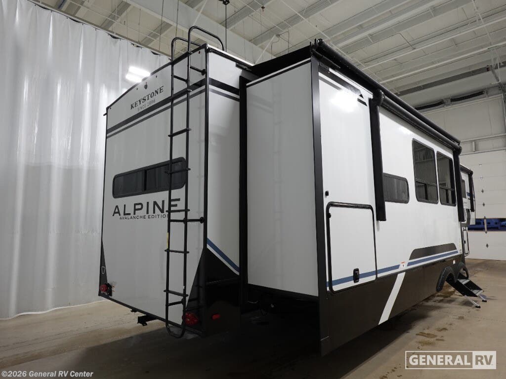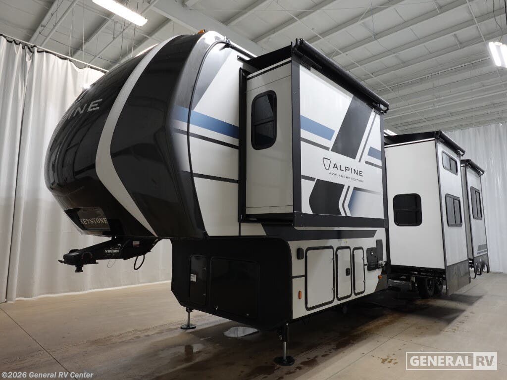 Keystone Alpine Avalanche Edition fifth wheel 379MB highlights: U-Shaped Dinette Middle Bunkhouse Shower with a Seat Four Slides Bedroom Master Closet Fireplace The whole gang will love camping in this fifth wheel since there is space for everyone! A front master bedroom includes a king bed slide out, master closet, and stackable washer and dryer prep if you choose to go full-time. Your guests or little ones will love the middle bunkhouse with a flip bunk above a hide-a-bed sofa, along with a pull-out table and storage space. Everyone can meet in the living area which features dual opposing slides for more space, theater seating, a sleeper sofa, and a U-shaped dinette, providing even more sleeping space. And check out the rear kitchen with its wrap-around counter space, Furrion appliances, and large pantry to keep snacks stocked! With any Keystone luxury Alpine Avalanche Edition fifth wheel, you will experience wide-body construction that allows you to stretch out and stay awhile during any season thanks to the Polar Pack All Season Protection that includes a heated and enclosed underbelly, an Astro foil reflective layer on the roof, front and rear walls, and two static attic vents, plus more! The interior offers hardwood slide out fascia with wood accents, designer upholstered window valances with custom wood window frame, plus your choice of modern interior design. There are many more Keystone exclusives, like the Tru-Fit slide construction, the in-floor heating ducts, KeyTV™, and much more to bring you a full-packed, luxury fifth wheel!