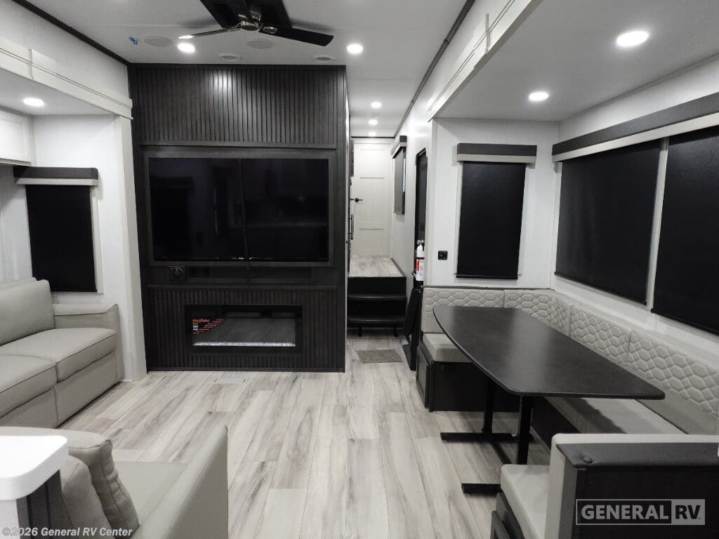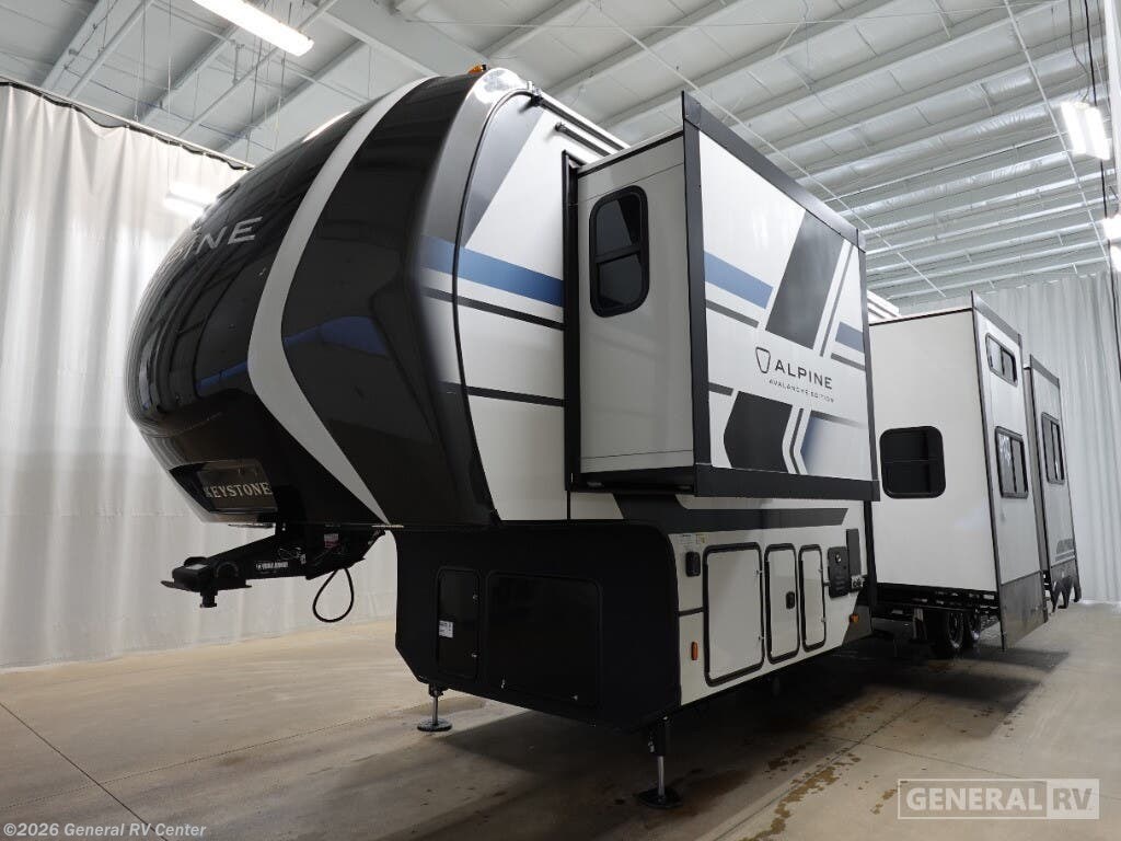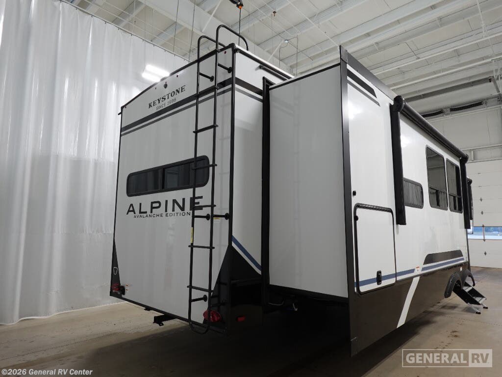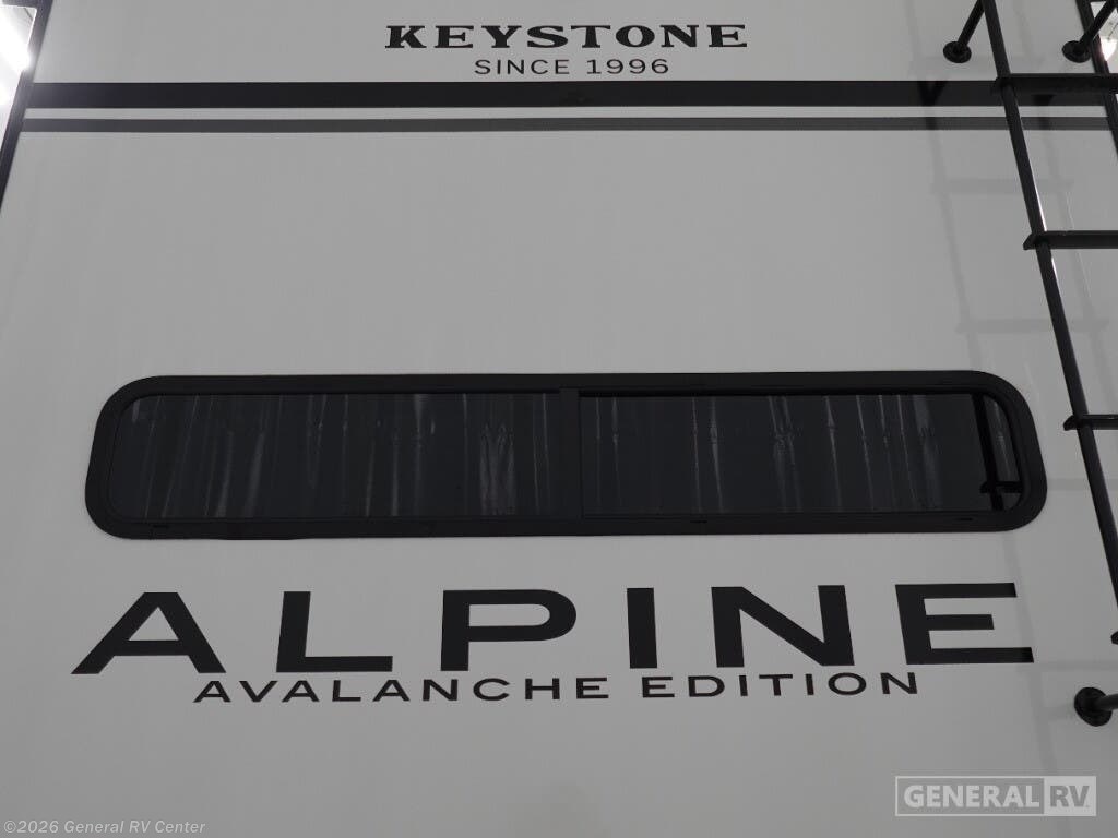**Keystone Alpine Avalanche Edition fifth wheel 379MB highlights:** - U-Shaped Dinette - Middle Bunkhouse - Shower with a Seat - Four Slides - Bedroom Master Closet - Fireplace The whole gang will love camping in this fifth wheel since there is space for everyone! A front master bedroom includes a king bed slide out, master closet, and stackable washer and dryer prep if you choose to go full-time. Your guests or little ones will love the middle bunkhouse with a flip bunk above a hide-a-bed sofa, along with a pull-out table and storage space. Everyone can meet in the living area which features dual opposing slides for more space, theater seating, a sleeper sofa, and a U-shaped dinette, providing even more sleeping space. And check out the rear kitchen with its wrap-around counter space, Furrion appliances, and large pantry to keep snacks stocked! With any Keystone luxury Alpine Avalanche Edition fifth wheel, you will experience wide-body construction that allows you to stretch out and stay awhile during any season thanks to the Polar Pack All Season Protection that includes a heated and enclosed underbelly, an Astro foil reflective layer on the roof, front and rear walls, and two static attic vents, plus more! The interior offers hardwood slide out fascia with wood accents, designer upholstered window valances with custom wood window frame, plus your choice of modern interior design. There are many more Keystone exclusives, like the Tru-Fit slide construction, the in-floor heating ducts, KeyTV™, and much more to bring you a full-packed, luxury fifth wheel!