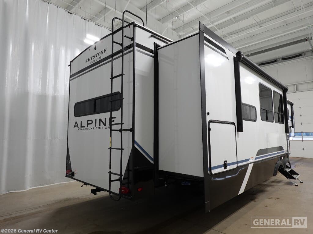 **Keystone Alpine Avalanche Edition fifth wheel 379MB highlights:** - U-Shaped Dinette - Middle Bunkhouse - Shower with a Seat - Four Slides - Bedroom Master Closet - Fireplace The whole gang will love camping in this fifth wheel since there is space for everyone! A front master bedroom includes a king bed slide out, master closet, and stackable washer and dryer prep if you choose to go full-time. Your guests or little ones will love the middle bunkhouse with a flip bunk above a hide-a-bed sofa, along with a pull-out table and storage space. Everyone can meet in the living area which features dual opposing slides for more space, theater seating, a sleeper sofa, and a U-shaped dinette, providing even more sleeping space. And check out the rear kitchen with its wrap-around counter space, Furrion appliances, and large pantry to keep snacks stocked! With any Keystone luxury Alpine Avalanche Edition fifth wheel, you will experience wide-body construction that allows you to stretch out and stay awhile during any season thanks to the Polar Pack All Season Protection that includes a heated and enclosed underbelly, an Astro foil reflective layer on the roof, front and rear walls, and two static attic vents, plus more! The interior offers hardwood slide out fascia with wood accents, designer upholstered window valances with custom wood window frame, plus your choice of modern interior design. There are many more Keystone exclusives, like the Tru-Fit slide construction, the in-floor heating ducts, KeyTV™, and much more to bring you a full-packed, luxury fifth wheel!