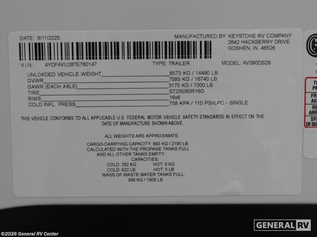 Request More Info on this 2026 Keystone Avalanche 390DS Offered for sale by General RV Center