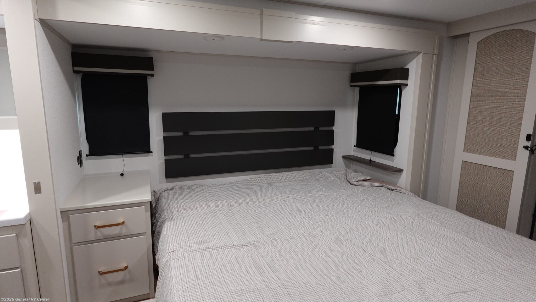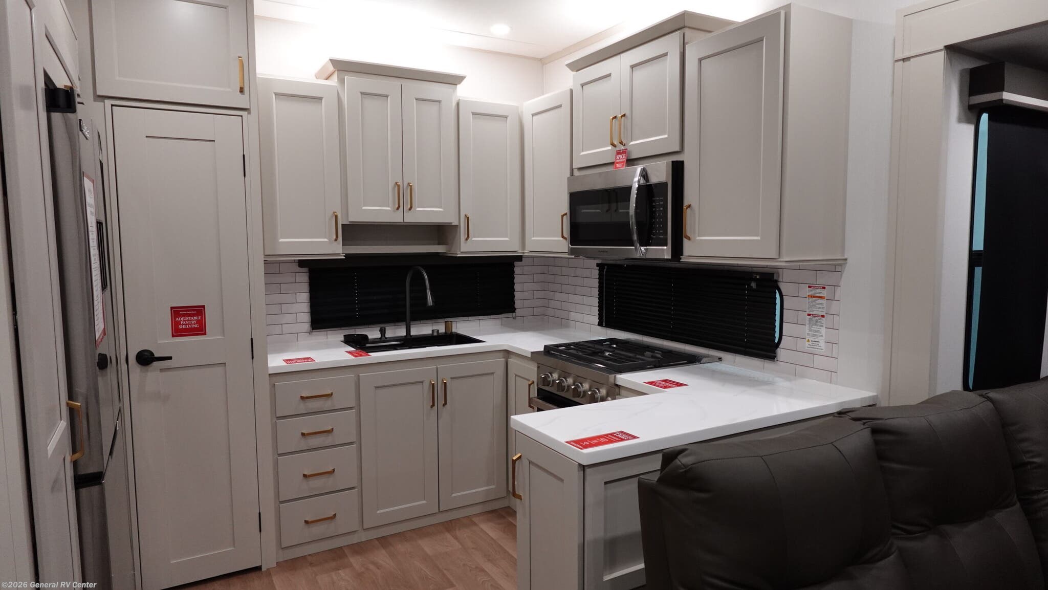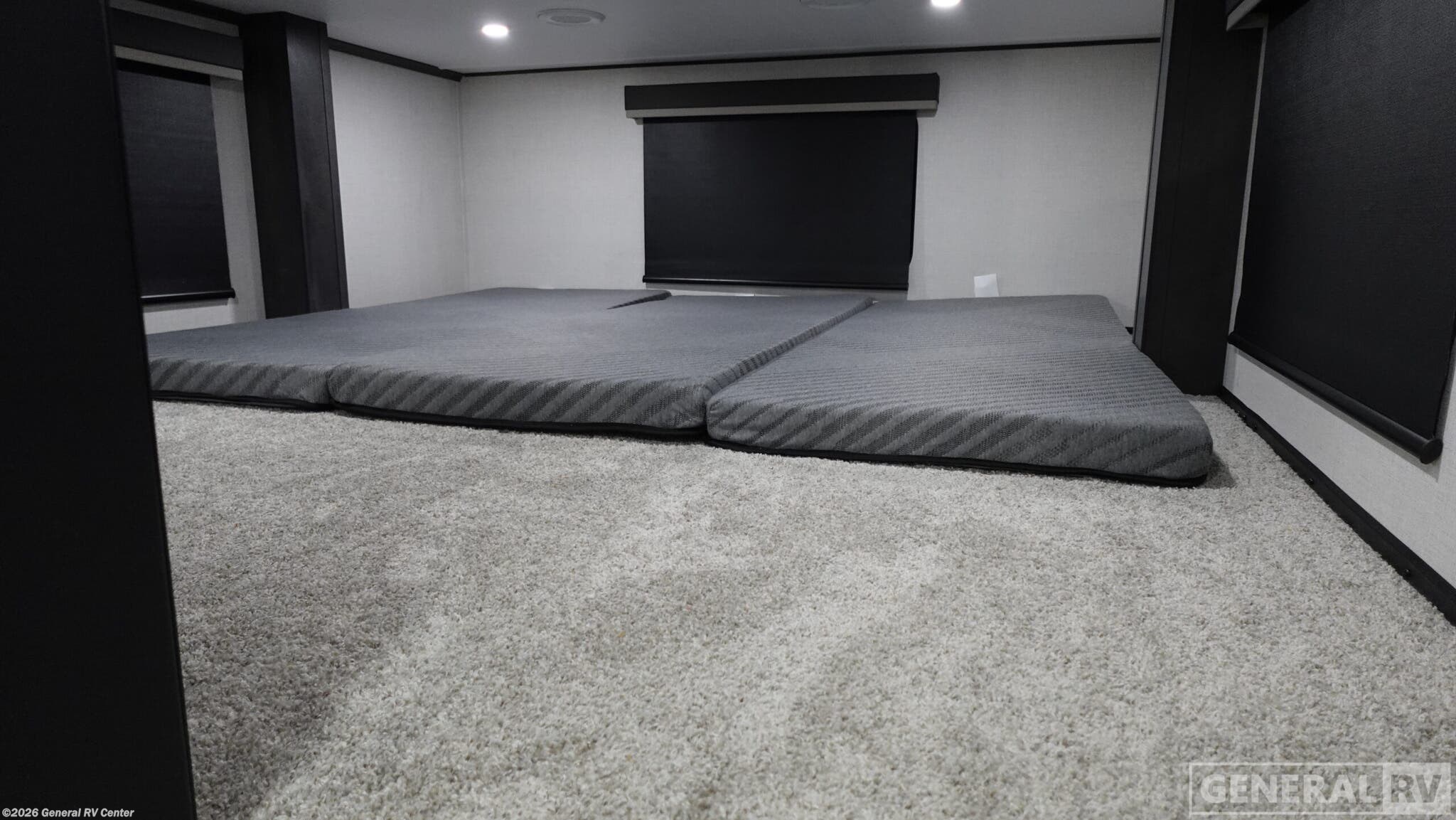 Discover the 2026 Keystone Avalanche 390DS, a remarkable fifth wheel designed to elevate your adventures. At nearly 43 feet in length, this spacious RV offers an inviting retreat for families and friends, comfortably sleeping up to seven. The dual suite design features a luxurious king bed in the master suite and a cozy queen bed in the secondary suite, each with ample storage underneath. The bunkhouse with three bunks ensures everyone has their own space, making it perfect for larger families or group getaways. The heart of this RV lies in its thoughtfully designed living and kitchen areas. Imagine preparing meals in the center kitchen, equipped with a full-size electric refrigerator and a three-burner cooktop, while the adjacent living area offers theater seating for relaxation. Enjoy evenings by the fireplace or gather around the freestanding dinette for meals and games. The dual awnings extend your living space outdoors, providing shade and comfort for al fresco dining or simply enjoying nature. With a generous fresh water capacity of 75 gallons and dual gray and black tanks, extended stays are a breeze. The Avalanche 390DS is also prepped for a washer and dryer, adding convenience for longer journeys. Whether you're parked at a scenic campsite or exploring new destinations, this RV is your home on wheels, offering comfort and style. For more details, visit your nearest General RV dealership and step into a world of adventure with the Keystone Avalanche 390DS.