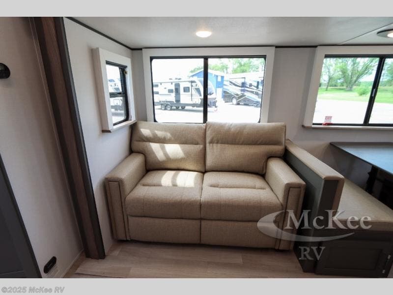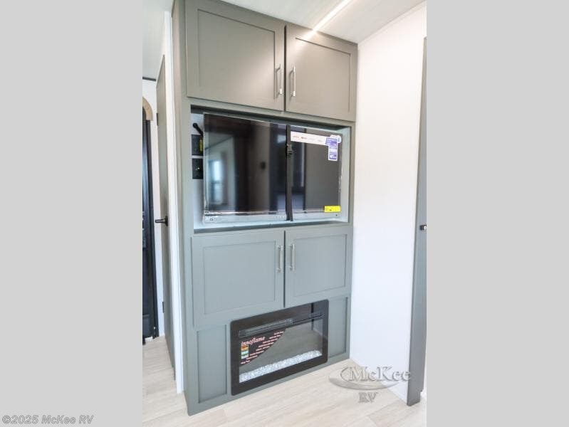 It won't be hard to feel right at home in this dual entry, front kitchen travel trailer! You will be impressed by the amount of counter space you have, along with a two kitchen pantries, a three burner range, and a 10 cu. ft. refrigerator. A Do-More dinette table and tri-fold sofa sit within a slide for more space, and the entertainment center with a fireplace is in great viewing for movie night. This model includes a dual entry bath with quick and easy access into the rear master bedroom, complete with a king bed slide out and a large wardrobe!