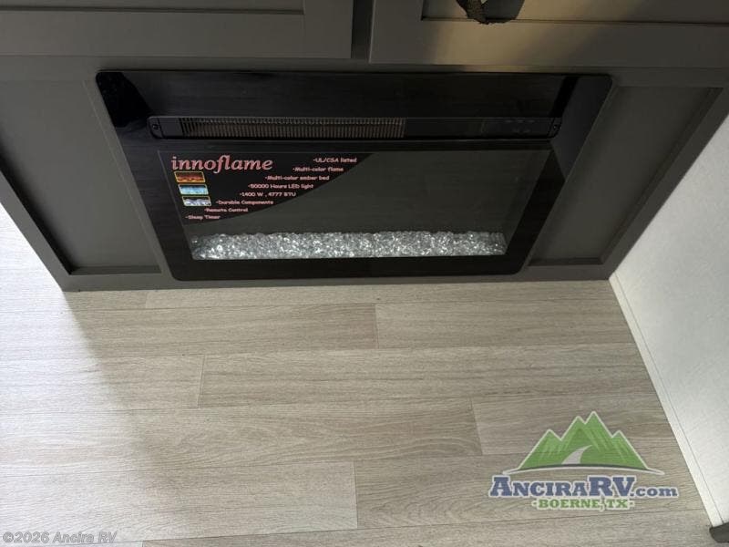 It won't be hard to feel right at home in this dual entry, front kitchen travel trailer! You will be impressed by the generous amount of solid surface countertops, along with an entryway pantry, a three burner range, and a 10 cu. ft. refrigerator. A Do-More dinette table and tri-fold sofa sit within a slide for more space, and the entertainment center with a fireplace is in great viewing for movie night. A walk-thru bath leads to the rear master bedroom, complete with a king bed slide, hanging storage, a wardrobe, and a dresser for ample storage space