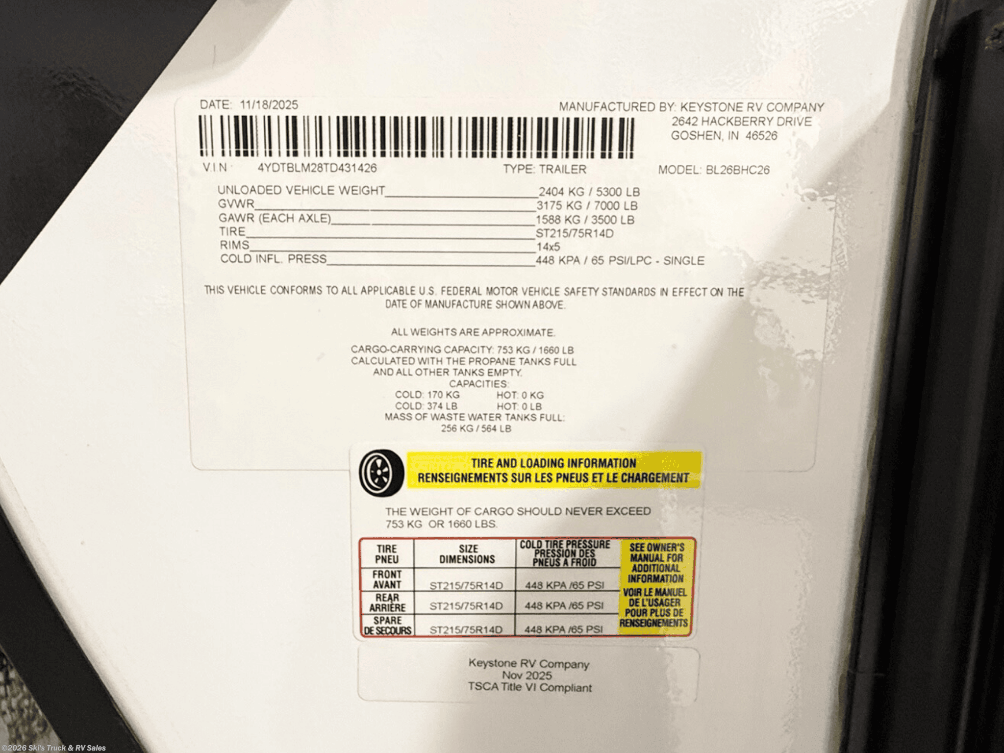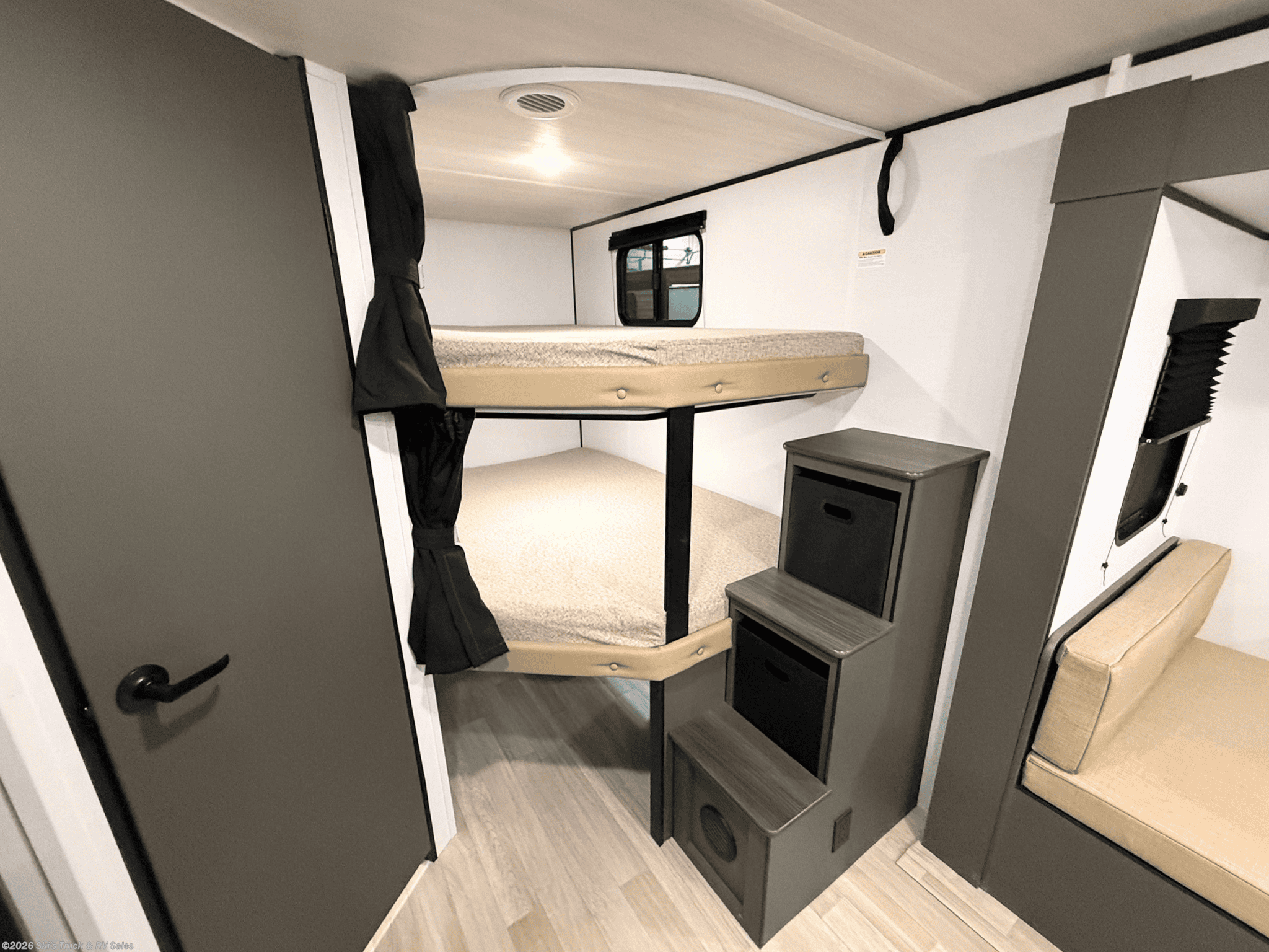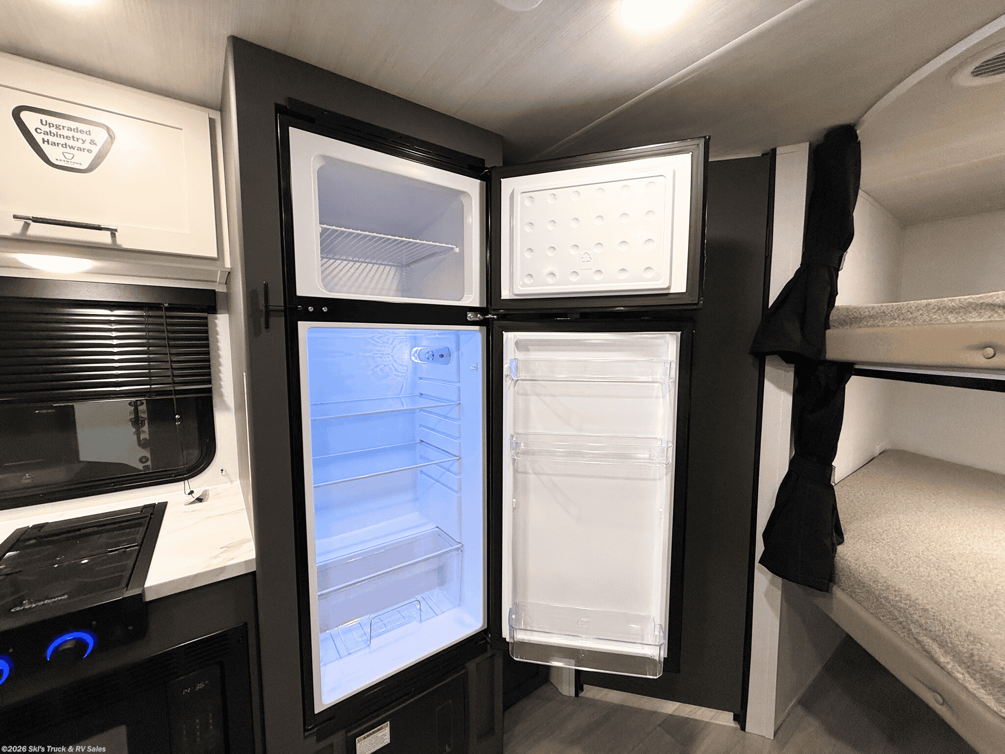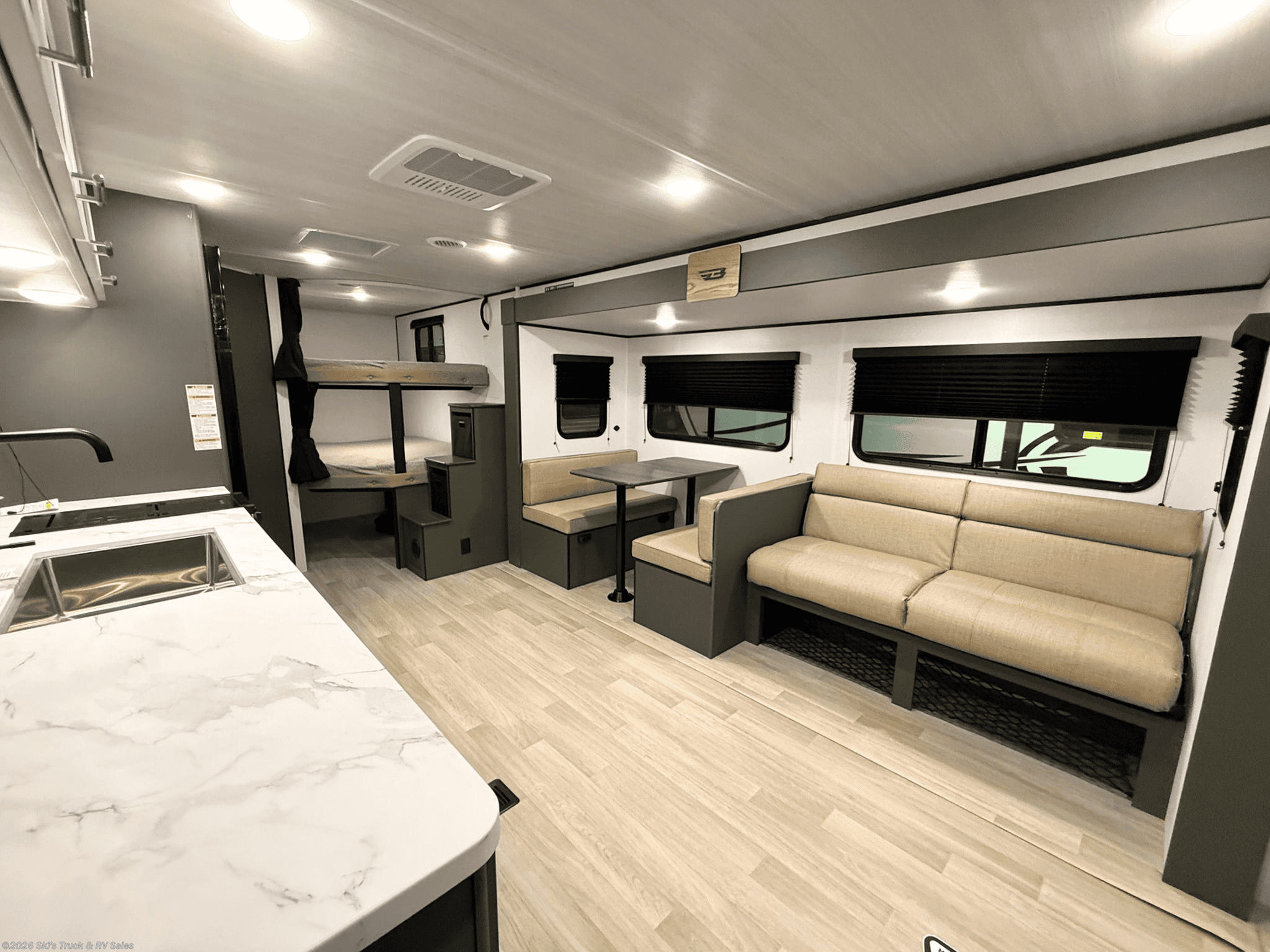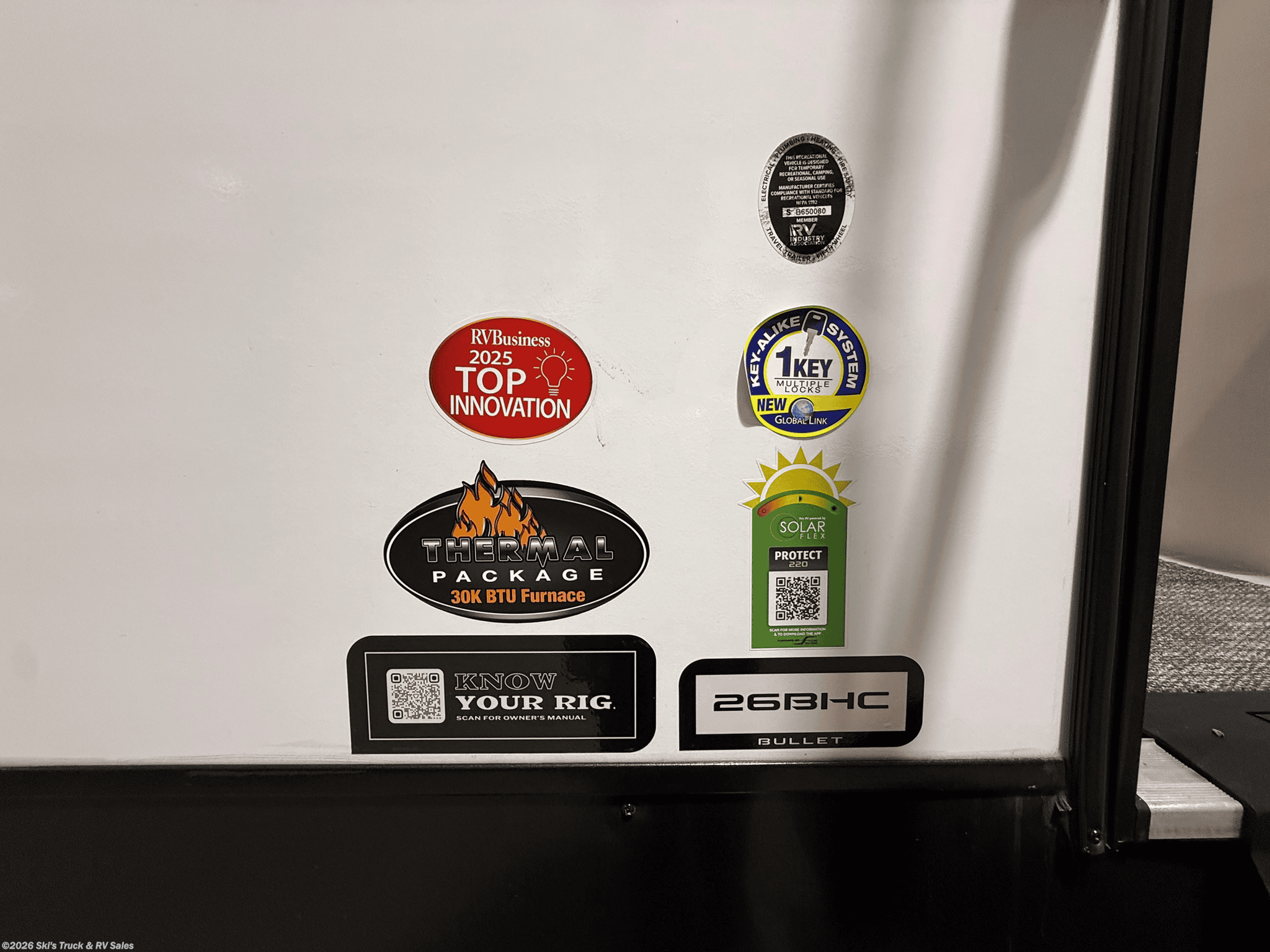 2026 Keystone Bullet 26BHC Bunkhouse Travel Trailer; 27 Foot; 1 Slide; Sleeps 8-10; Hitch Weight: 580 Lbs.; Dry Weight: 5300 Lbs.; 50 Amp; Power Tongue Jacks; Manual Stabilizer Jacks; 45 Gal. Fresh Water Cap.; 34 Gal. Black Water Cap.; 34 Gal. Gray Water Cap.; Two 20 Lbs. Propane Tanks; 15,000 BTU AC (Wired for Second AC); 30,000 BTU Furnace; 8 C.F. (12V) Refrigerator; On Demand Water Heater; Convection Microwave; 2-Burner Stove; Two TV Jacks; 32 In. TV; Pantry; Stainless Steel Sink; Booth Dinette; Jack-knife Sofa; Queen Bed; Twin Bunks; One Bathroom with Shower; 21 Foot Power Awning with LED Lights; Backup Camera Prep.; Solar Package; Outside Shower; Lots of Storage; Foldup Steps; Grab Handle; Key Alike System; Magnetic Door Holders; Battery Disconnect; Black Tank Flush; Climate Package; Fiberglass Sidewalls; Tinted Windows; Pleated Shades; Aluminum Wheels; Spare Tire; One Year Limited Warranty; Financing Available; Great Bunkhouse Travel Trailer for the Price: $28,995. Call Skis Truck & RV Sales at 765-344-1111 or visit us at for more information.