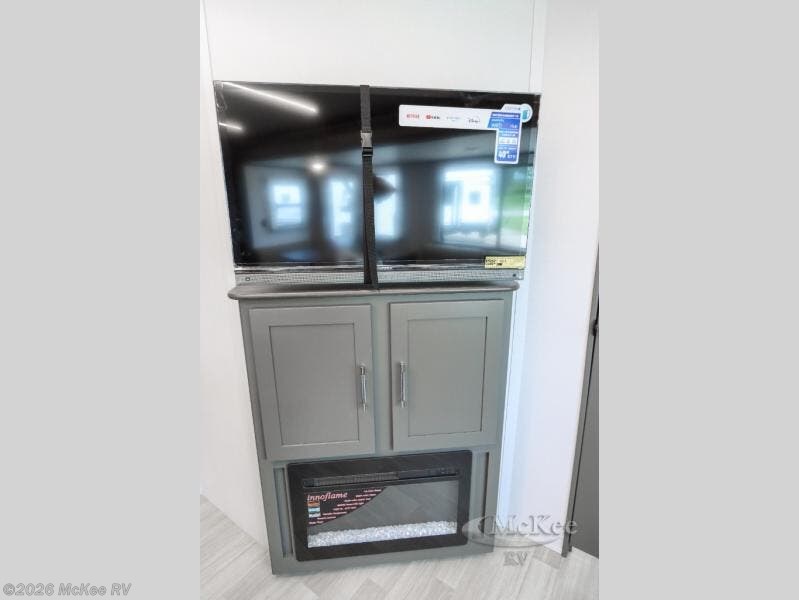 This travel trailer is one the whole gang will love! There is a rear private bunkhouse suite for your guests or the kids, plus a front master bedroom for you. The bunkhouse includes a tri-fold sofa with a flip-up bunk across from a second bunk, plus there is a half bath with its own exterior entry door! The full walk-through bath leads into the front bedroom where you'll find a queen bed, dual wardrobes and a laundry chute so you can throw clothes directly into the pass-through. A super slide in the combined living area and kitchen will provide ample space to move about, and you will find comfy seating on the tri-fold sofa and Do-More dinette table. There is even a fireplace and an entertainment center!