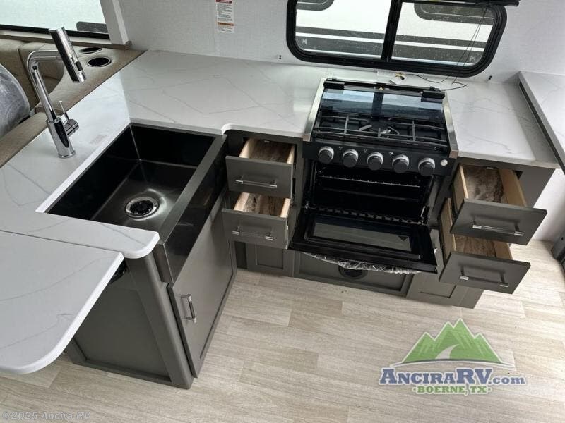 If you're looking for the perfect travel trailer to entertain guests, this is the one! The rear kitchen features a bartop with stools and a rear fold-down balcony where you can enjoy great outdoor views. The flip-up counter extension will provide the chef with more space to prep food, and there is a spacious refrigerator and pantry for food storage. Your crew can get comfy on the theater seating or L-shaped section sofa, and there is a 50" Smart TV and fireplace to make it a movie night! A full bath onboard lets you clean up after a day outdoors, and the front private bedroom with a king bed slide provides all the comfort you need. You'll also find two closets, washer and dryer prep, and a dresser with a flip-up top to keep your things neat and organized.
