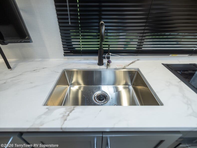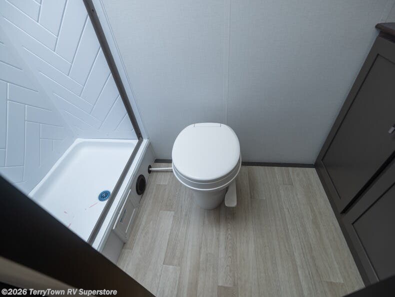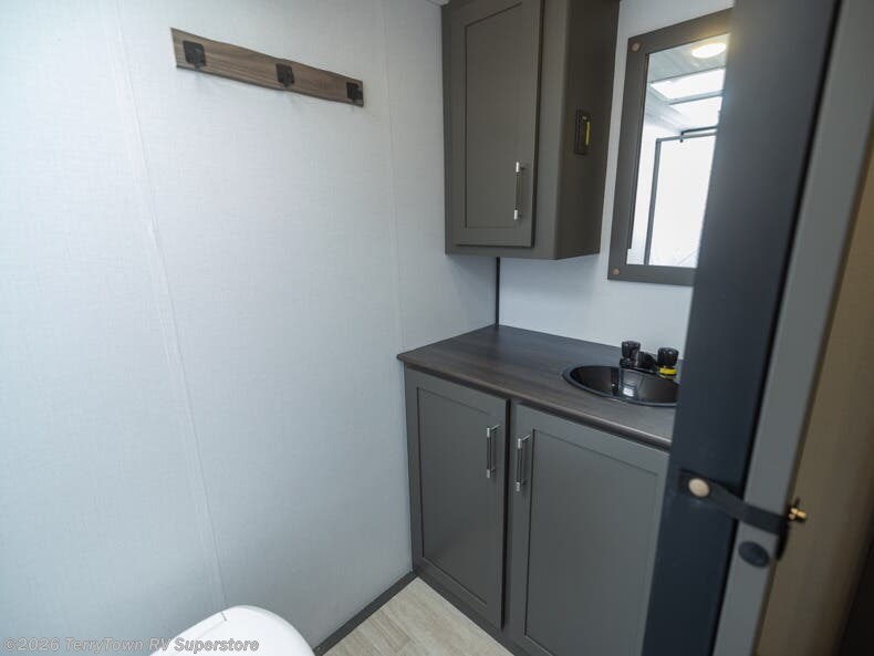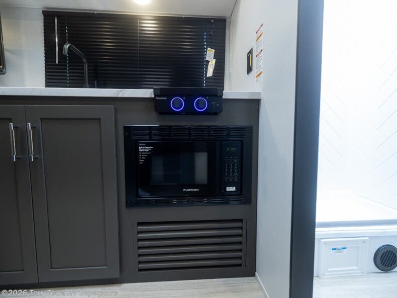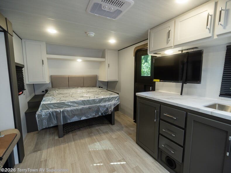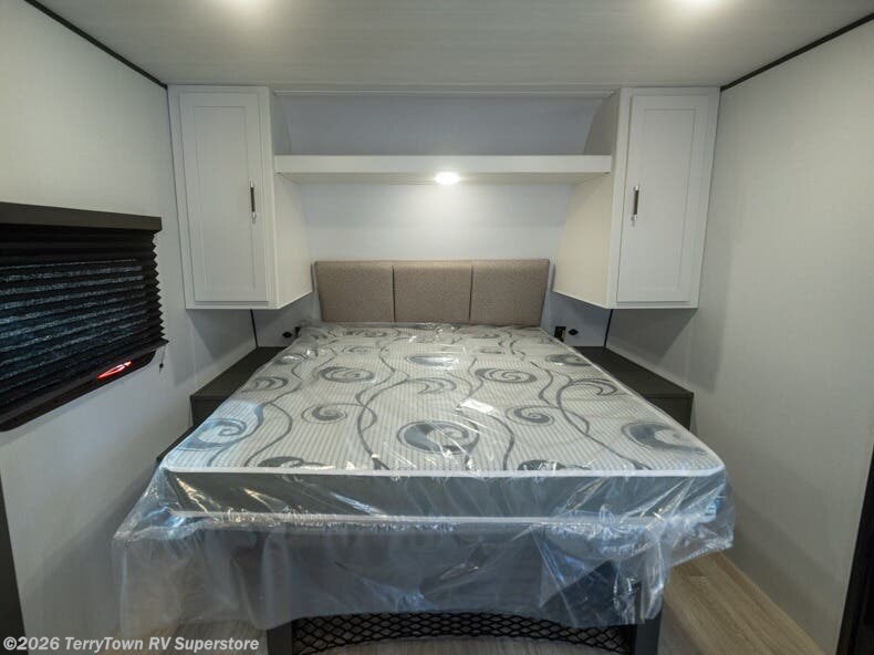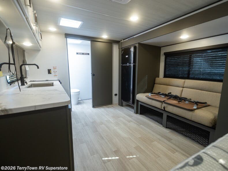 Designed for the modern adventurer, offering a stylish and functional space for couples and solo travelers, this travel trailer features a kitchen equipped with a refrigerator, a microwave for quick reheating and a two-burner cooktop for preparing delicious meals. Overhead cabinets provide ample storage for cookware and dishes. Further, the foldable table provides a convenient spot for meals and snacks, while the jackknife sofa offers a comfortable seating area that can be converted into a cozy sleeping space. The rear bathroom is thoughtfully designed and equipped with everything you need for a comfortable trip. And last but not least, the front bedroom boasts a plush queen-sized bed with spacious wardrobes on each side, providing plenty of storage for clothes and personal items.