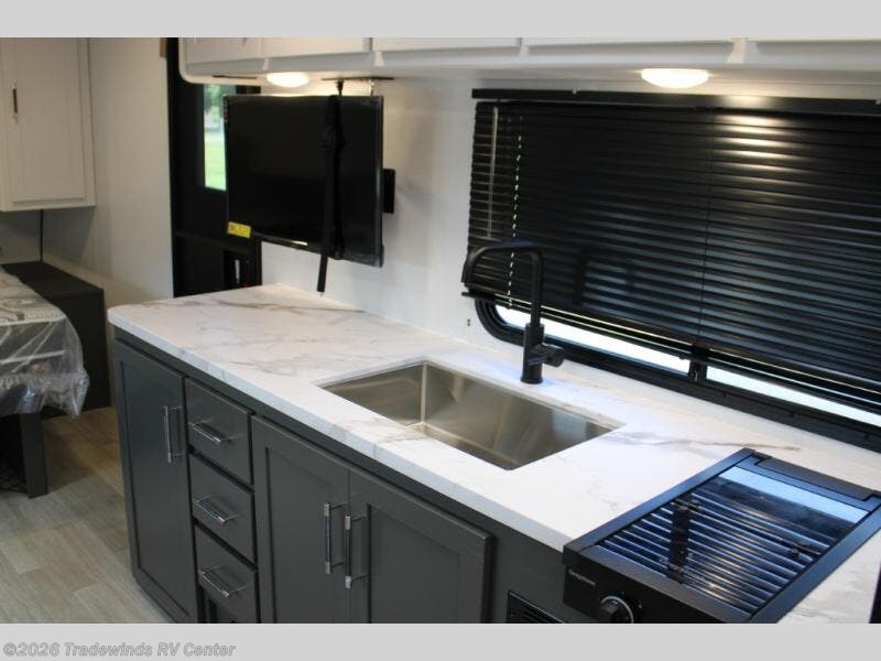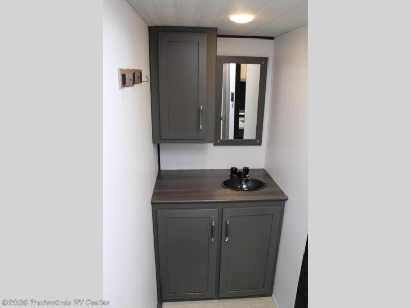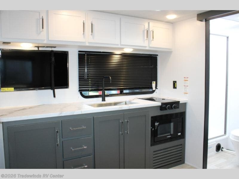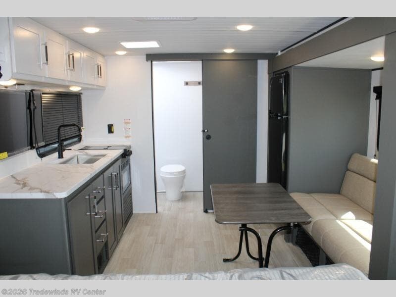 Designed for the modern adventurer, offering a stylish and functional space for couples and solo travelers, this travel trailer features a kitchen equipped with a refrigerator, a microwave for quick reheating and a two-burner cooktop for preparing delicious meals. Overhead cabinets provide ample storage for cookware and dishes. Further, the foldable table provides a convenient spot for meals and snacks, while the jackknife sofa offers a comfortable seating area that can be converted into a cozy sleeping space. The rear bathroom is thoughtfully designed and equipped with everything you need for a comfortable trip. And last but not least, the front bedroom boasts a plush queen-sized bed with spacious wardrobes on each side, providing plenty of storage for clothes and personal items.