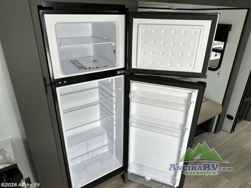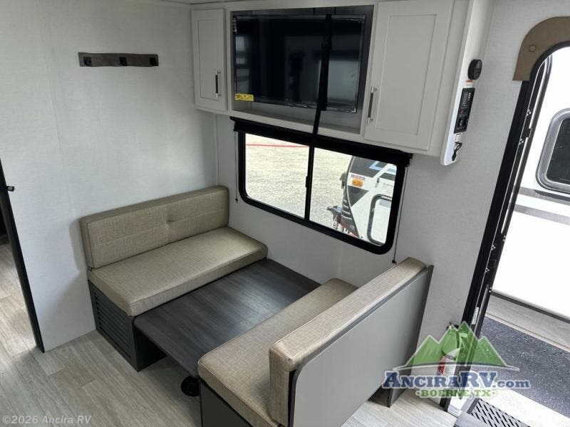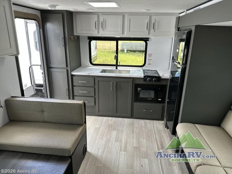 Perfect for road trips or camping excursions, this travel trailer is the safest bet! The rear kitchen is a highlight of the trailer, featuring a two-burner cooktop for preparing meals and a 12V refrigerator for keeping drinks and snacks fresh. Ample counter space and storage make meal prep a breeze. The booth dinette provides a cozy spot for meals and snacks, while the jackknife sofa offers a comfortable seating area that can be converted into a sleeping space. Enjoy your favorite shows on TV. In the heart of this RV, the walk-through bathroom is conveniently located and equipped with everything you need for a comfortable stay. And after a long day of adventures, sleep in the plush queen-sized bed and store all your personal items in the wardrobes and nightstands provided.